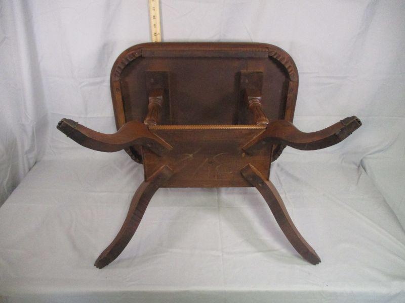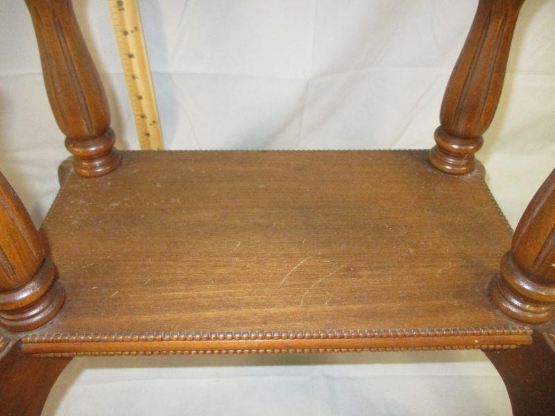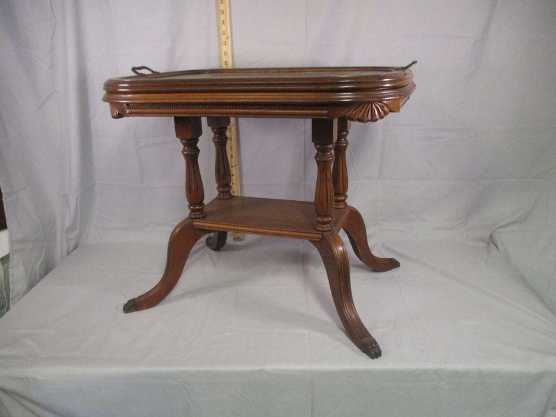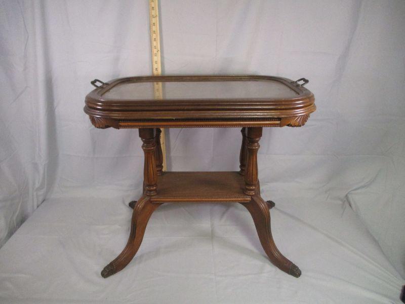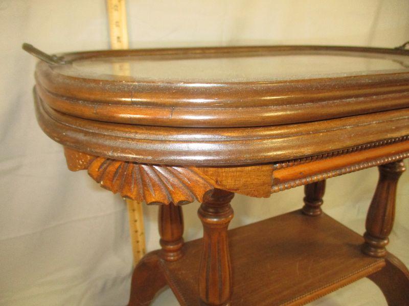 This table has beautiful detail (look at the beadwork) and I believe is from the Victorian Era. It is about 20" tall and 23" wide with the glass tray on it. The only issue that I found was that there is light water distress along the edge that the tray sits on the top. With the tray on top, it is not visible.