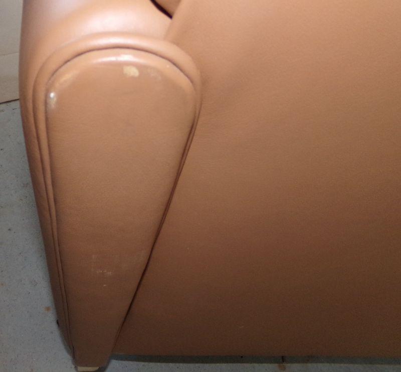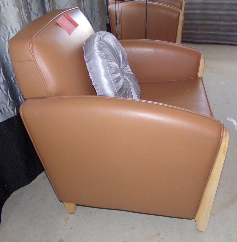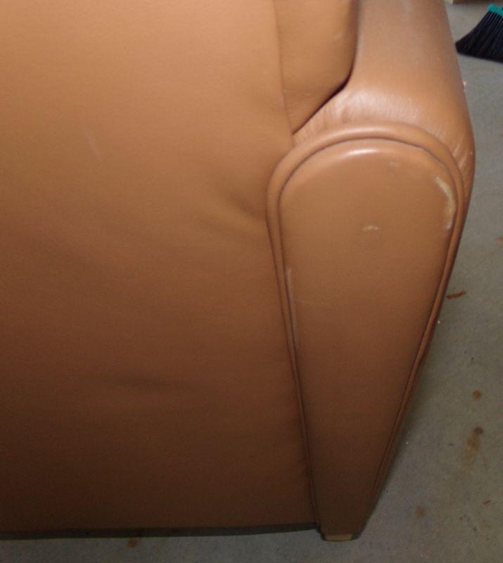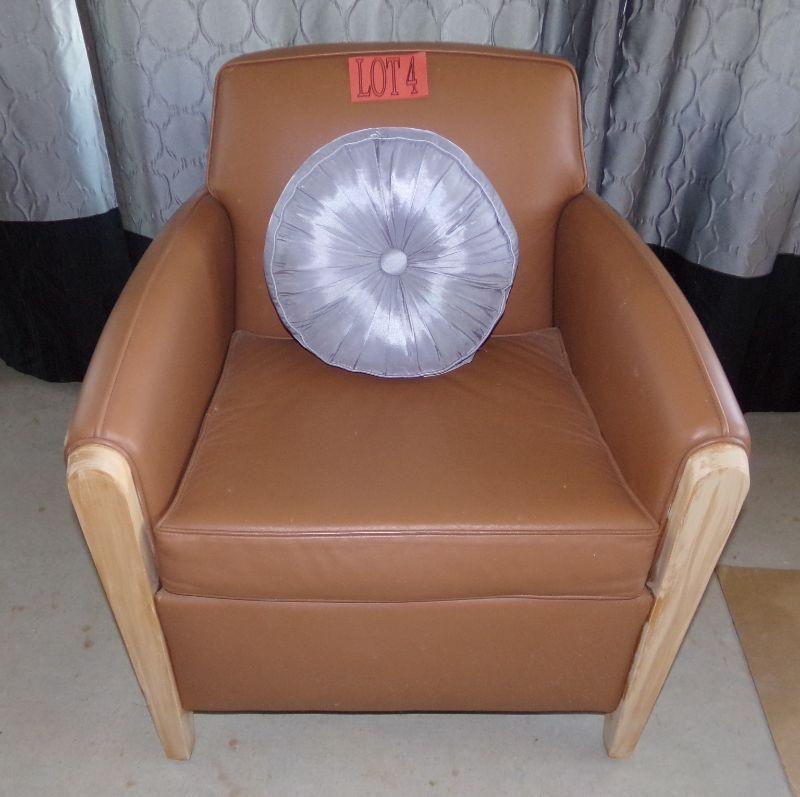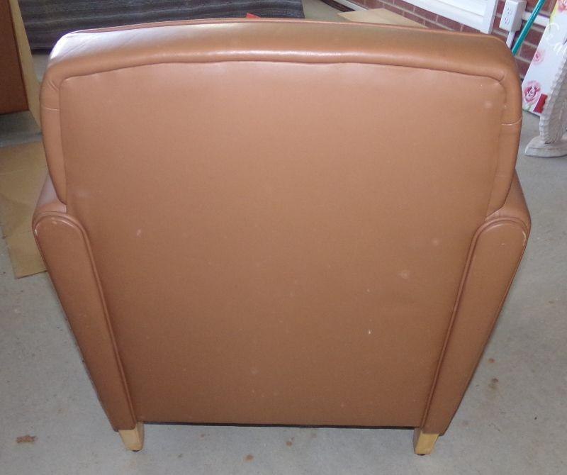 Faux leather chair with wooden accents on the front of the arms and the legs. There are 2 small areas on the back of chair that have been rubbed by the wall (see pics)