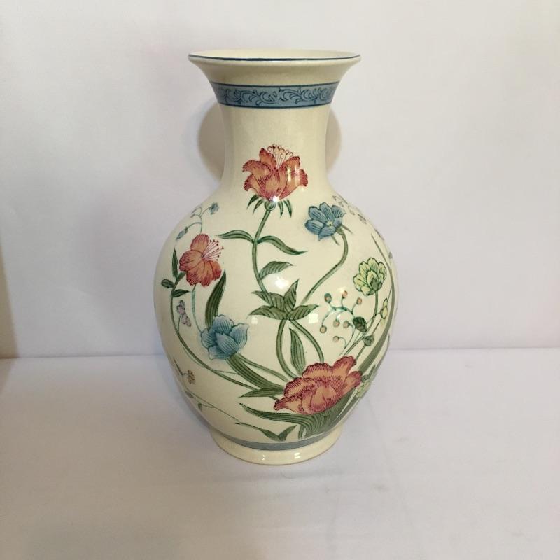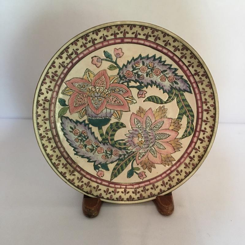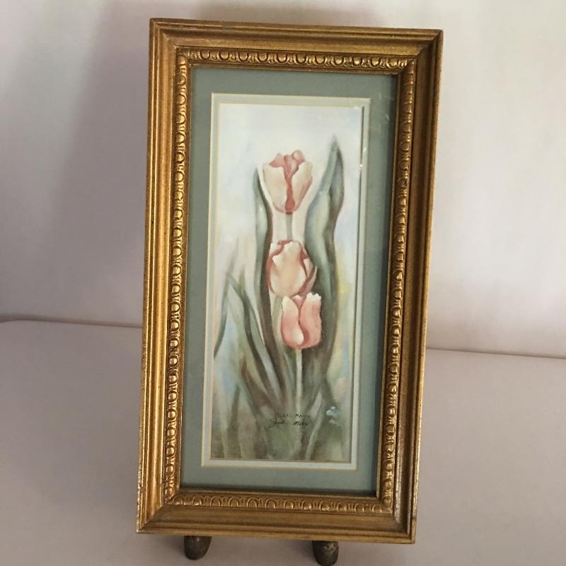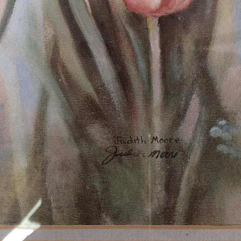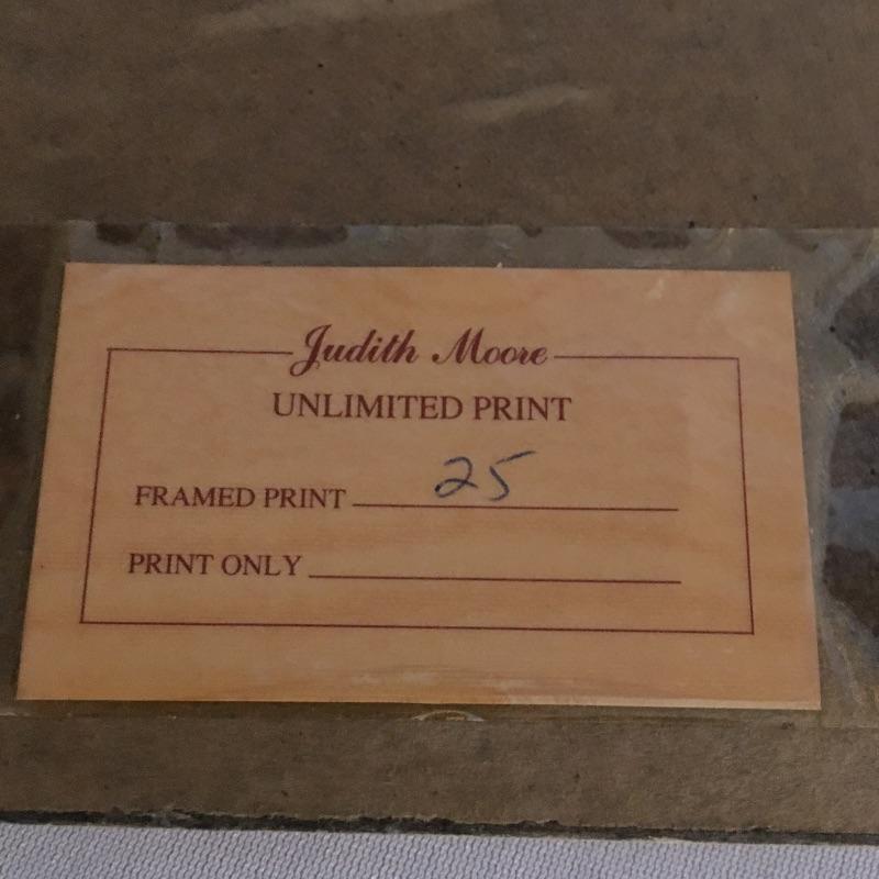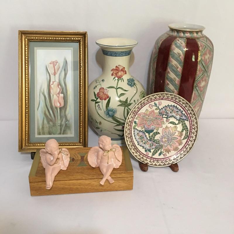 Asian art and more. Lot includes hand painted vase from Japan with Andrea by Sadek tag, vase and plate from China, inlaid wooden box from India, signed and framed print by Judith Moore and two small angels. A great lot to beautify your home. Largest vase measures 14.5” x 7”