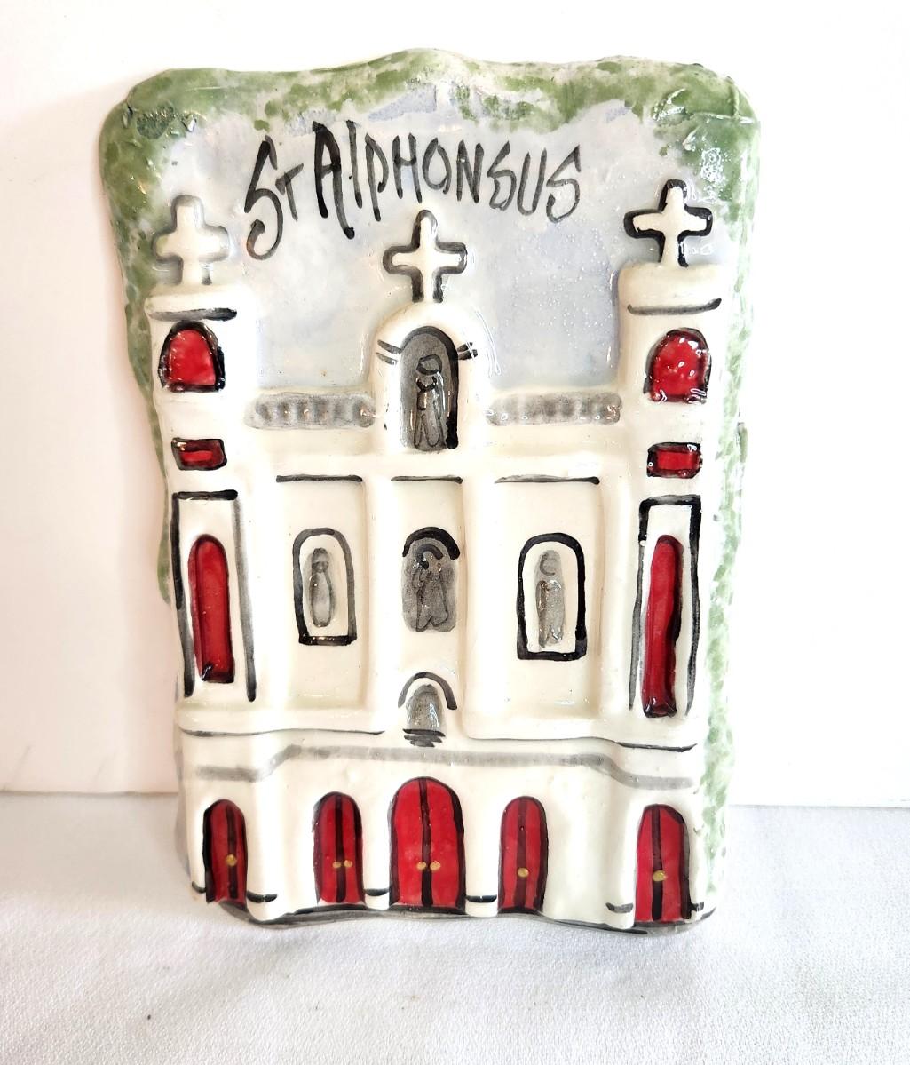 Clay Creations - this one not very common - St. Alphonsus Church in Irish Channel. 8" x 5.5". Note - there is no crack on this piece (just a pencil mark across the back). Good condition.
