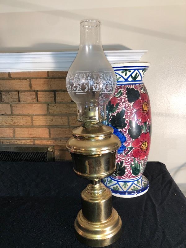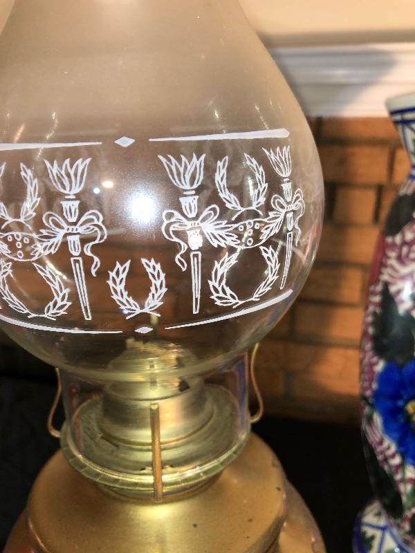 Tall Oil Lamp with etched hurricane glass - 22" tall