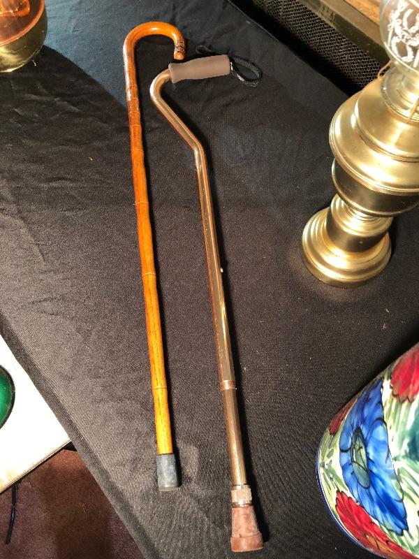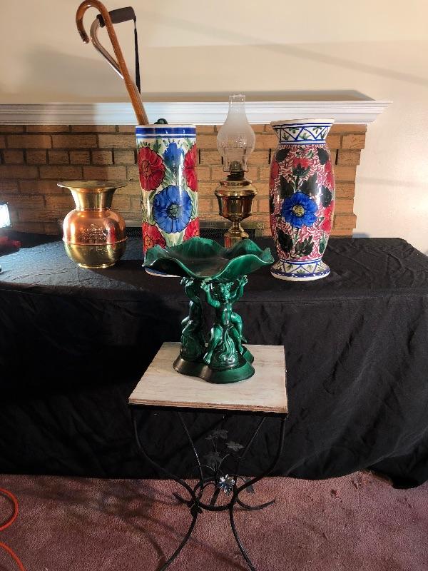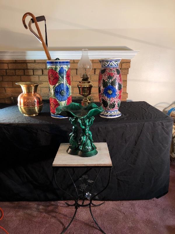 LOT 4 - Collection of Pottery, Oil Lamp, Canes, Small Table, Vase, Copper Urn/Vase