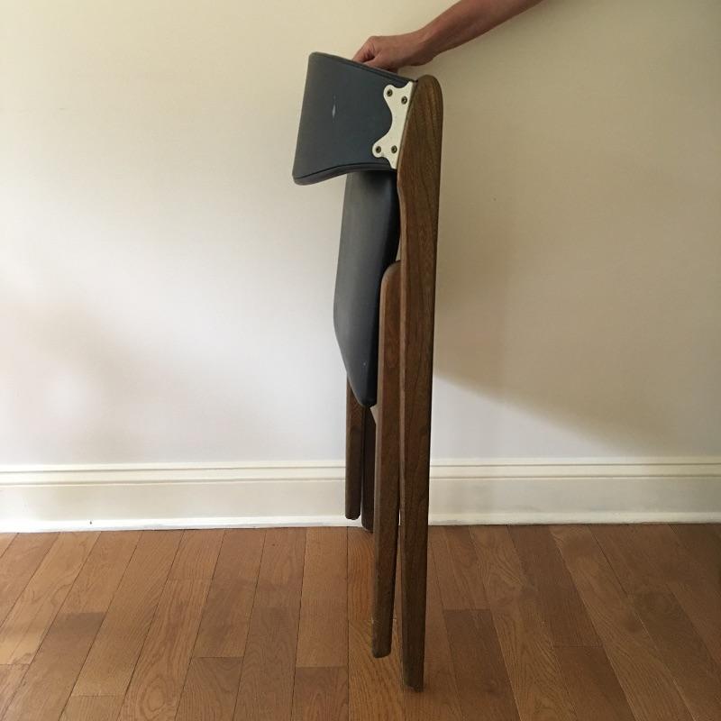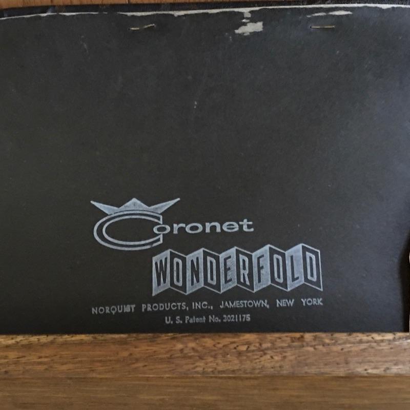 Four Coronet Wonderfold folding chairs with padded seat and backrest. These MCM chairs are in excellent shape and fold very easily. Two chairs have small tears in seat, see pictures. A great set of chairs for when guest arrive or use them everyday with there old school style. Chairs measure 20” x 20” x 30.5”.