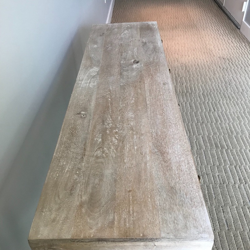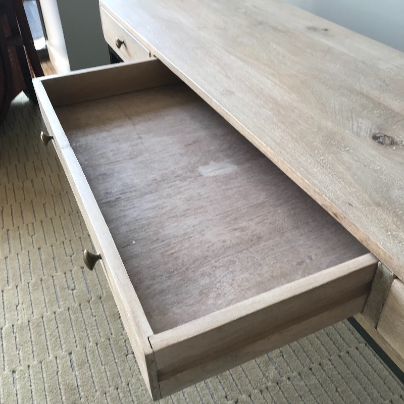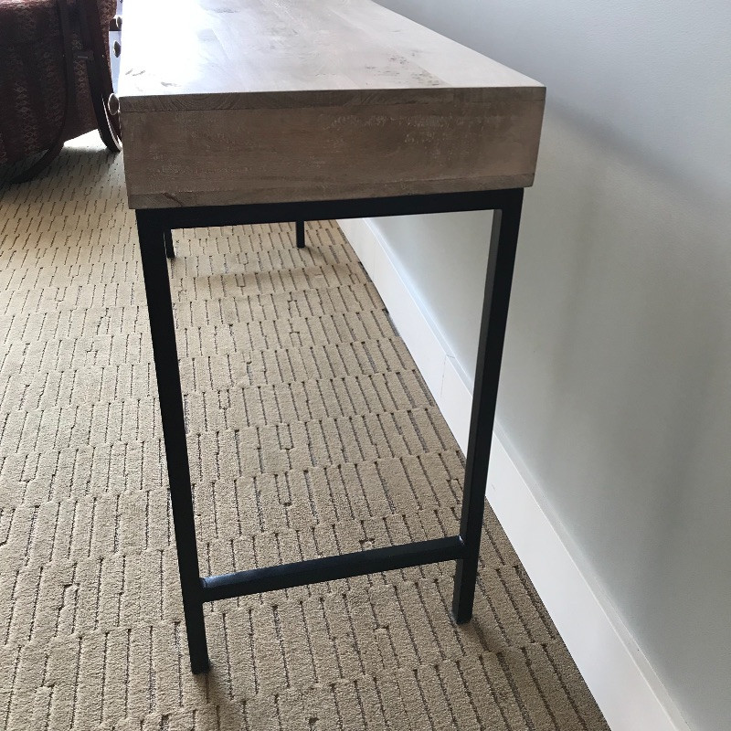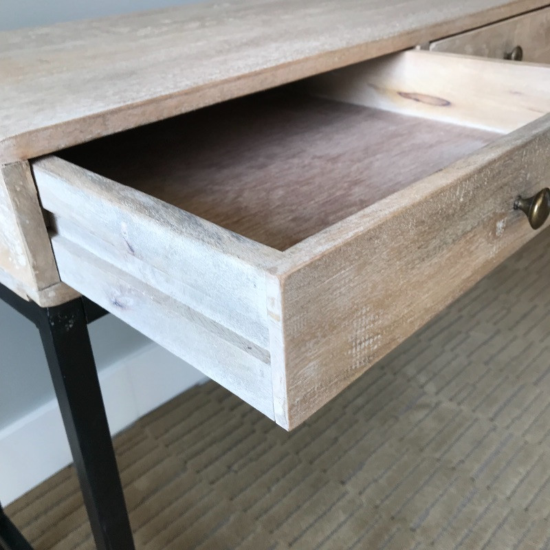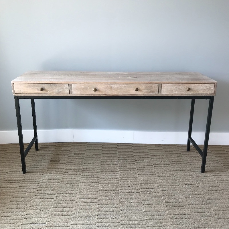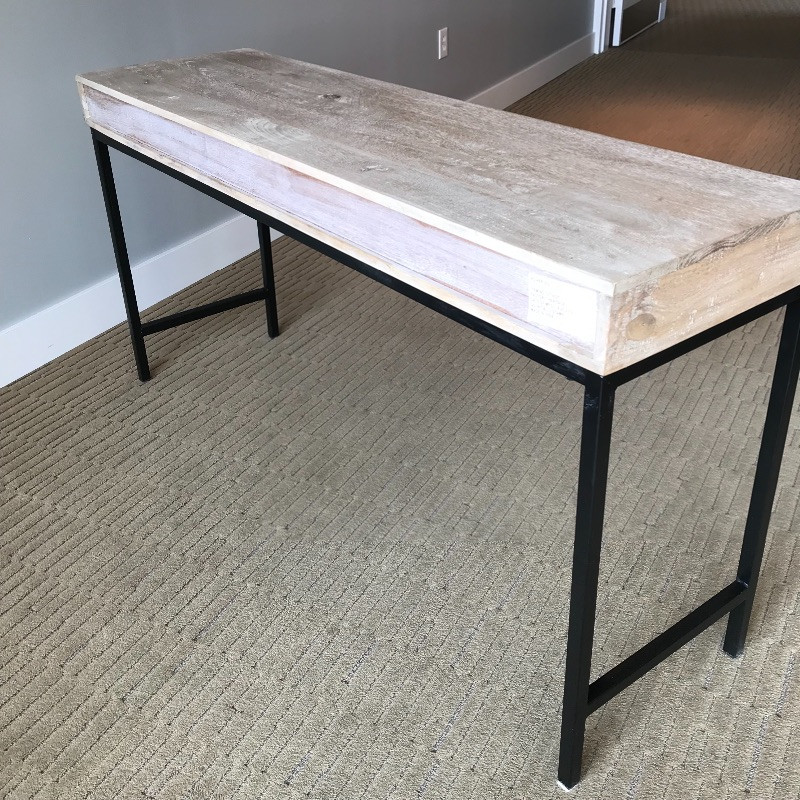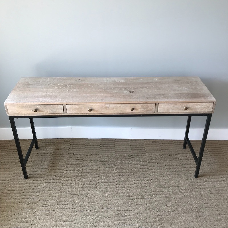 This handsome table has a white-washed finish to it and is light weight wood on a metal stand with three drawers. This piece is solid but a little wobbly at the base connection (should be able to tighten easily). Wood color has a beachy driftwood look to it. Item measures 60” x17” x31.5”.
