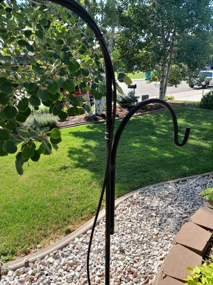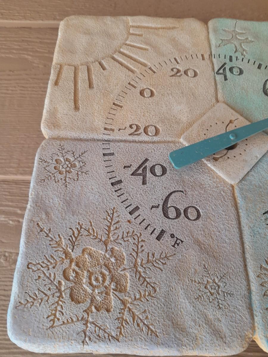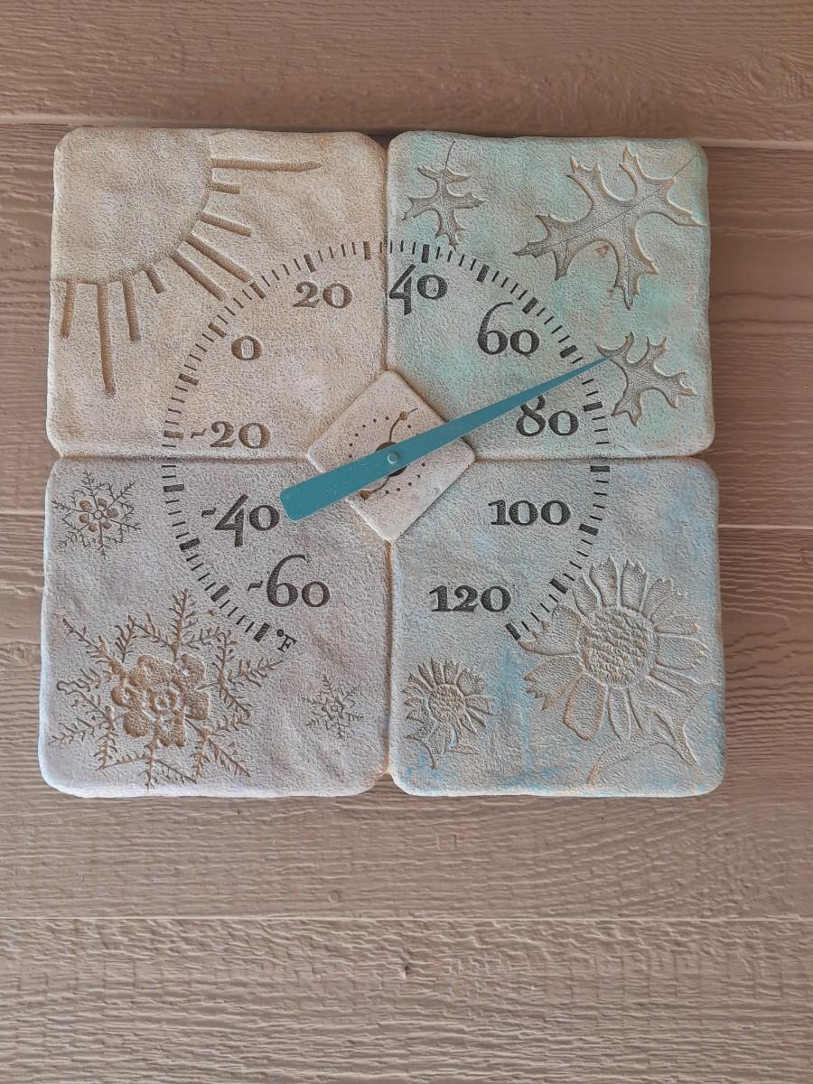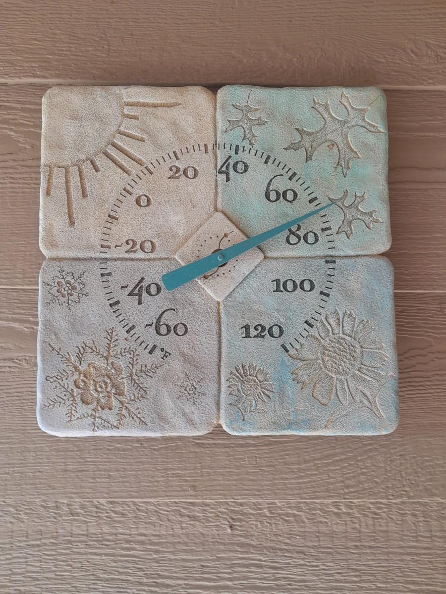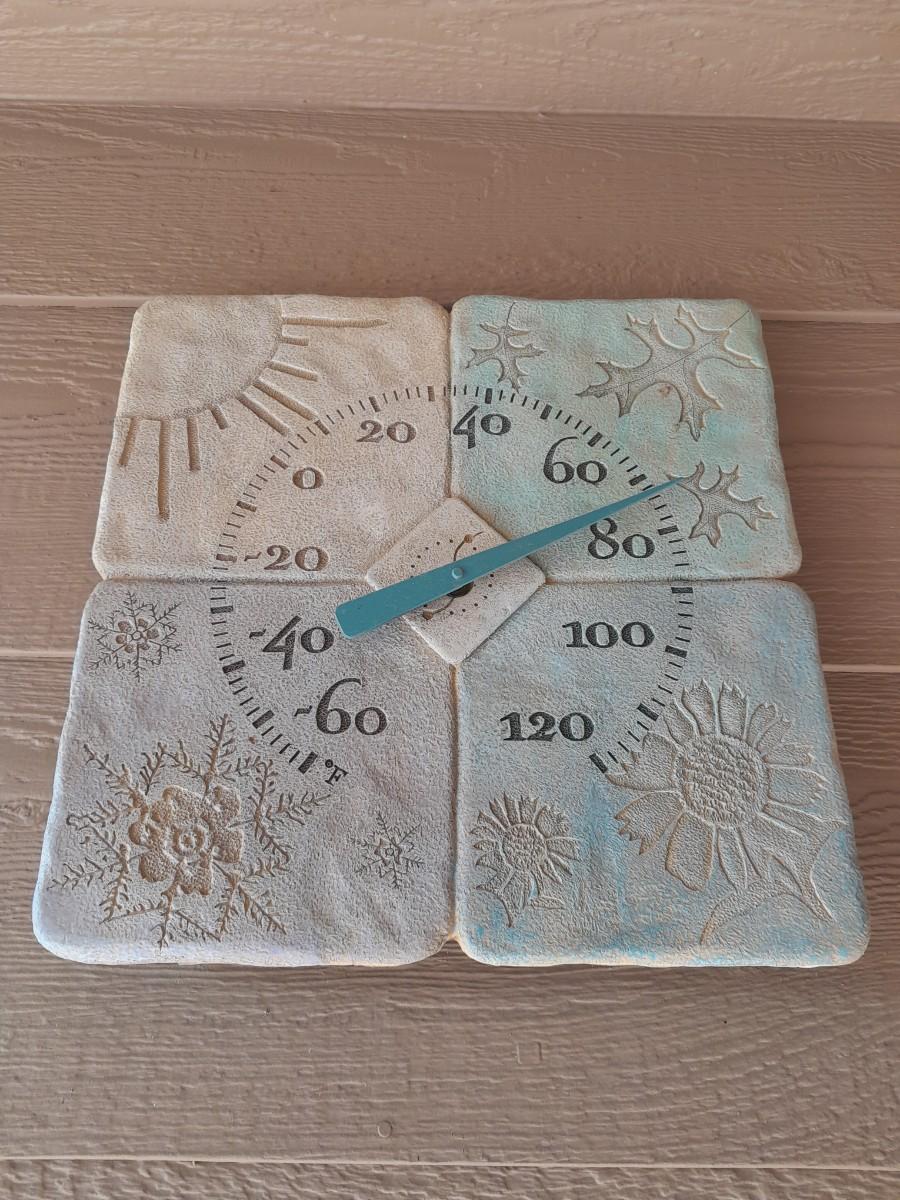 DECORATIVE POTTERY THERMOMETER WITH DESIGNS 13.5" X 13.5" AND SHEPHERDS HOOK
