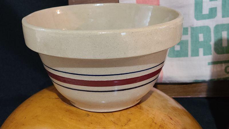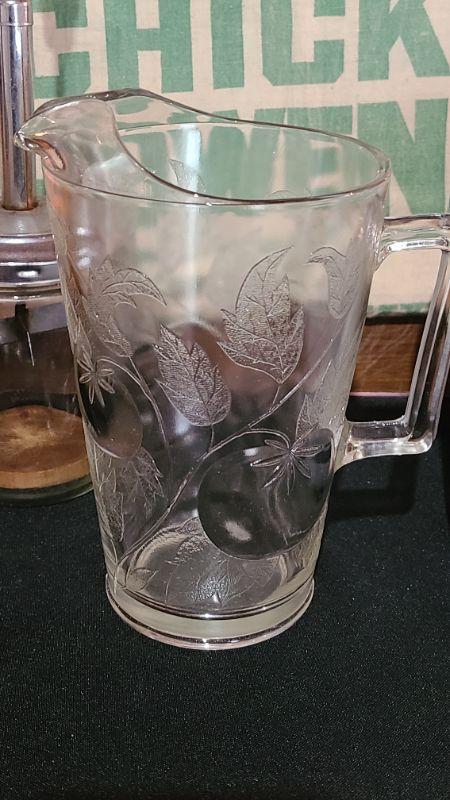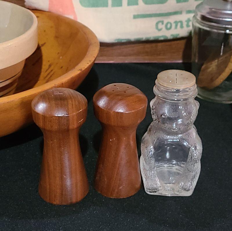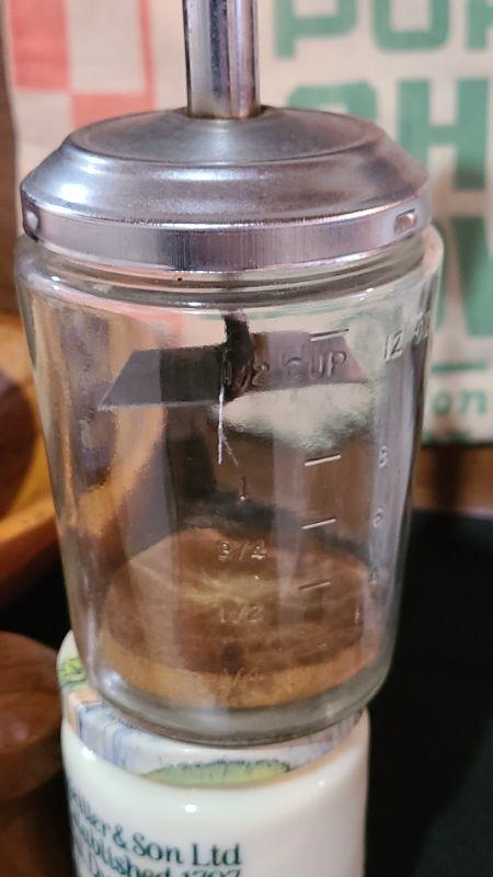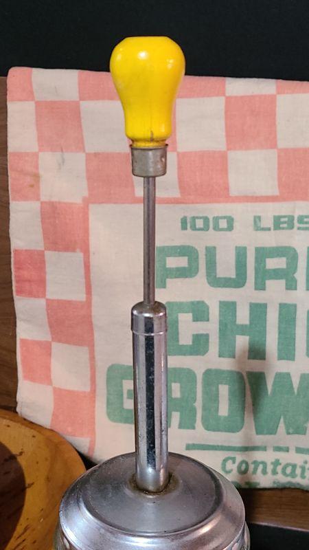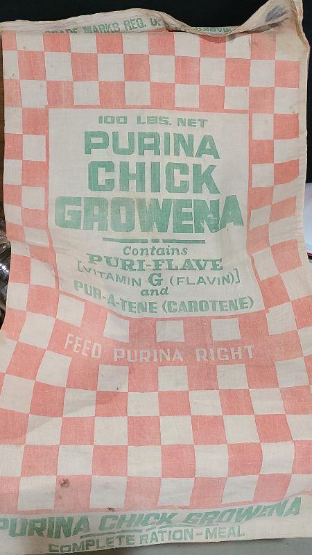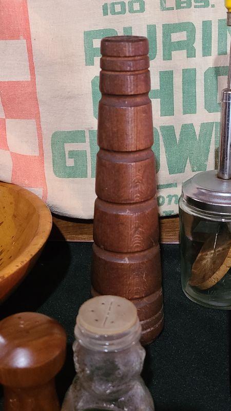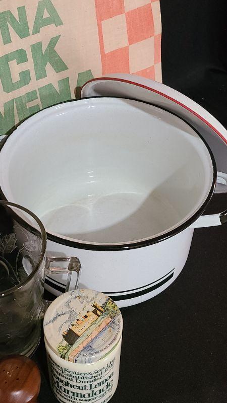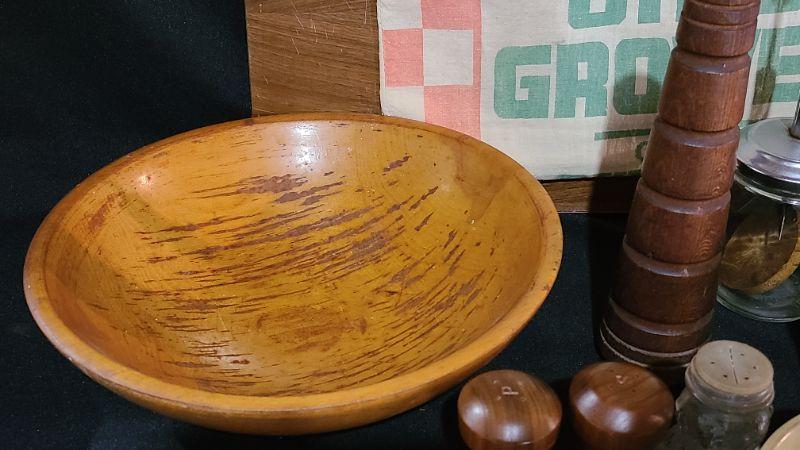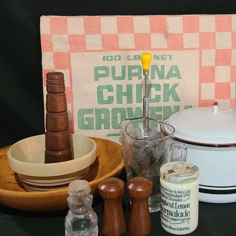 Nice lot of vintage kitchen: Dough bowl, chopper, marmalade jar, glass tomato pitcher, enamel metal pot, salt/peppers, and Purina Chick Feed Sack!
