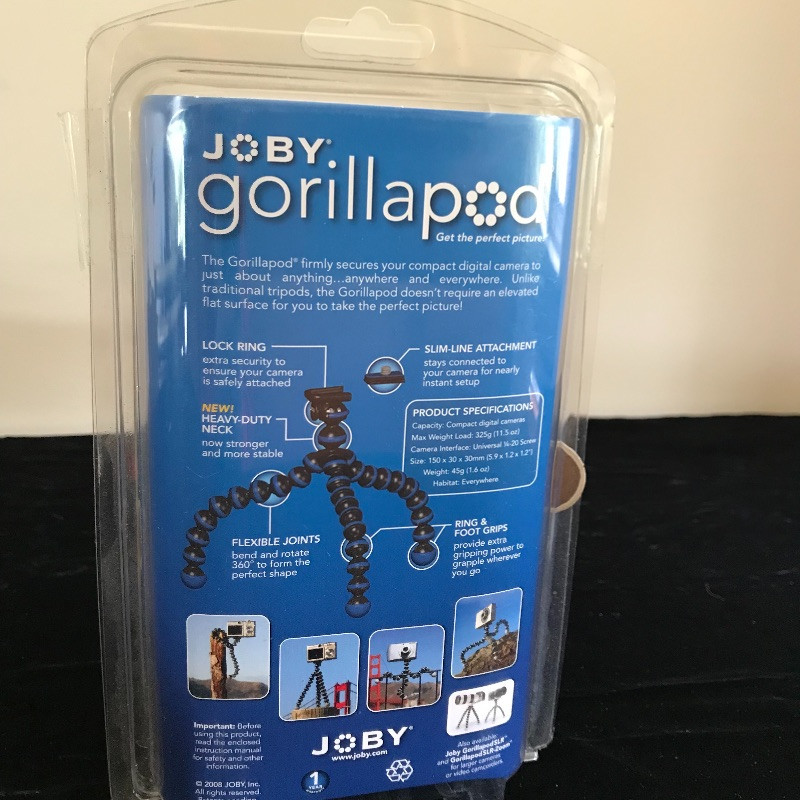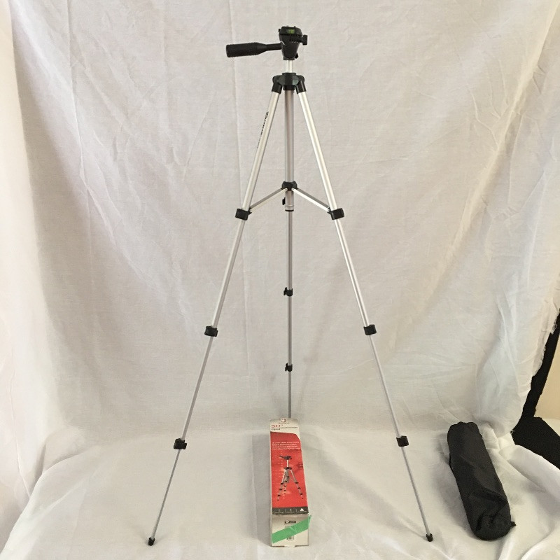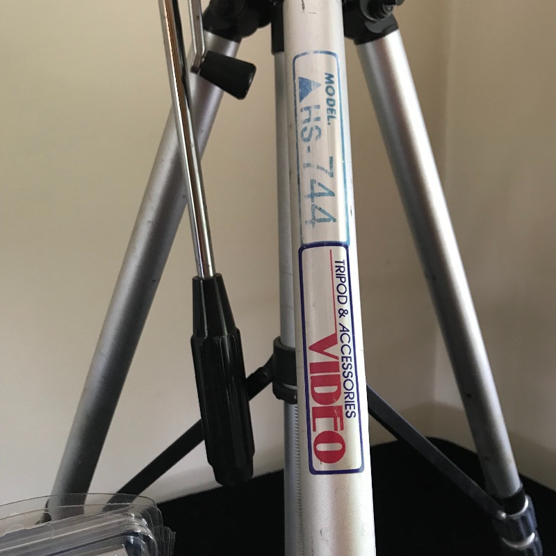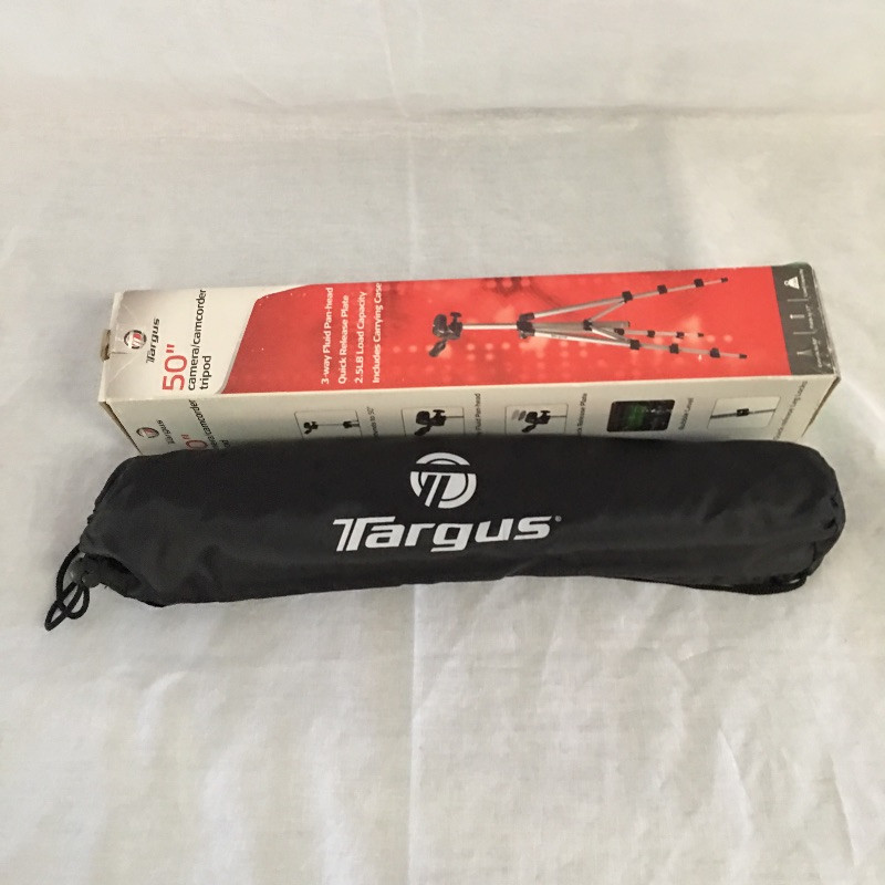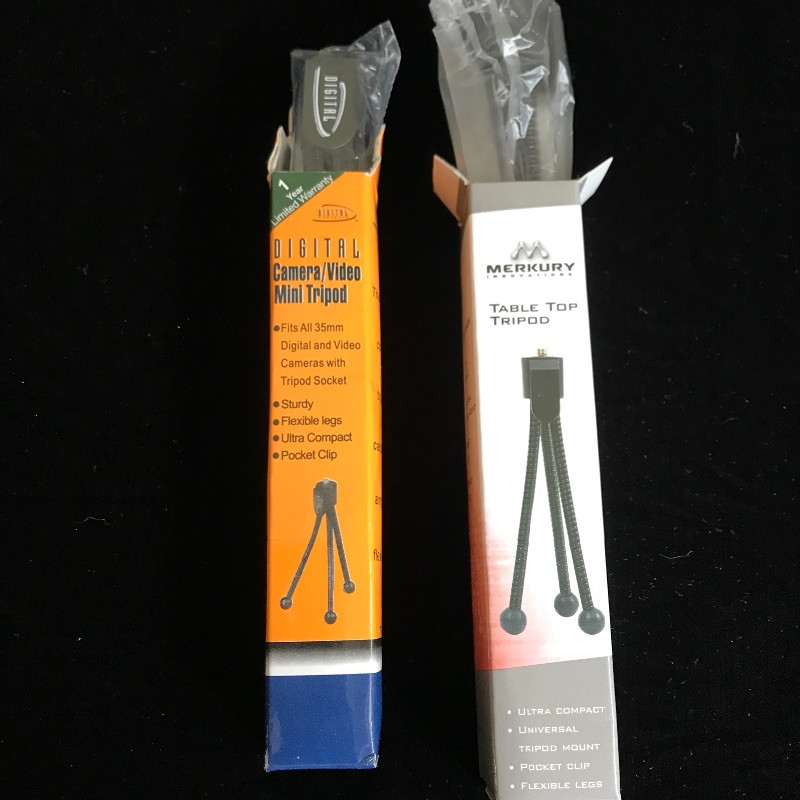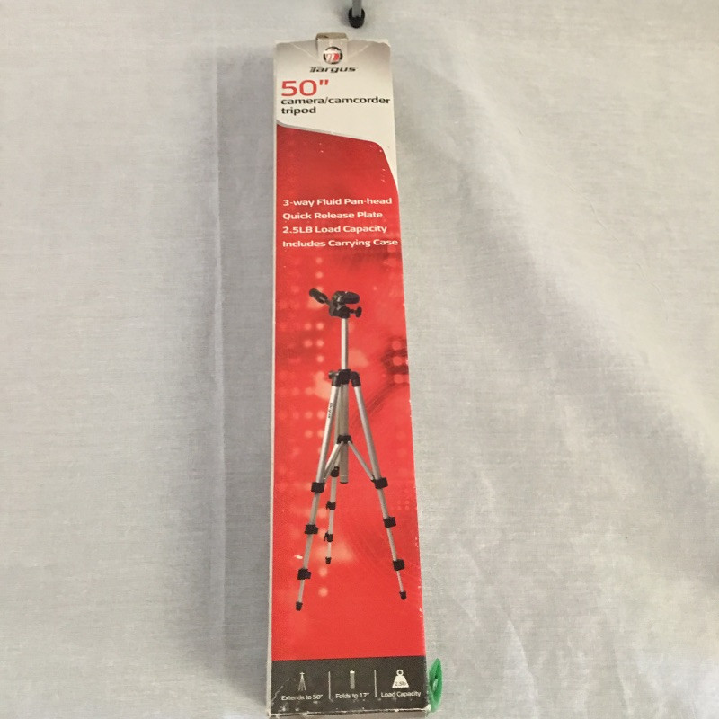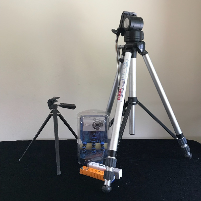 A sturdy and large tripod & accessories HS-744 with two height adjustable clips on each leg and a lever to adjust the height on the head. The fully extended legs are 4’ and the neck has a 5” range, see images. Lot also contains a Targus 50” camera tripod that folds to 17” and comes with its own carrying bag. Also included are three new, still in packaging, smaller tripods that are Merkury Innovations, a table top tripod and a Digital Concept’s camera/video mini tripod feature flexible legs and a pocket clip. Also new, Joby Gorillapod that looks as though it would grip on any surface for the perfect shot! Lastly, a small black tripod with 10” legs.