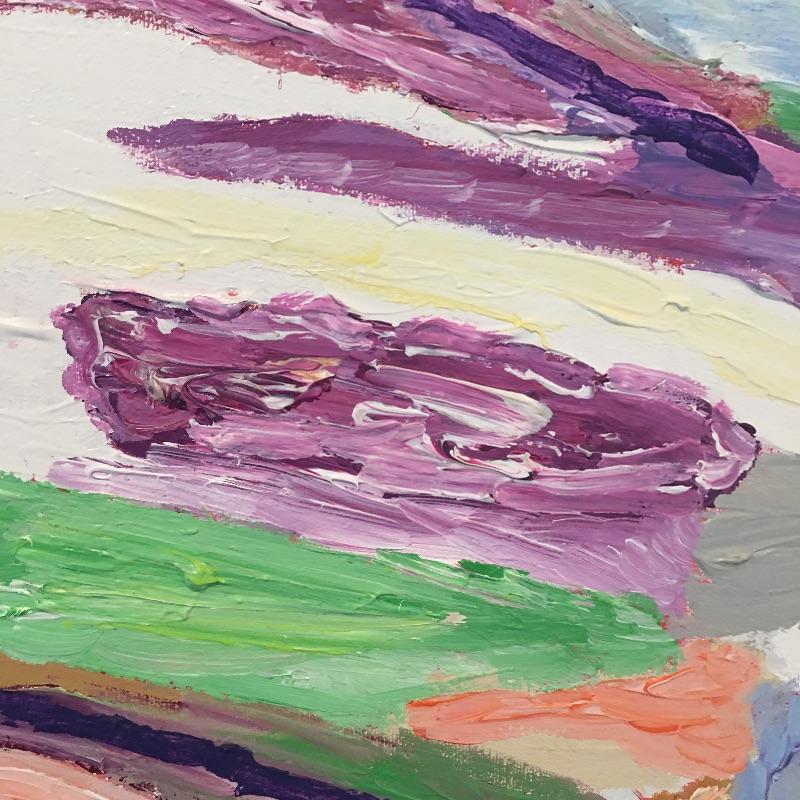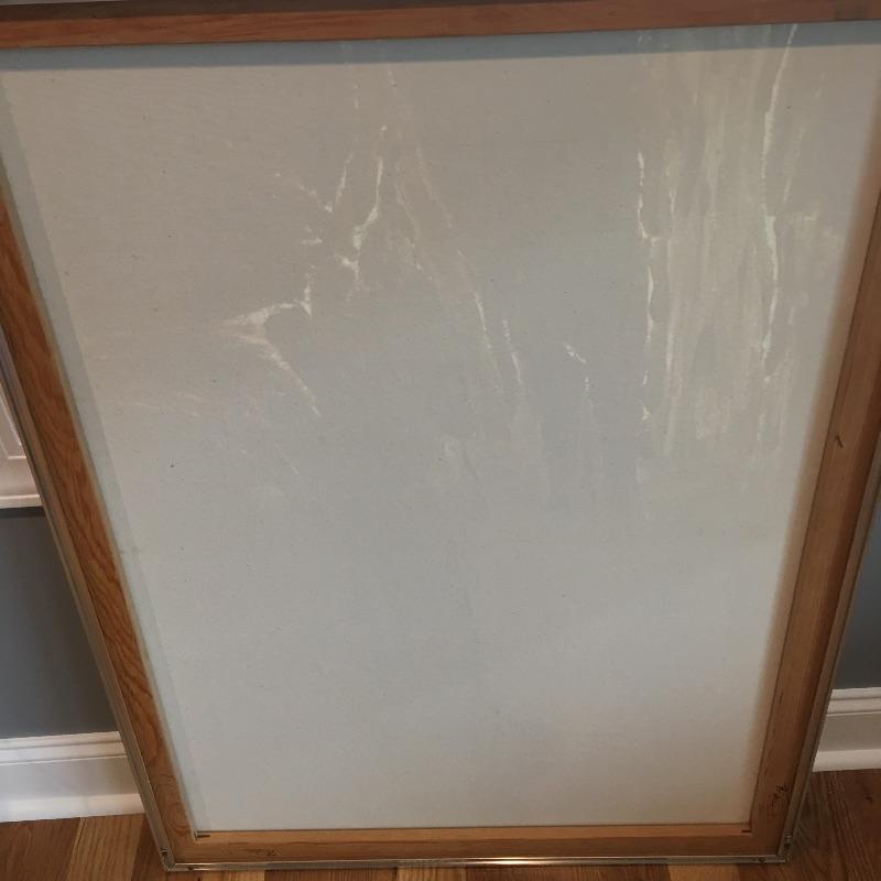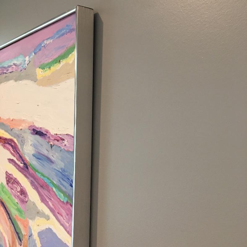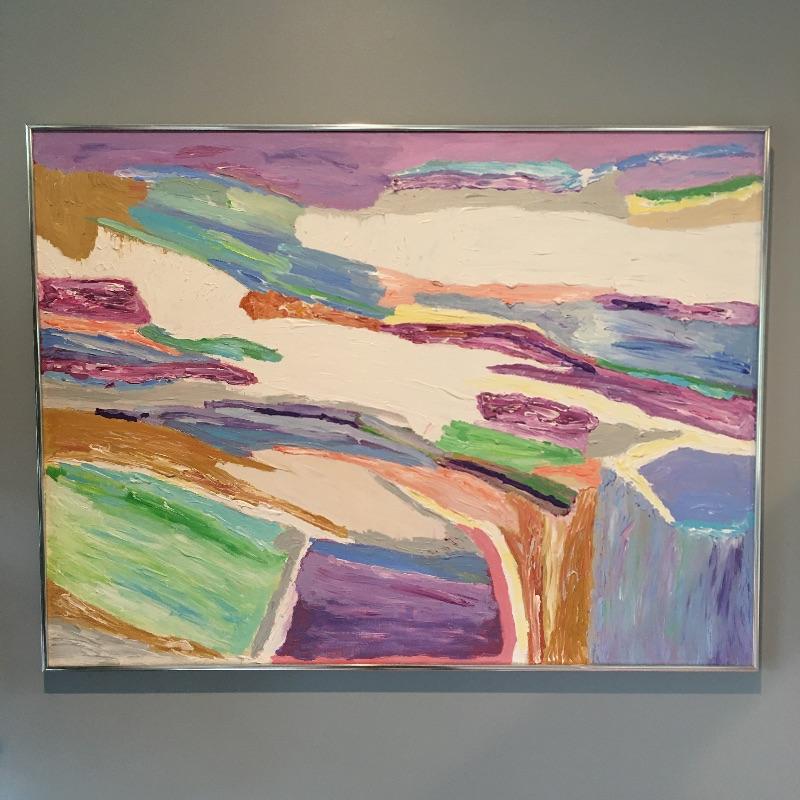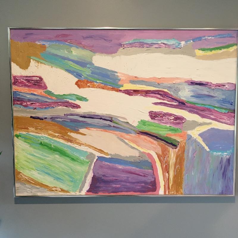 Framed oil painting by the owner of the home, Sandra Houle. It is unsigned. A intriguing oil painting in array of colors will look great in your home. Frame measures 30.5” x 40.5”.