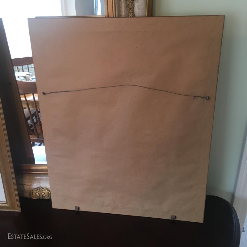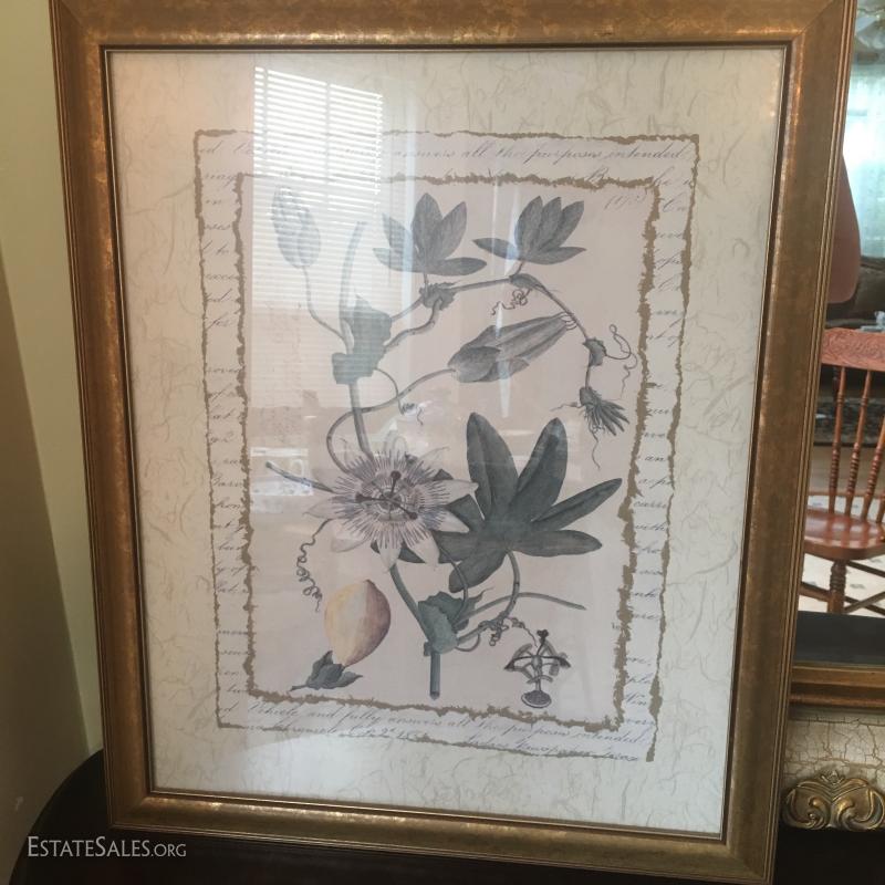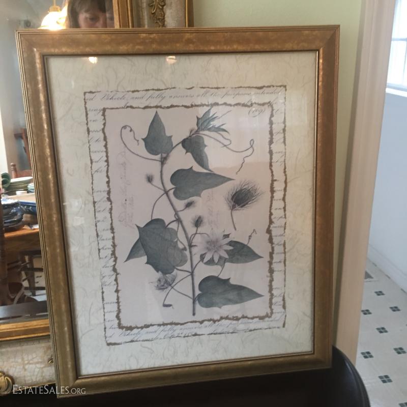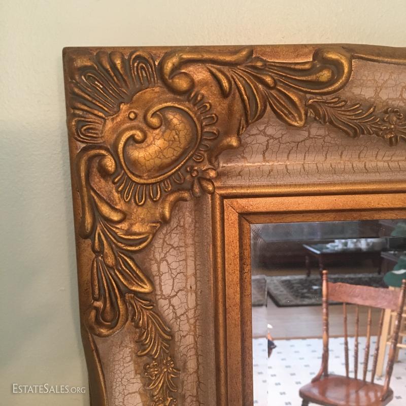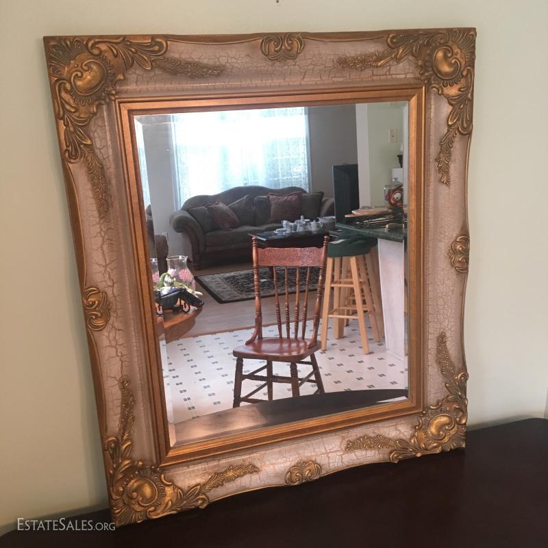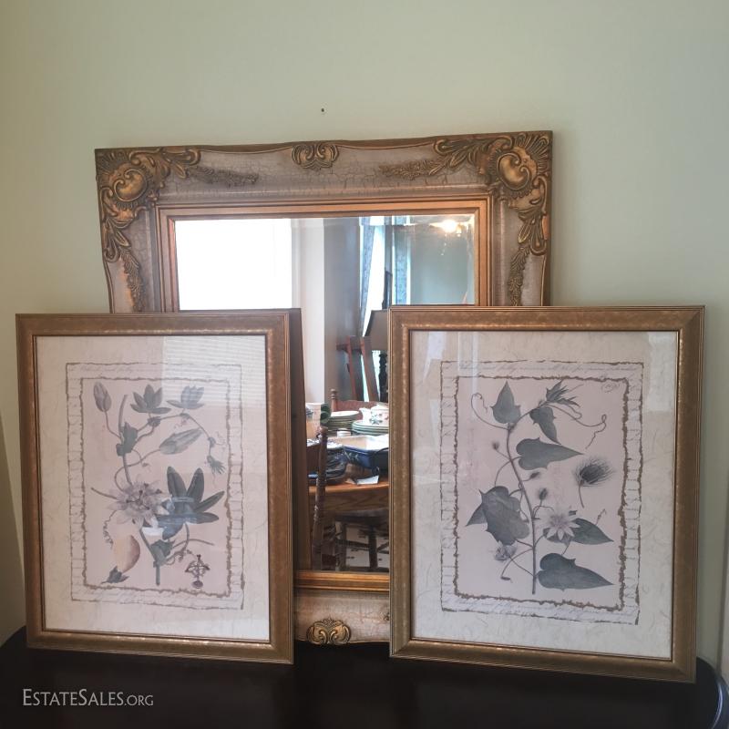 Beveled glass mirror in ornate gold and distressed white frame. Measures 33" x 29". Two botanical prints match the mirror nicely and are well framed. Measure 22.5" x 18.5". This lot is available for local pick up in Mills River, NC only.