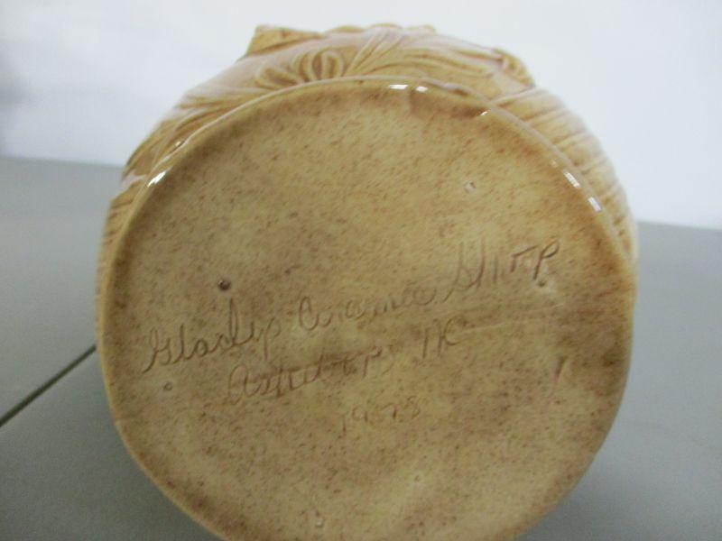 Very detailed, hand painted and raised graphics heavy duty ceramic pottery pitcher with a greyhound dog figure for the handle. Approx. 11.25" at its tallest height