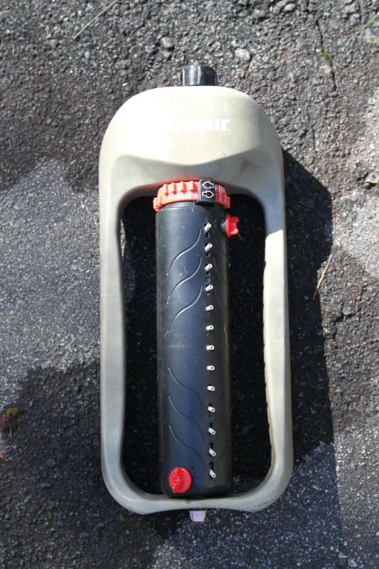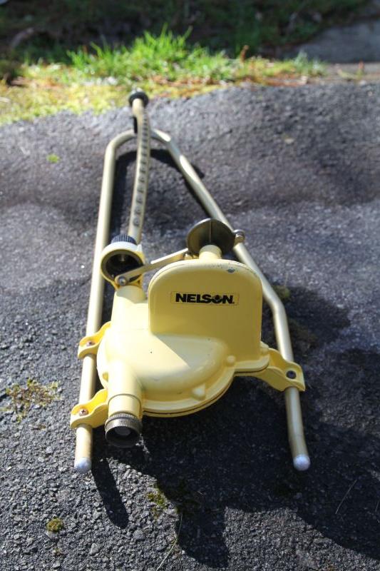 Wheelbarrow is made of steel and has a substantial wood frame. No brand name found. Very little rust. Wheel needs inflating. Did not test. 4 bags of soil and two oscillating sprinklers.