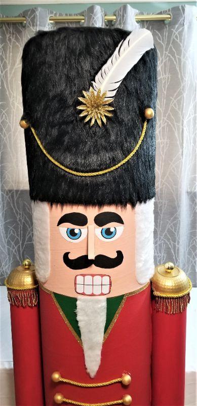 Tall (71" tall) heavy cardboard 3 dimensional Nutcracker Christmas decoration. Good condition - 2 ft across. Very good looking. Note the "feet" - they are designed so that you put fake snow, holly, or wrapped Christmas packages around them to hide the base. Recommended for indoor or under the porch use.