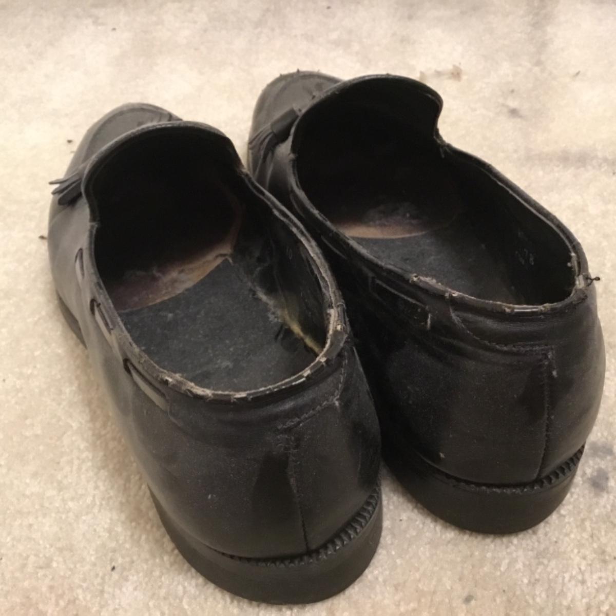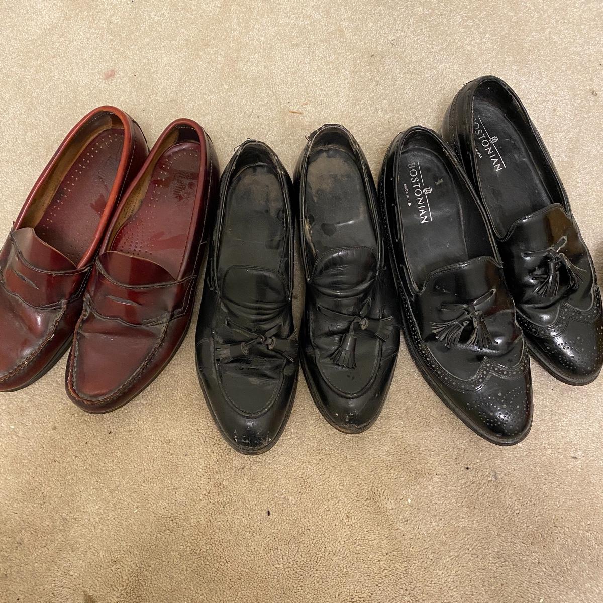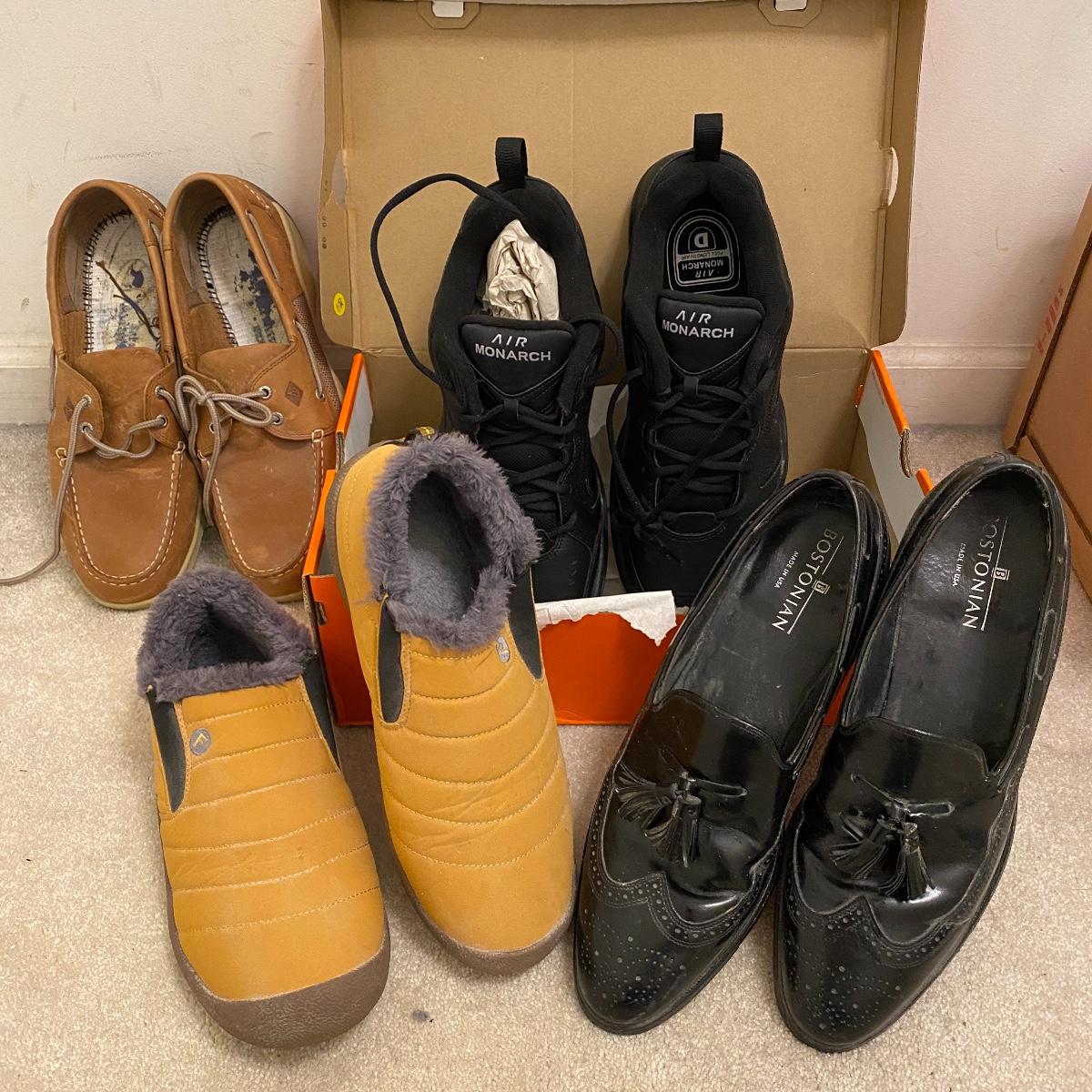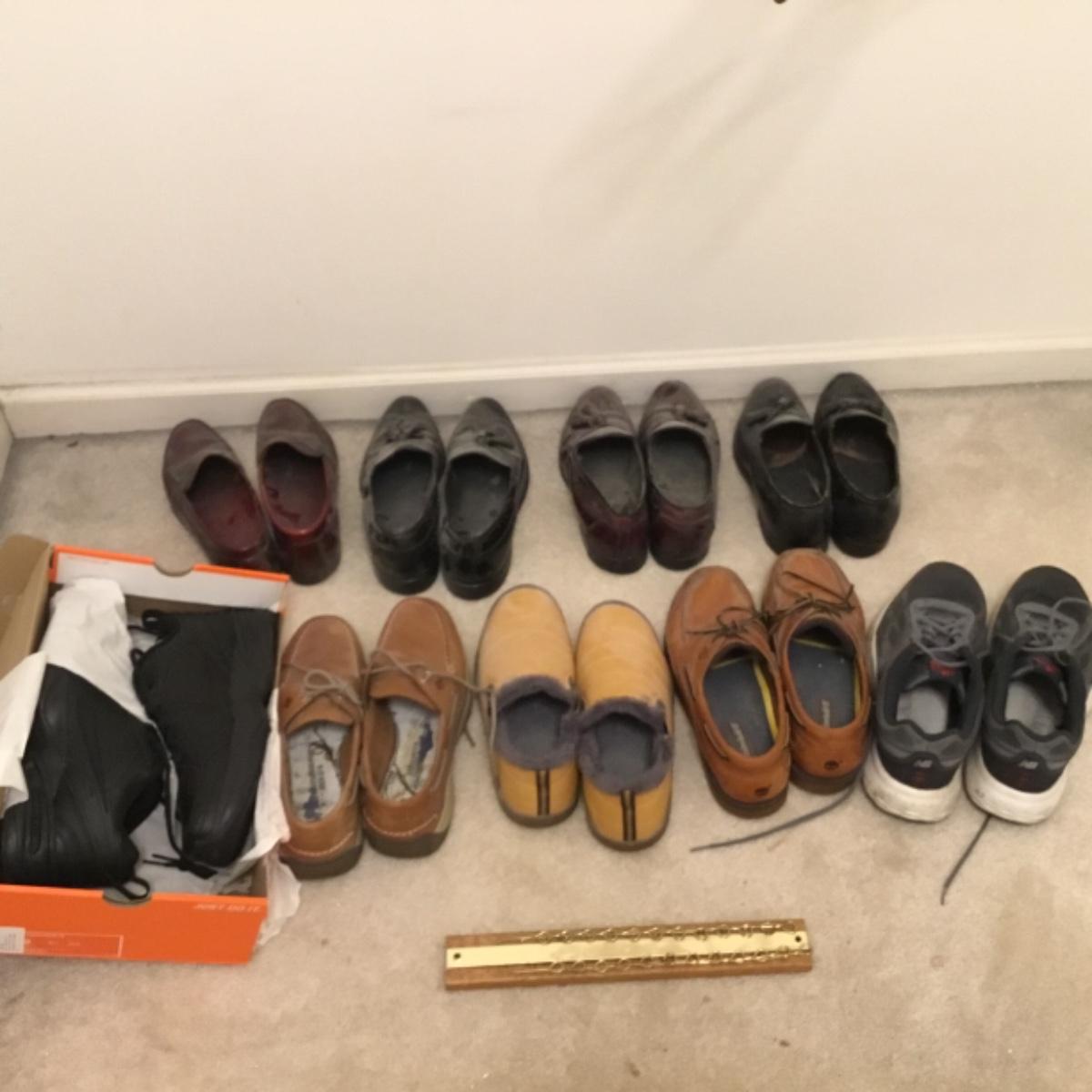 Eight pairs of men’s shoes primarily size 12. Some of the dressier shoes appear smaller and sizes are worn out so may be size 10. See photos of tags that are visible and brands such as Nike, Bostonian, and Timberland. Black Nikes are new in box. They don’t appear to be worn. Dressy shoes have some dust that can easily be wiped off. Also Included in the lot is a tie rack and shoe rack that measures 22”x62”. Shoe rack can hold eighteen pairs of shoes. See photos. Local pickup only.