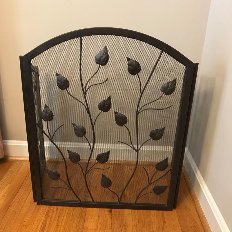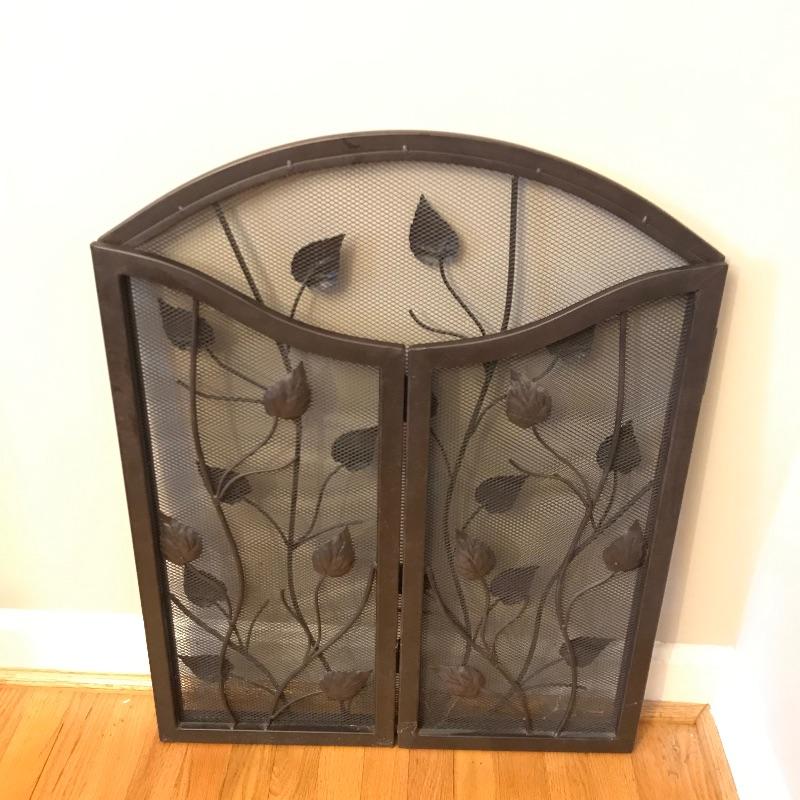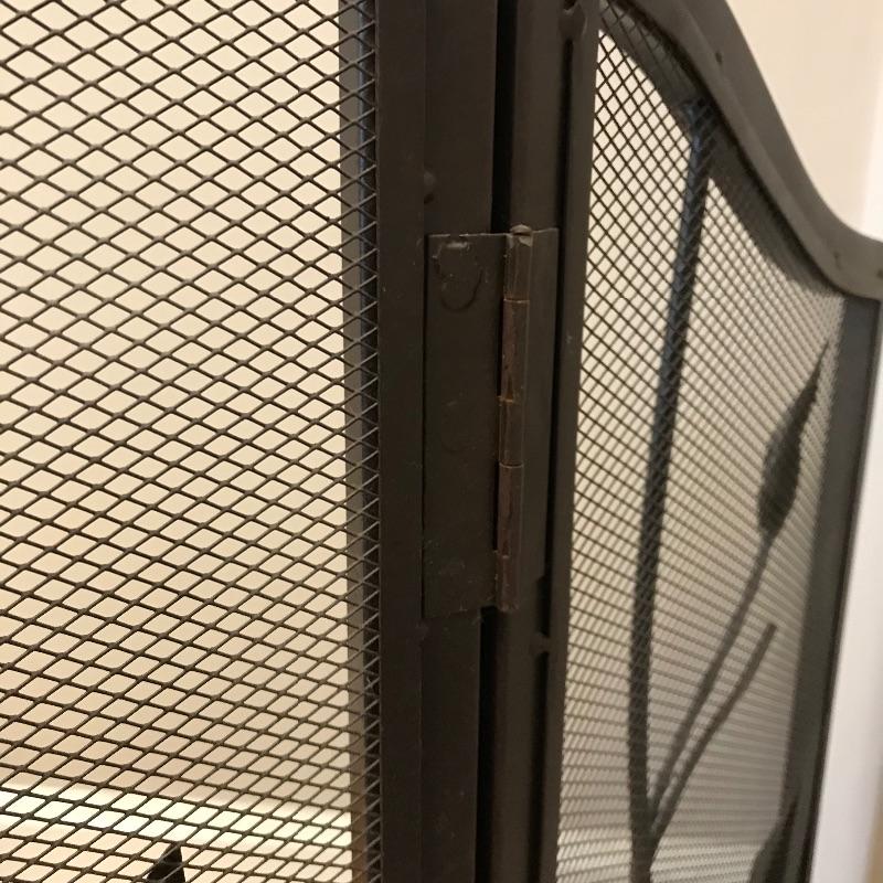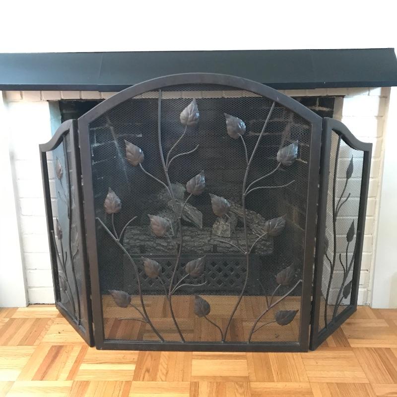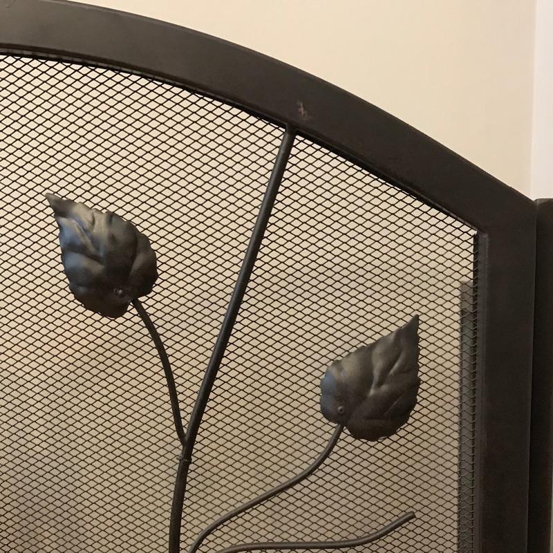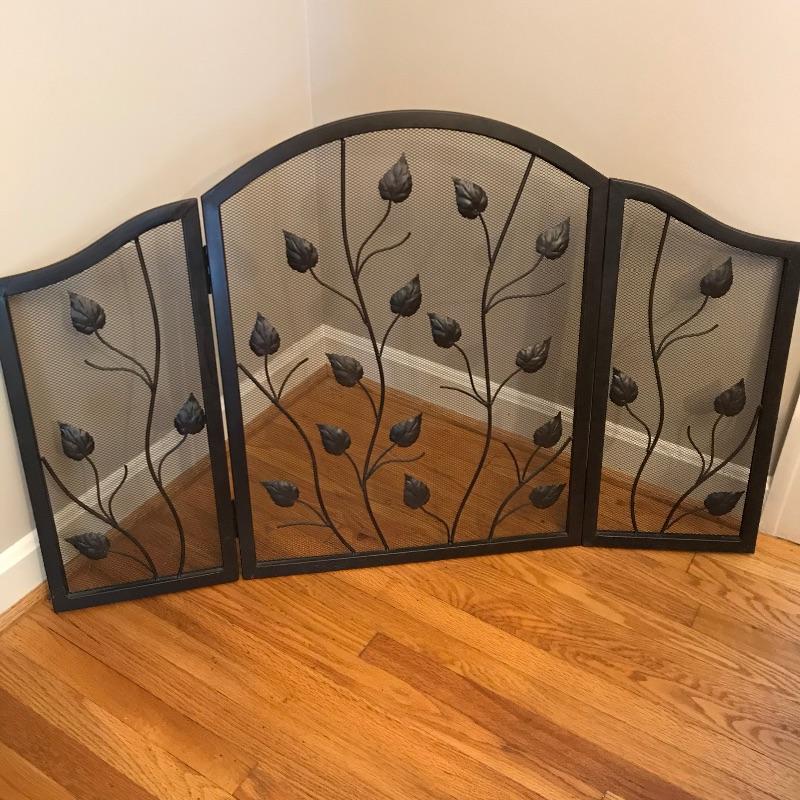 Simple and elegant with its climbing vines. Can’t you just picture a nice fire behind it on a snowy evening? This black fireplace screen appears to be iron and sturdy. It has three panels with two hinges each connecting the sides to the center and folds flat for easy storage. It measures approximately 48” x 30.25” when fully open. For reference, the middle section measures 36” x 28”. Local pick up only.