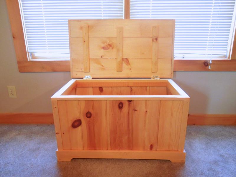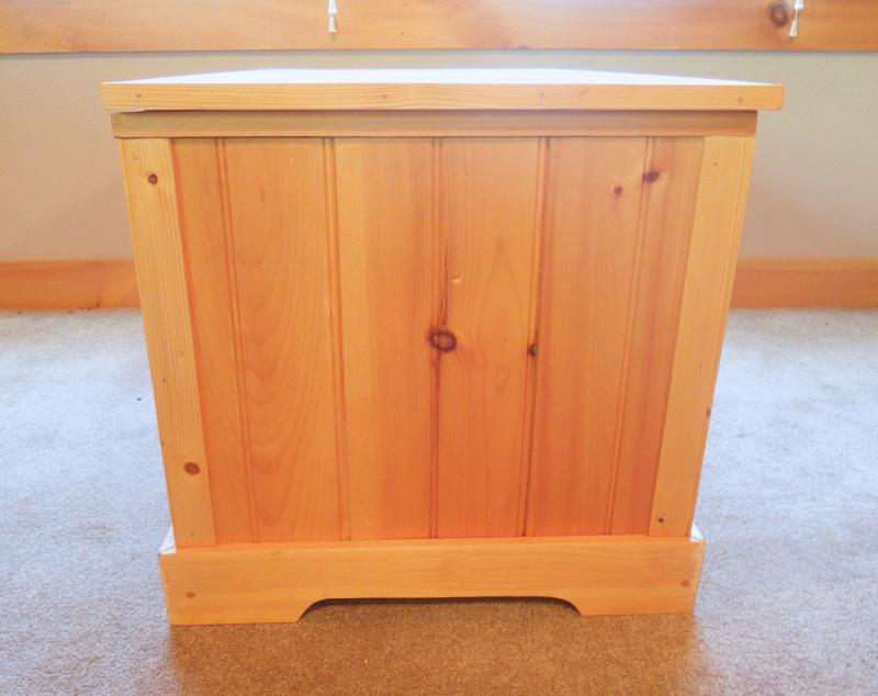 37" x 20" x 20" natural pine with light matte varnish finish. No rough edges. Wainscot style. Brass hinged top.