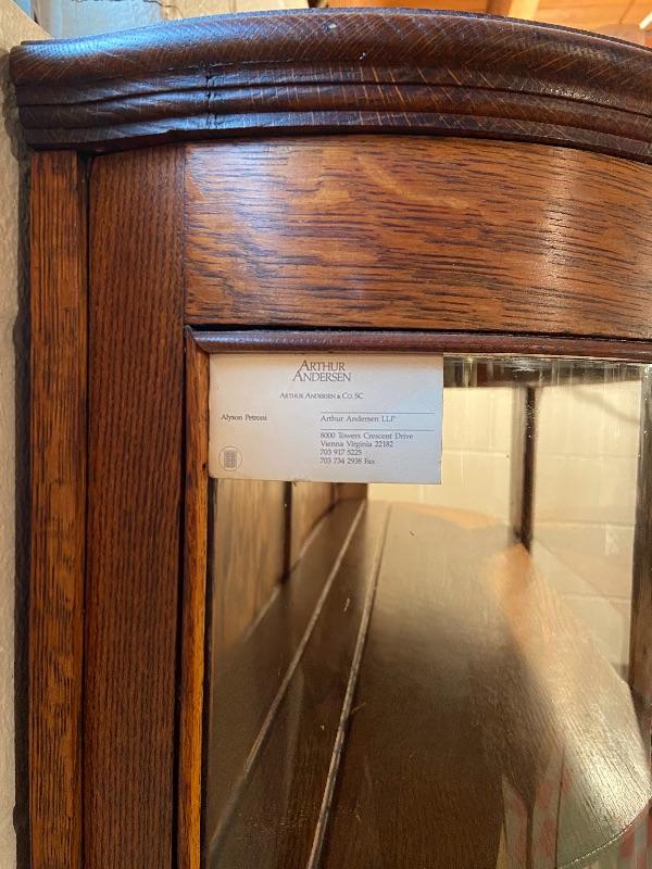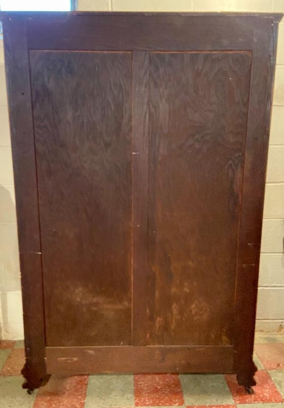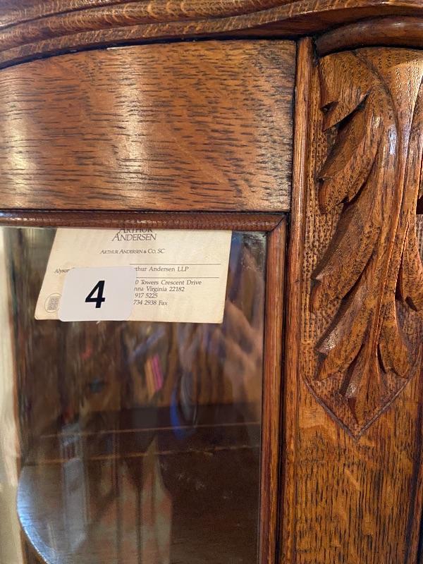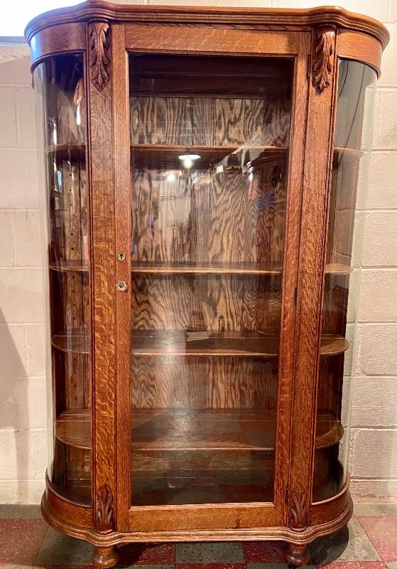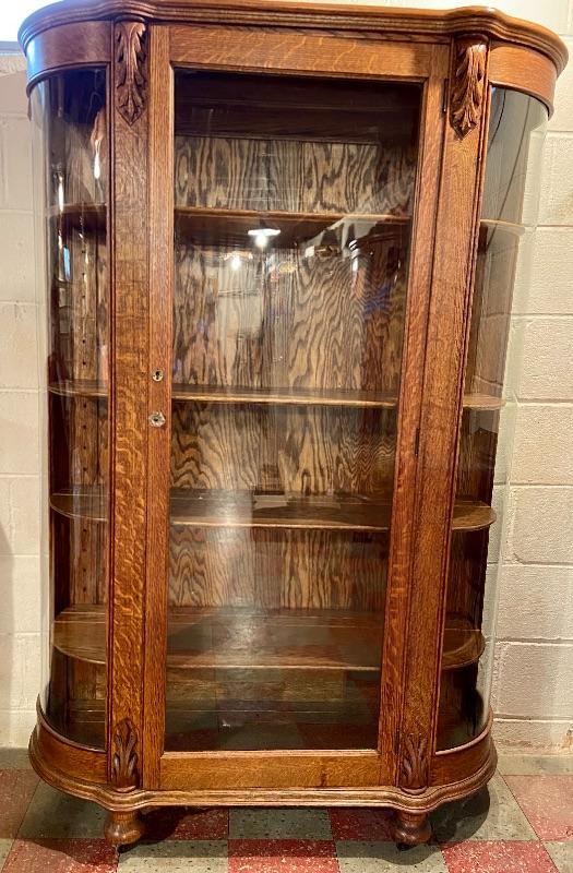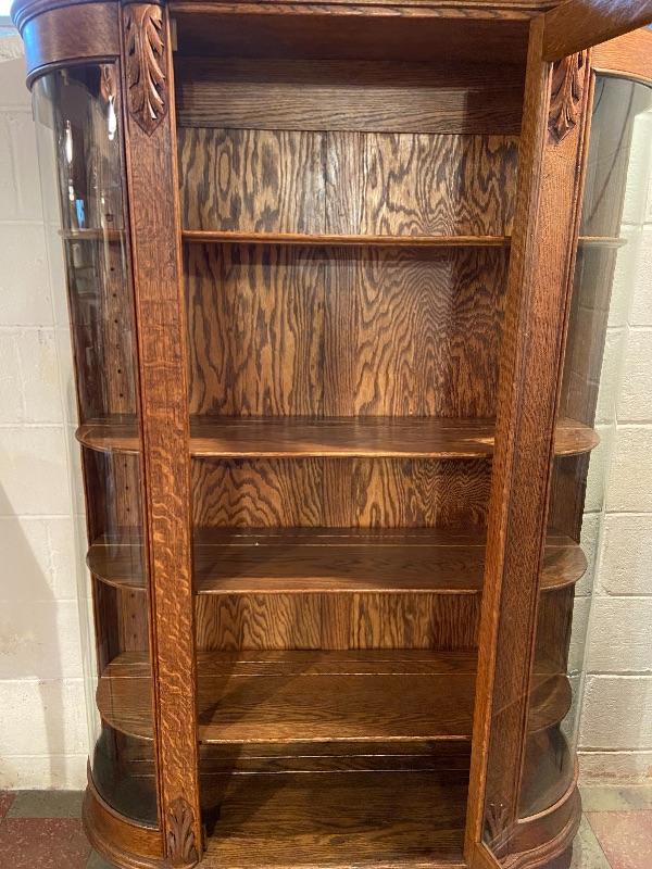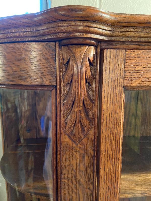 Decorative Antique oak curio cabinet on casters 41Lx18Wx65H. Please see all pictures for condition. Thank you for looking and have fun bidding. MHW