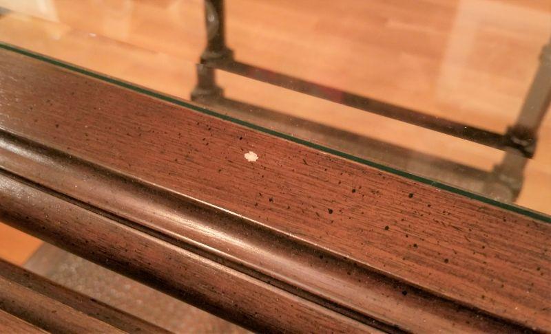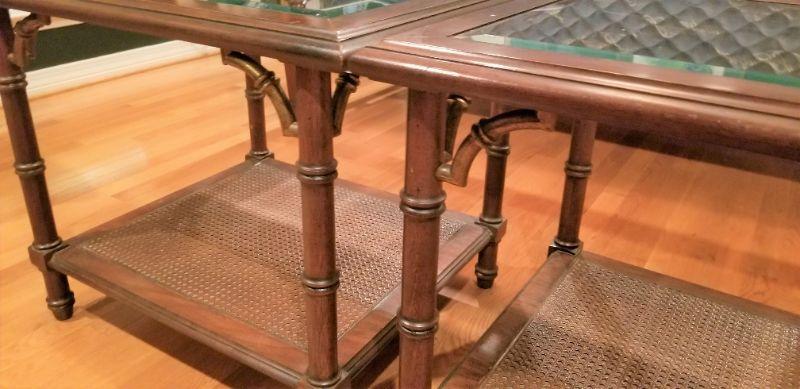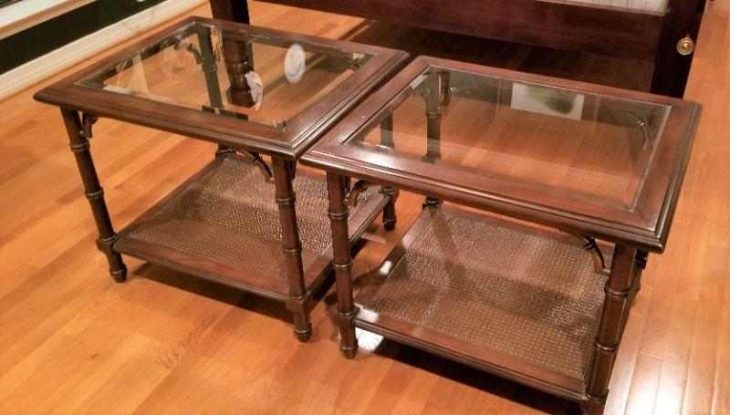 Nice pair of lamp tables with Asian styling. Both feature beveled glass tops and cane bottoms. Note that one has a small "ding" in the finish. They each measure 22" tall, 26.5" long, and 22 1/4" wide. Price is for the pair.