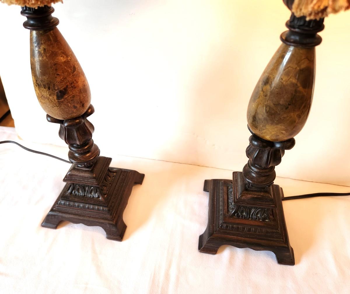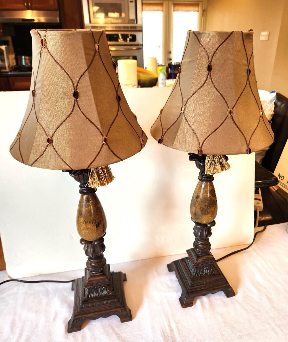 Pair of attractive contemporary decorator lamps, both work, 25" tall, faux stone base.