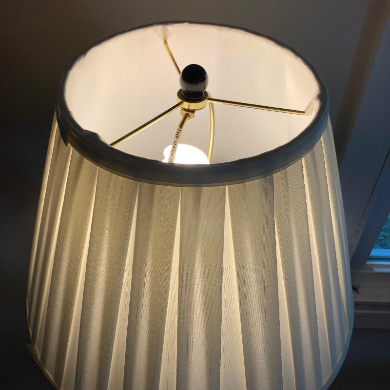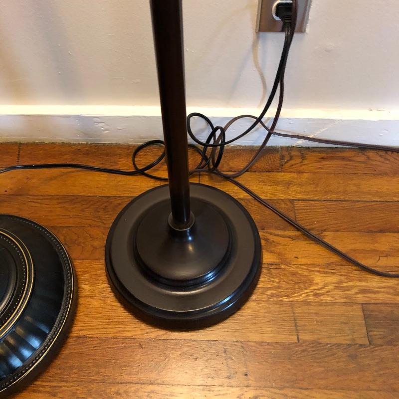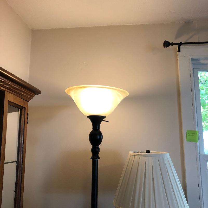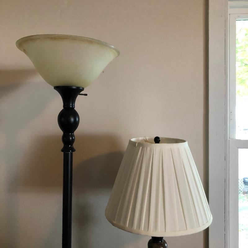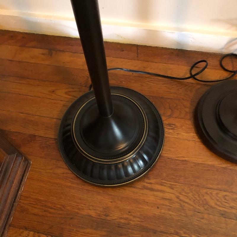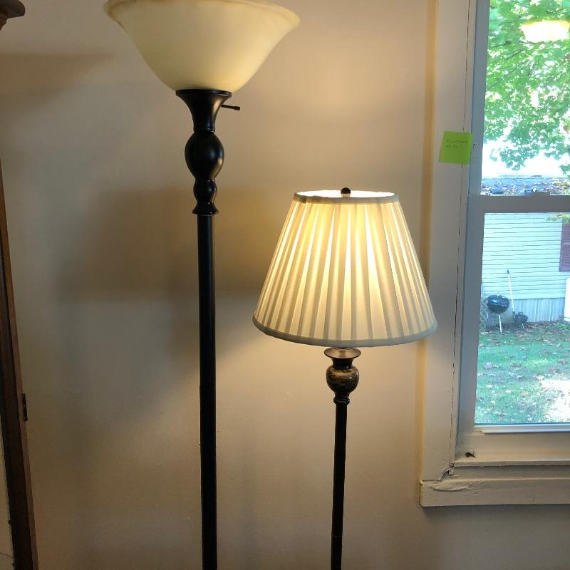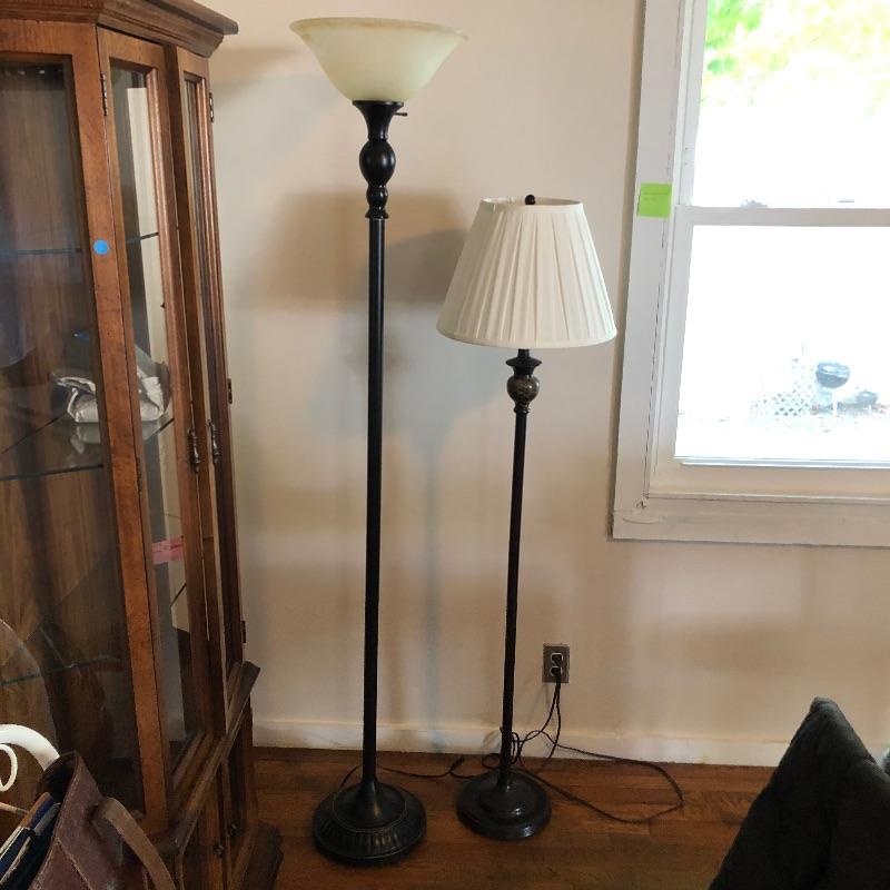 These two floor lamps both have dark aged bronze colored bases. The tallest lamp is an up lighter with a frosted glass shade. The other lamp has an ivory colored shade.