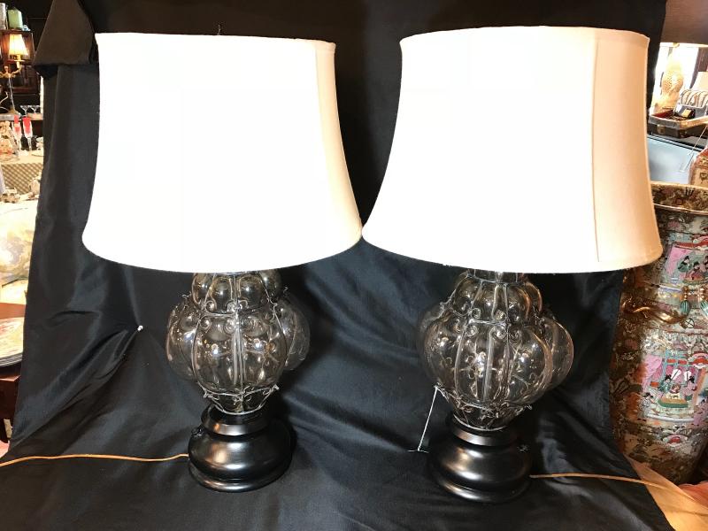 Great pair of large caged glass table lamps. Scrolled cage contains melon shaped smoked glass. Black turned wood base with switch. Switch on socket also. Natural linen drum shades. 18" D shade x 31" H.