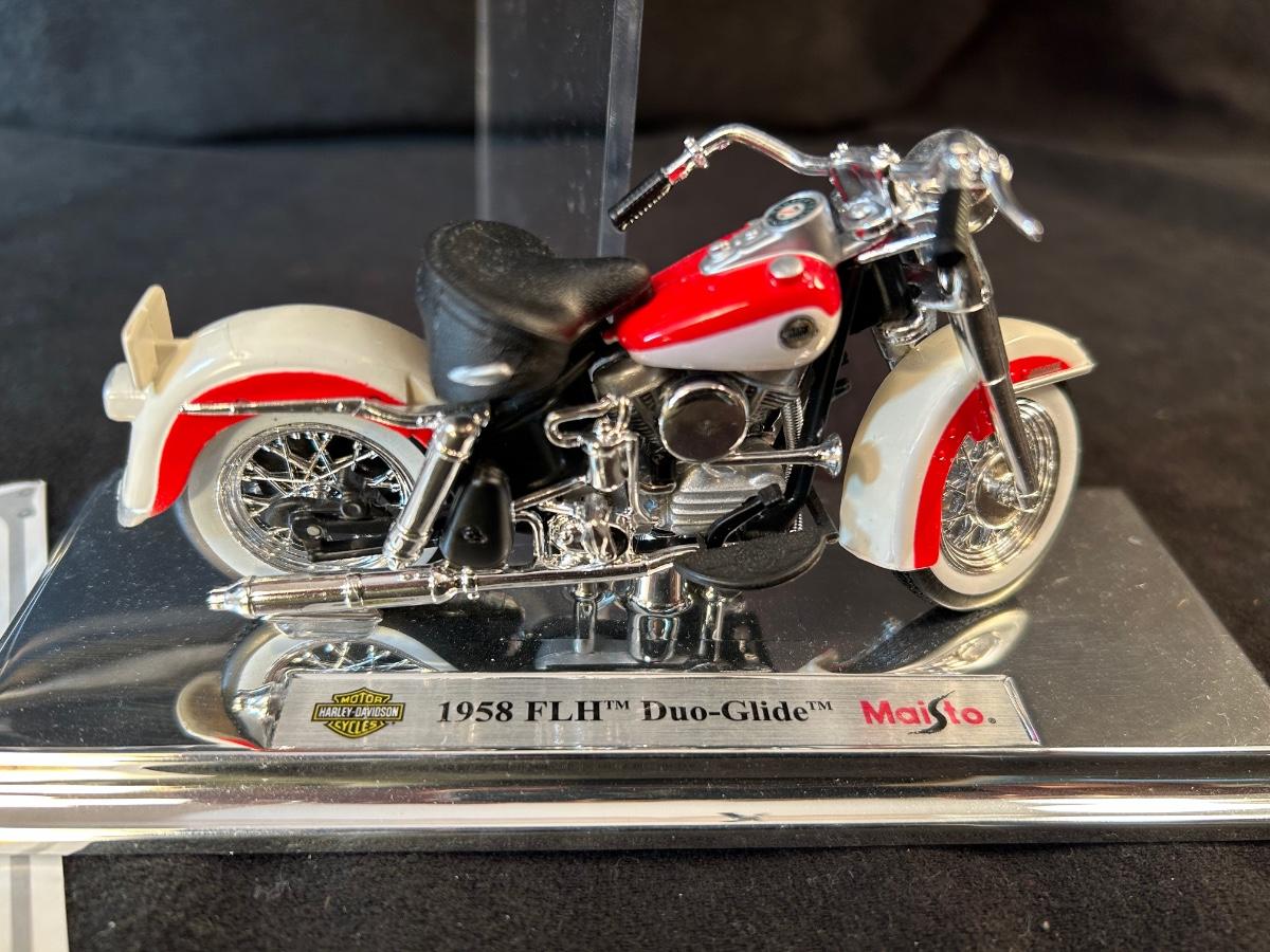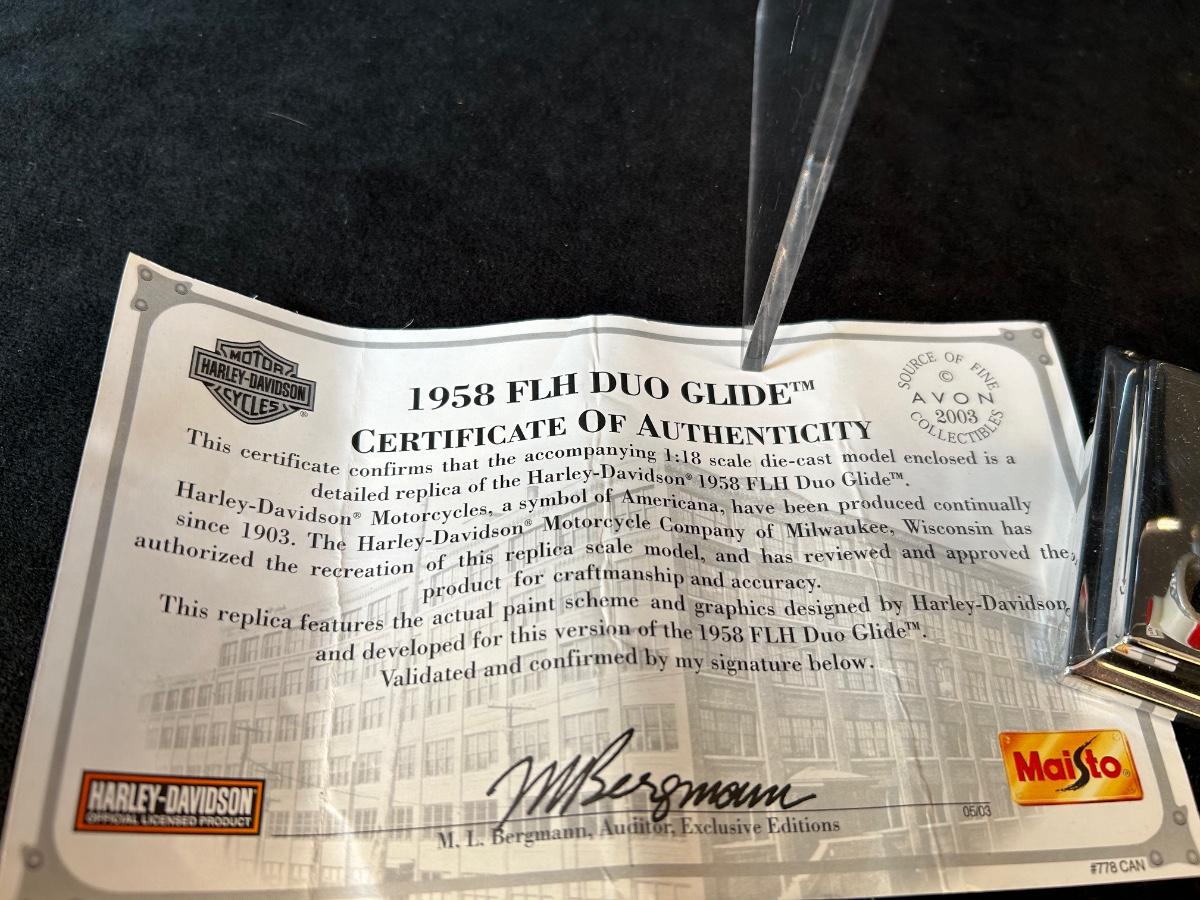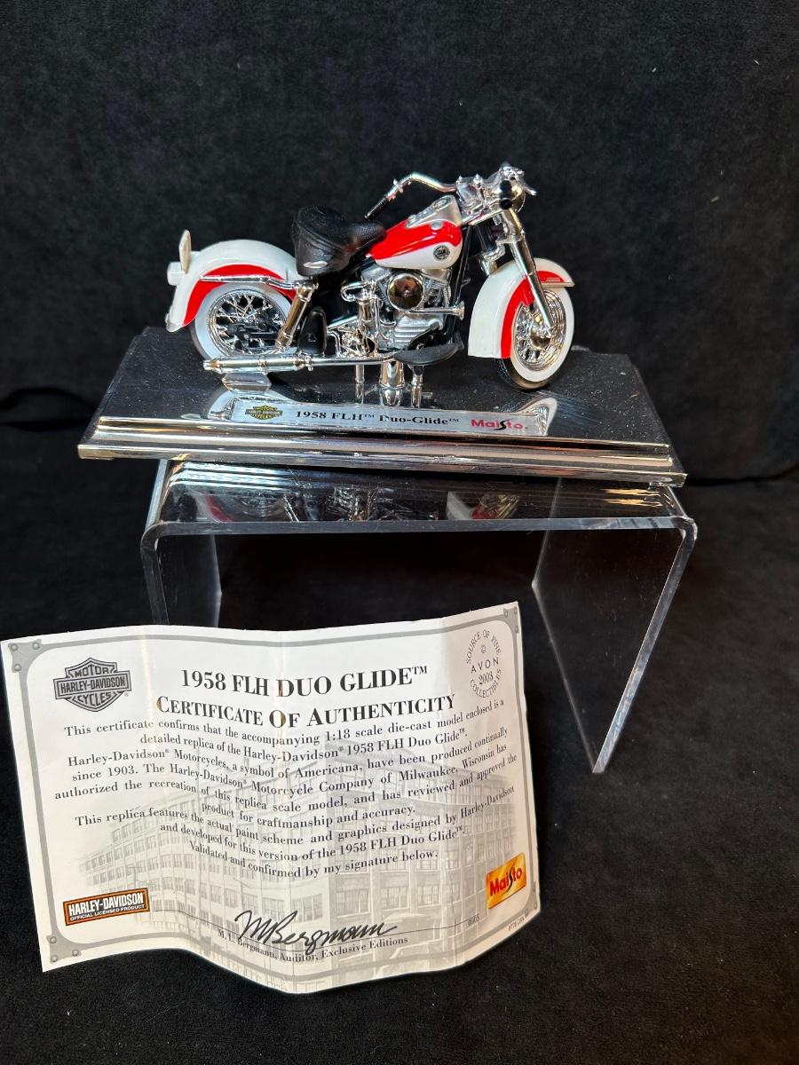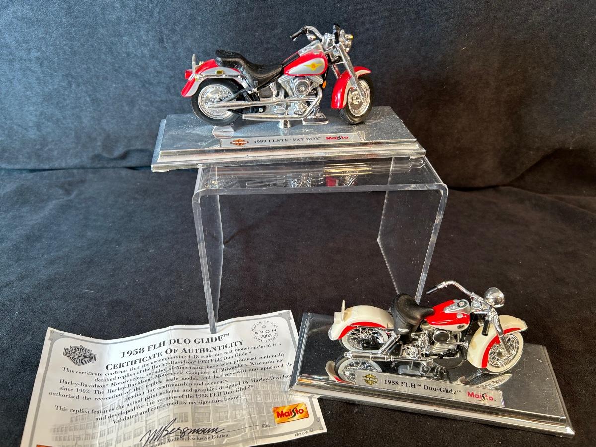 1958 FLH Duo Glide with COA and 1999 FLSTF Fat Boy. made by Maisto. Avon Collectibles