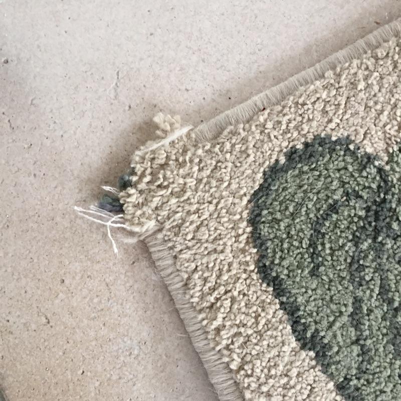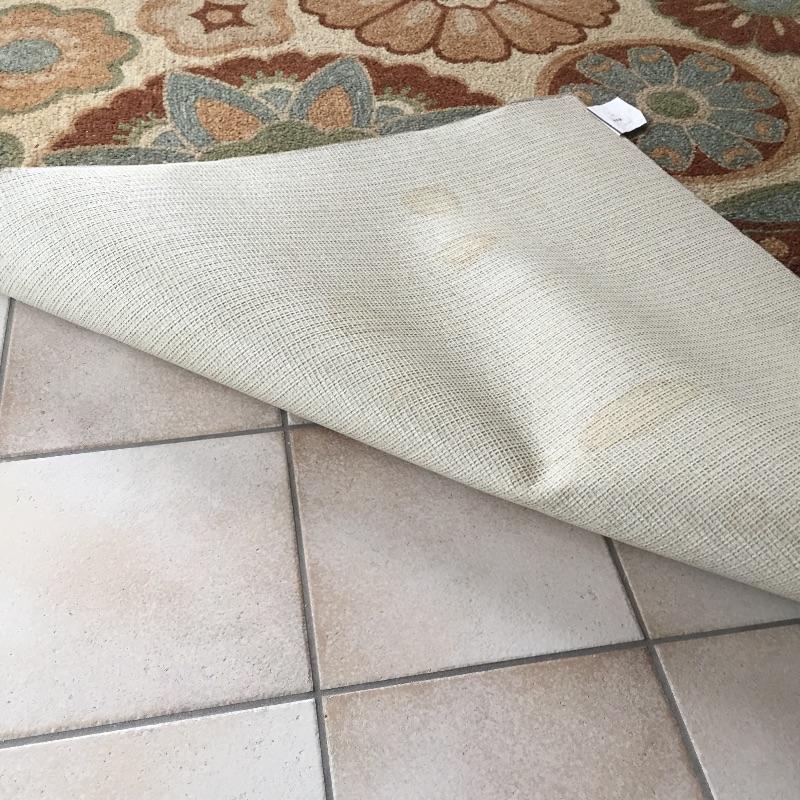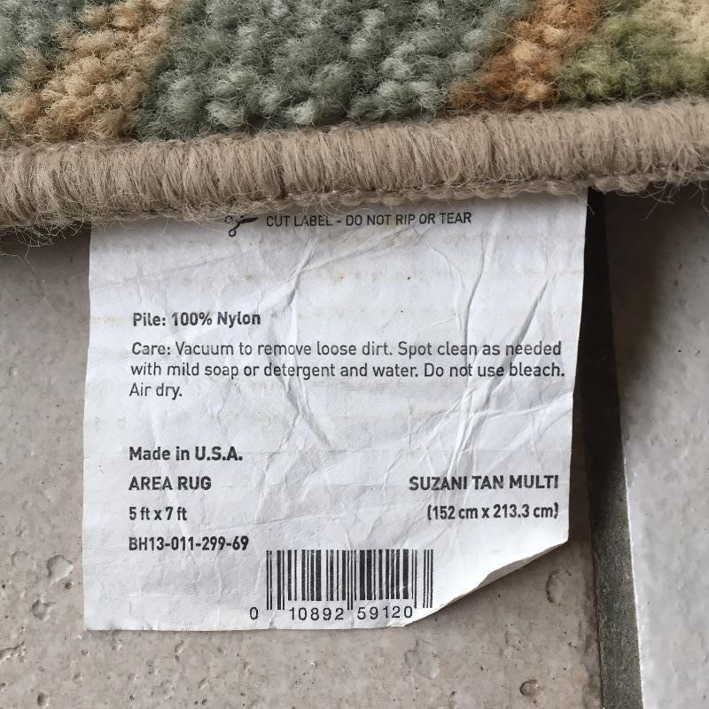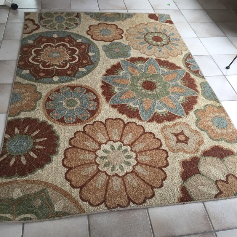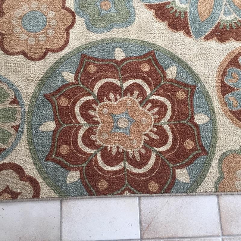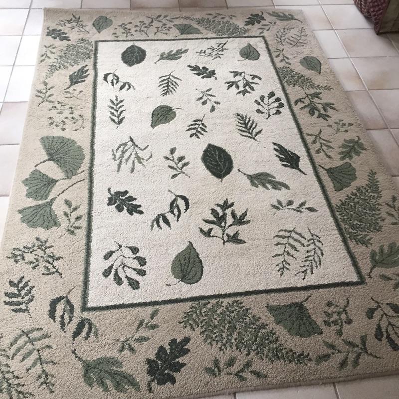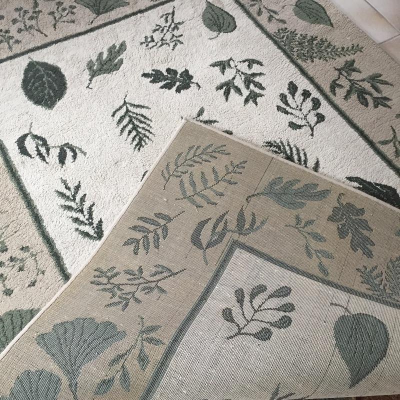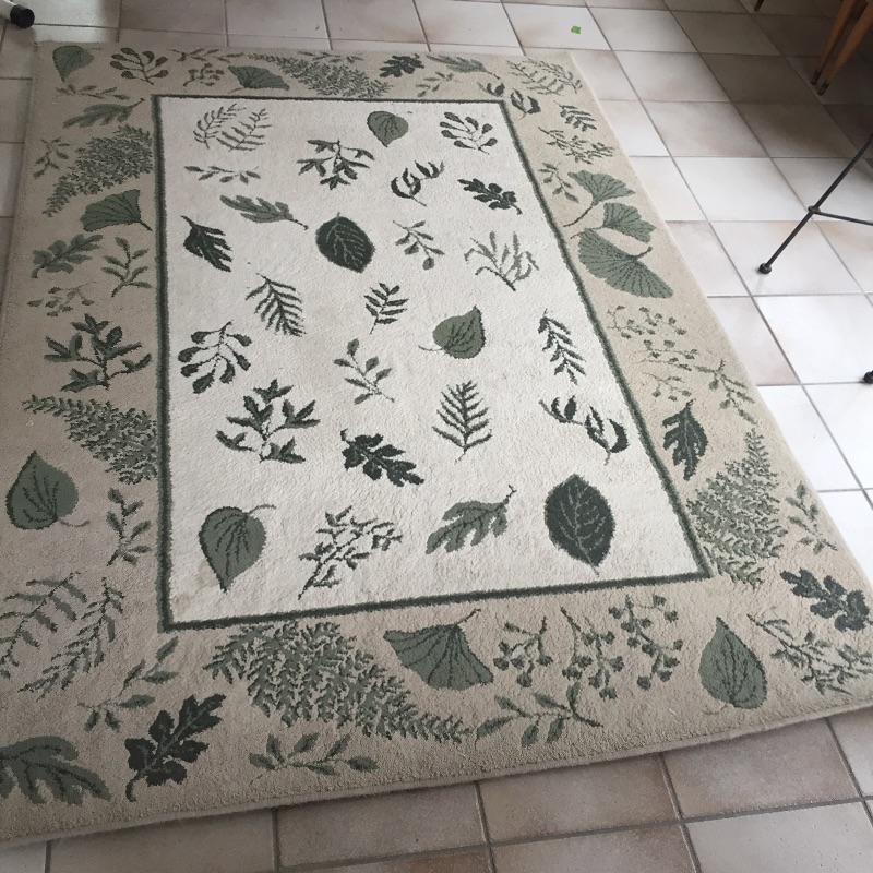 Great pair of rugs for any rooms. Darker floral rug has stains on back(see pictures) and measures 60” x 84”. Rug with green leaves Measures 63” x 90”. Both are in decent condition and just need cleaning. They come from a home with cats.