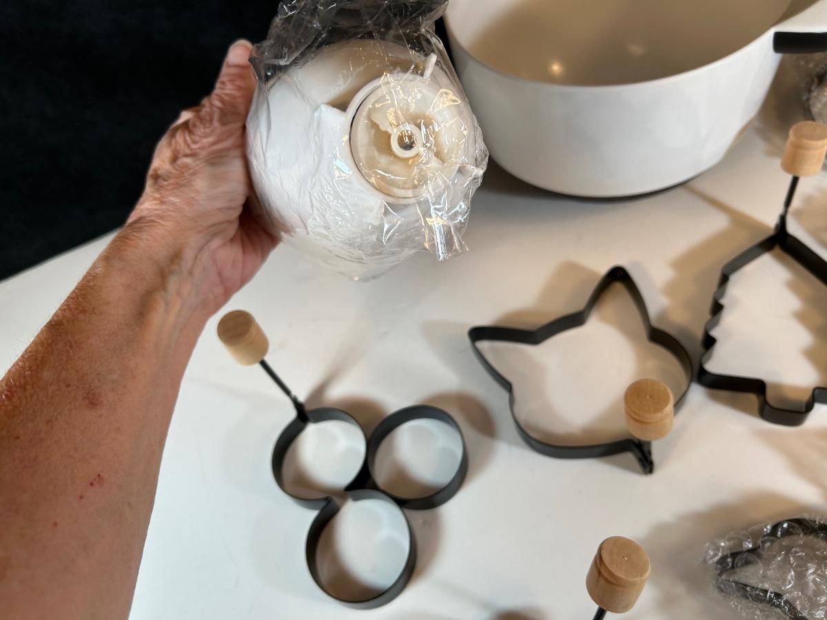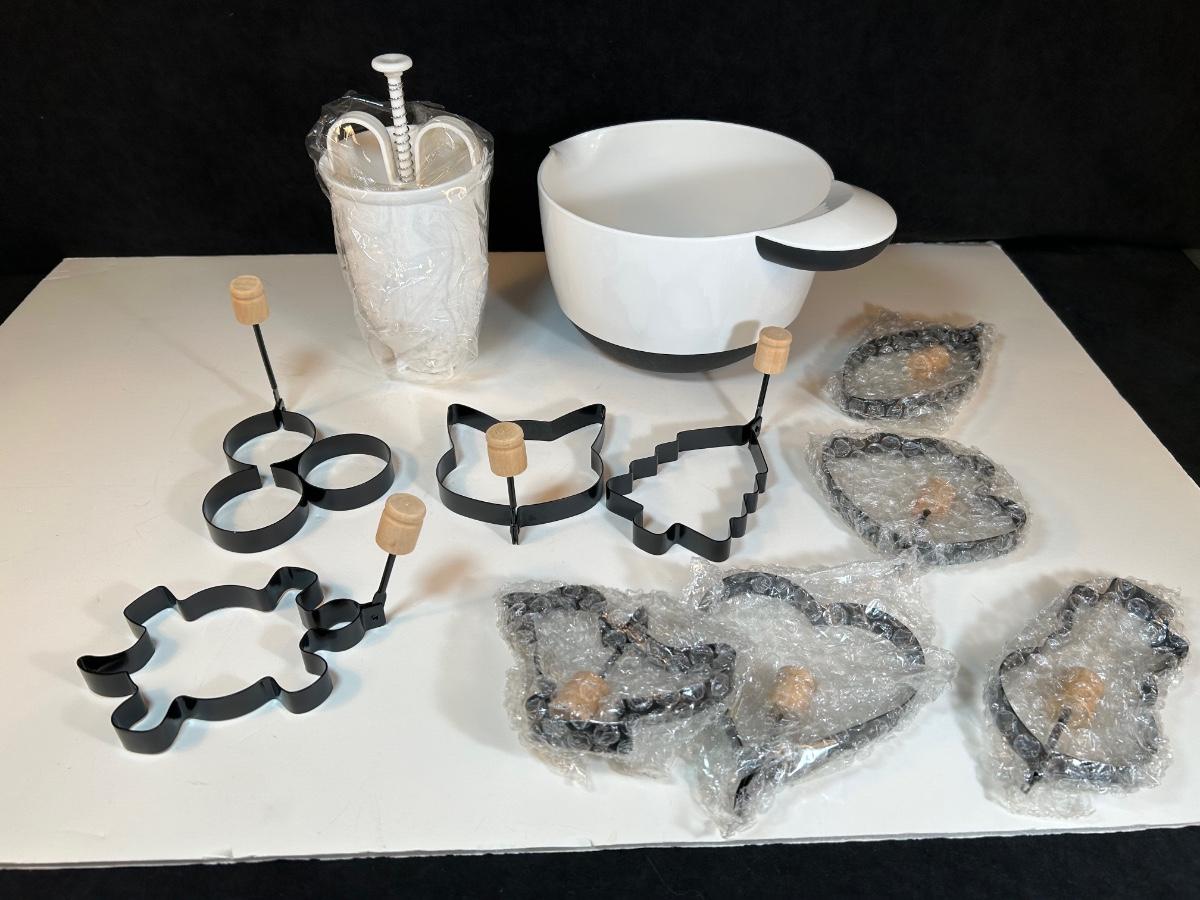 Includes mixing bowl, batter dispenser and nine pancake metal forms in different shapes
