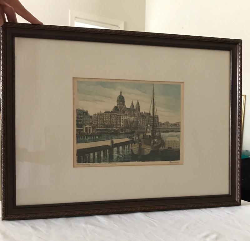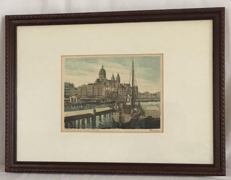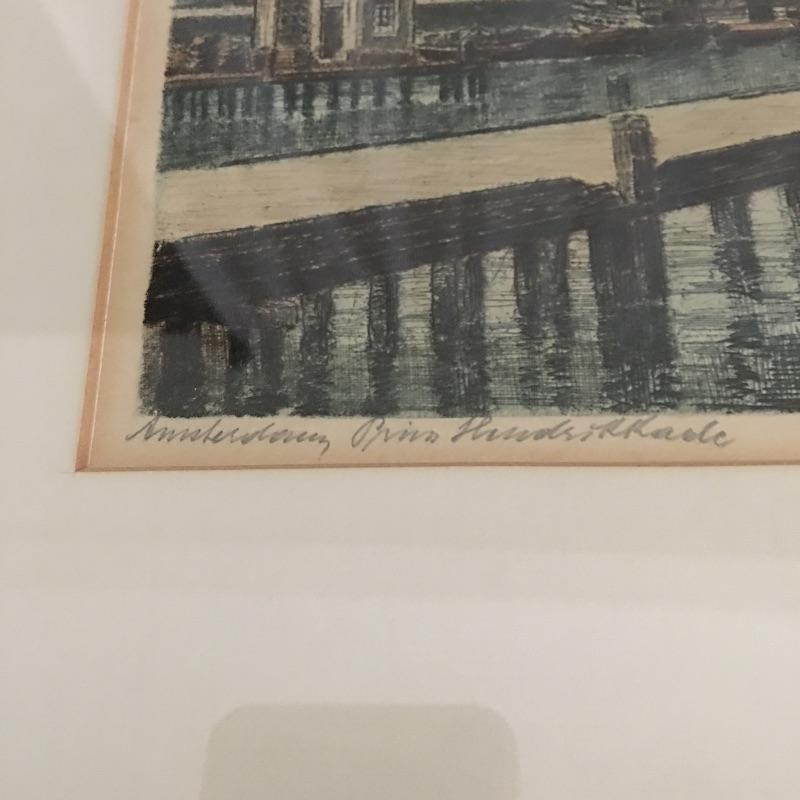 Pencil signed engraving of Amsterdam. Enchanting engraving is pencil signed, framed and matted to look great on any wall. Frame measures 15.5” x 21”.