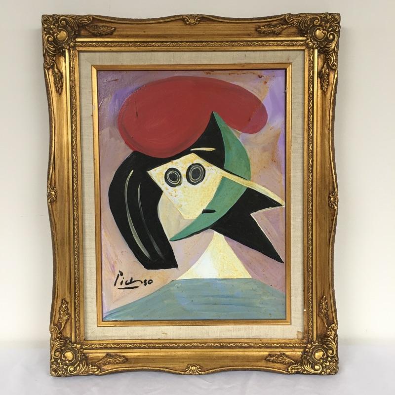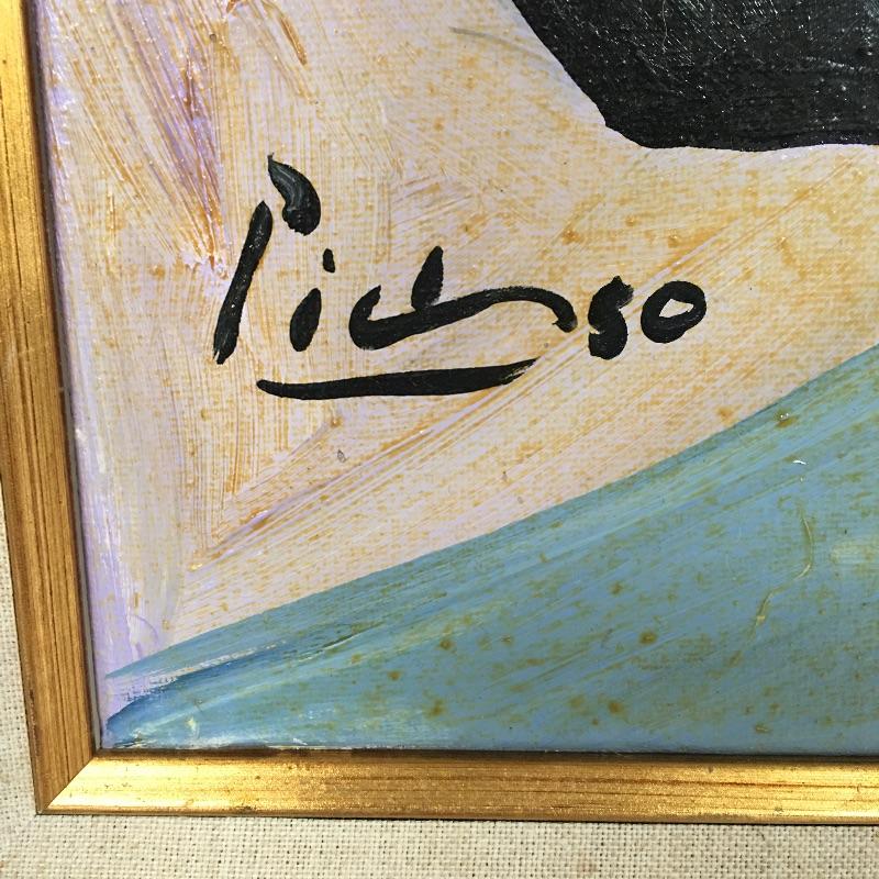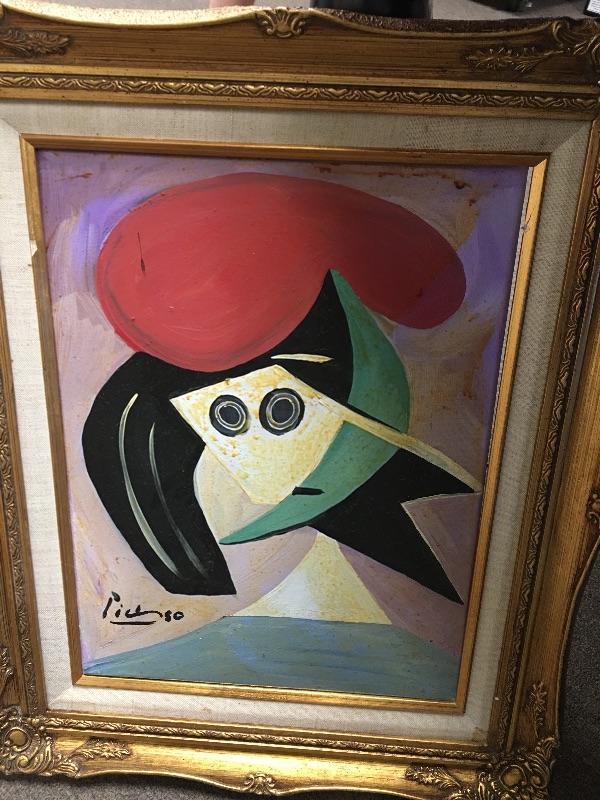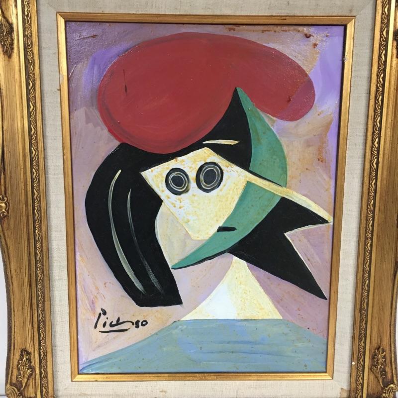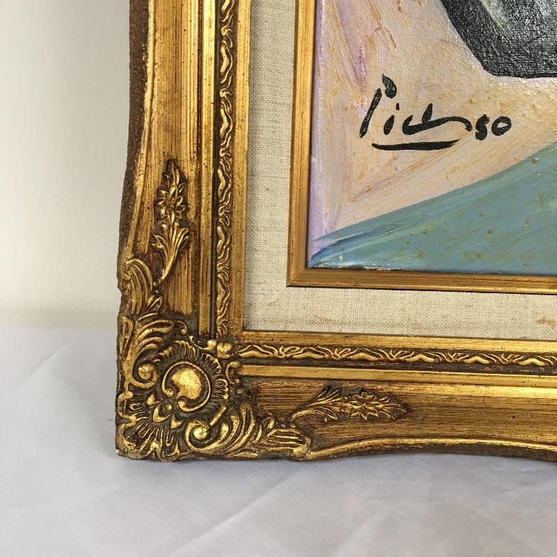 Painting in the style of Picasso in a detailed gold frame. Frame measures 17.5” x 21.5”. Has Stickers from NY Gallery attached to back. Some yellowing on painting that may or may not have been purposely added.