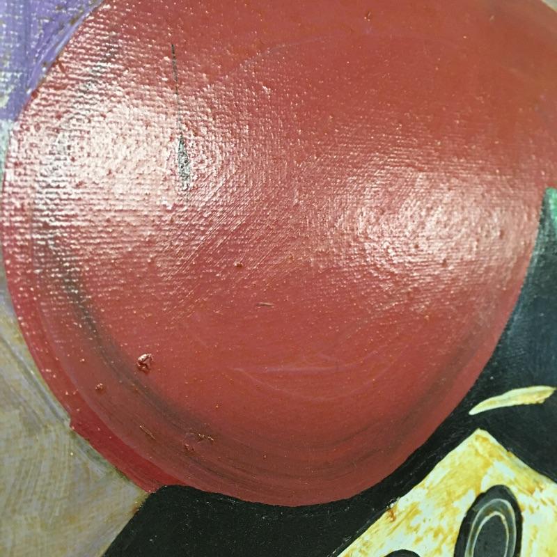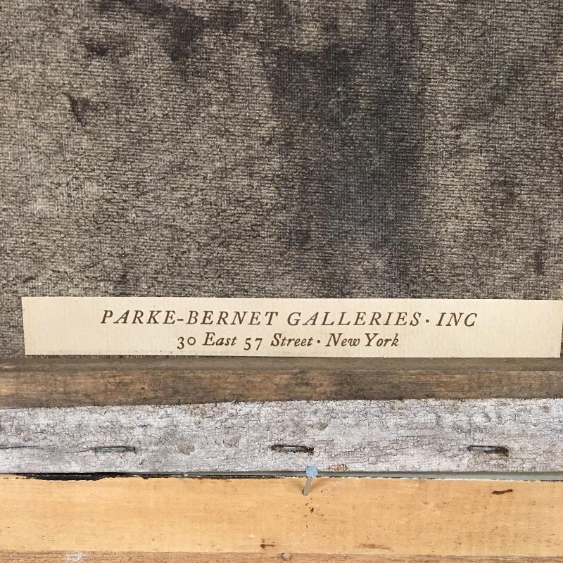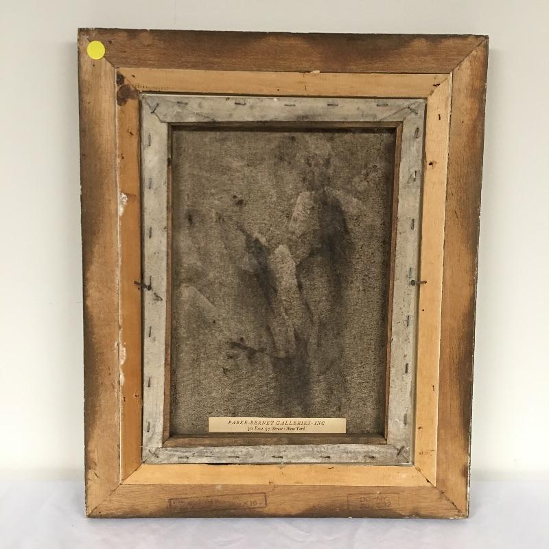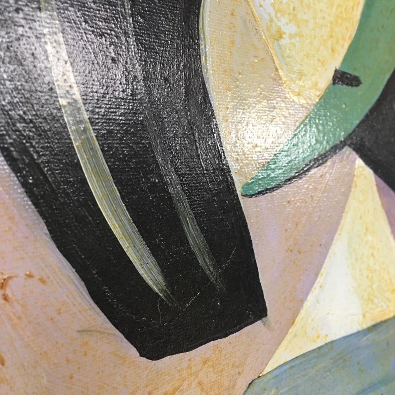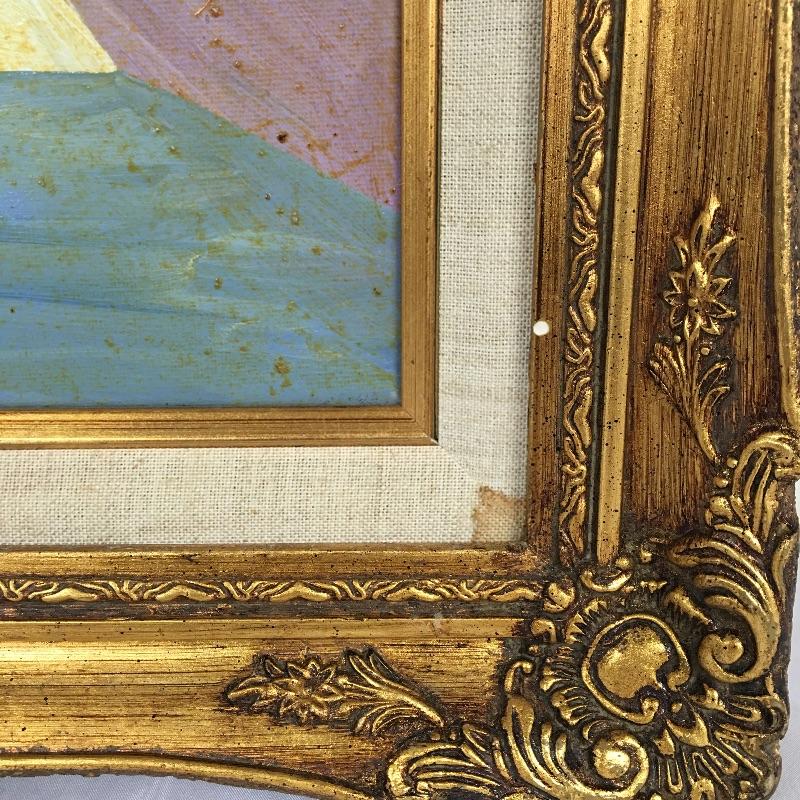 Painting in the style of Picasso in a detailed gold frame. Frame measures 17.5” x 21.5”. Has Stickers from NY Gallery attached to back. Some yellowing on painting that may or may not have been purposely added.