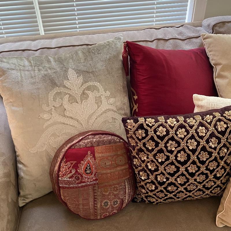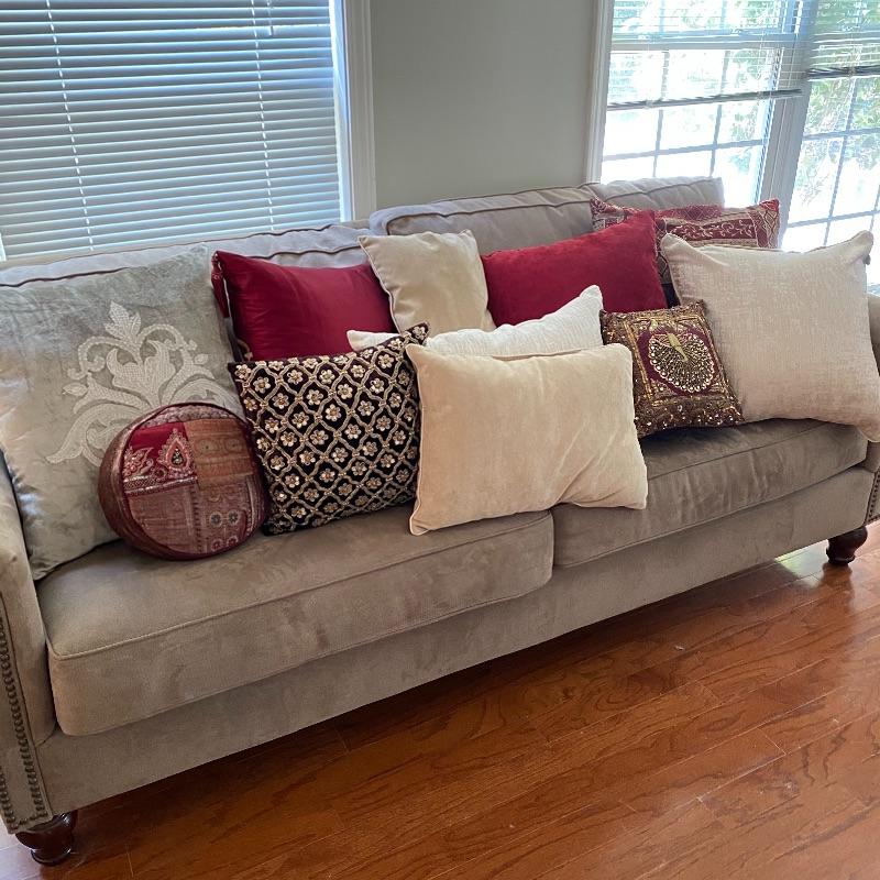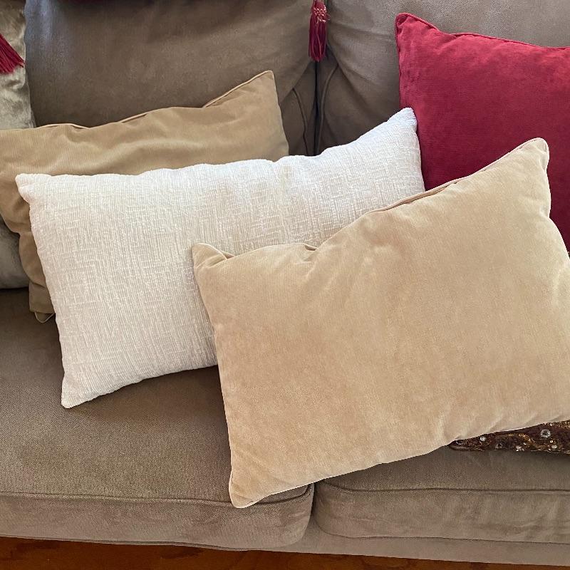 This plethora of pillows includes 11 pillows in a variety of styles, shapes and materials. A nice collection of accent pillows for your couches and beds. Largest pillow measures 18” x 18”. Sofa not included but available in lot 5.