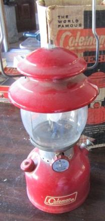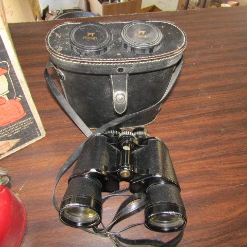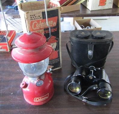 LOT 4  RED COLEMAN LANTERN & BINOCULARS