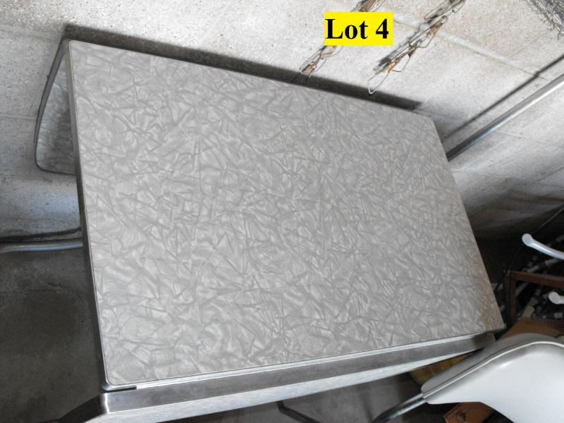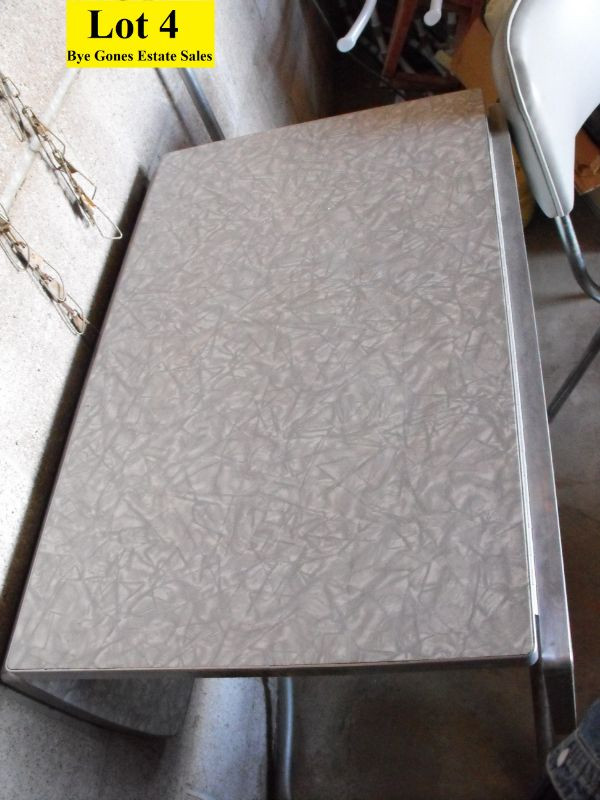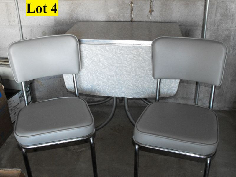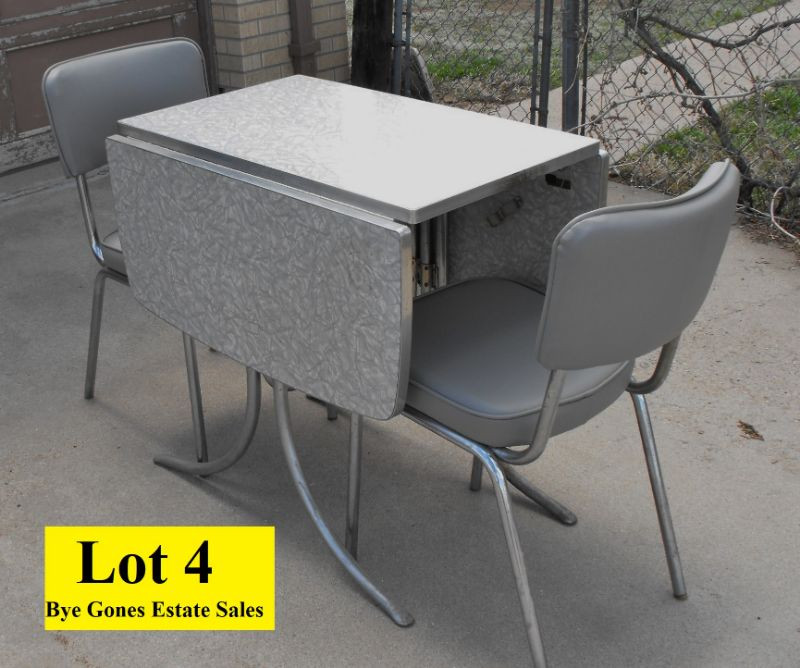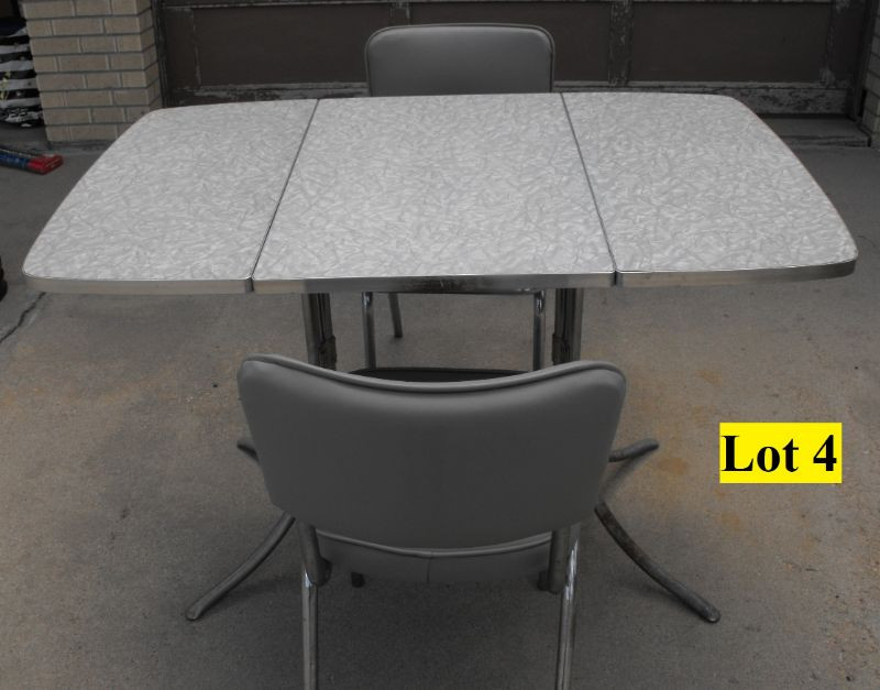 Table measures 45”x 29” with leaves up and 18” x 29” with leaves down. Some rust on the bottom of table leg otherwise condition is Very Good. Chairs have gray vinyl seat and back rest with metal frame and are in Very Good condition.