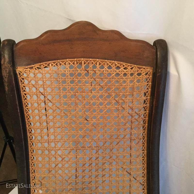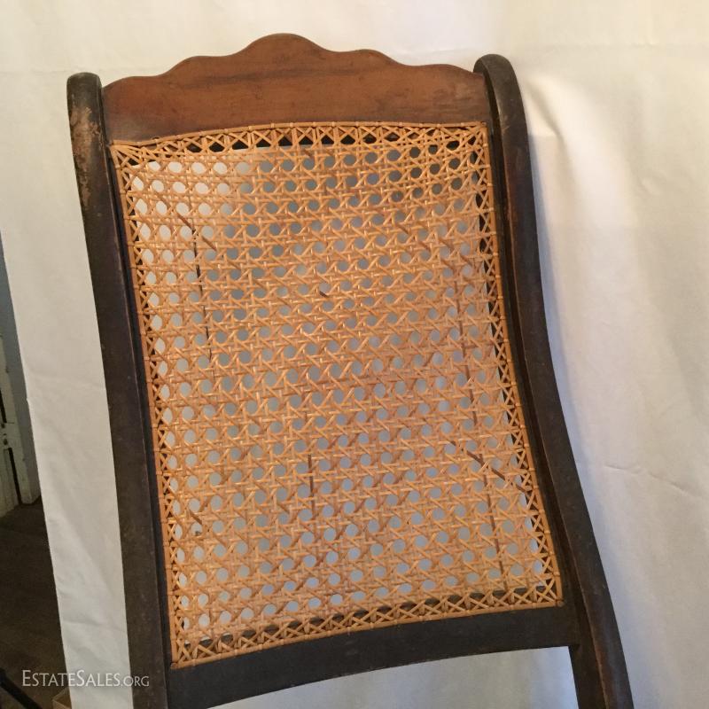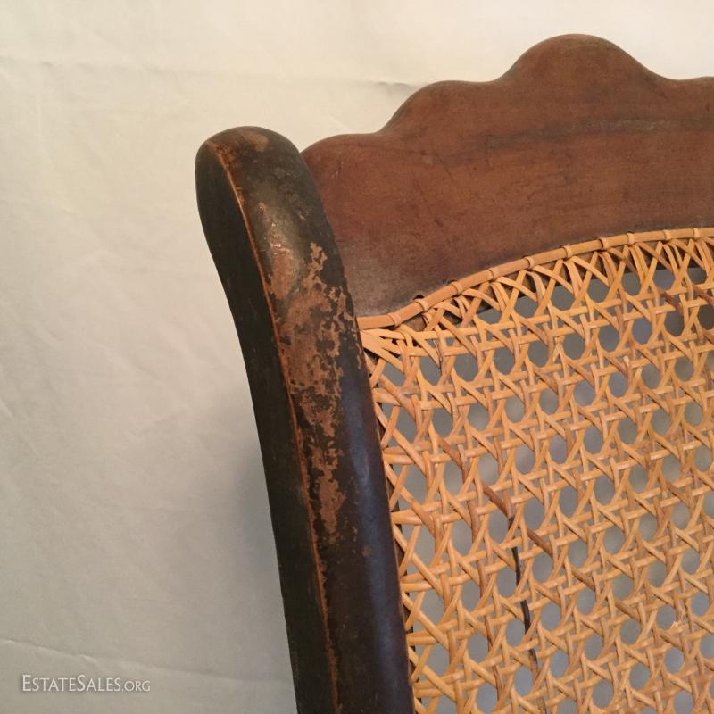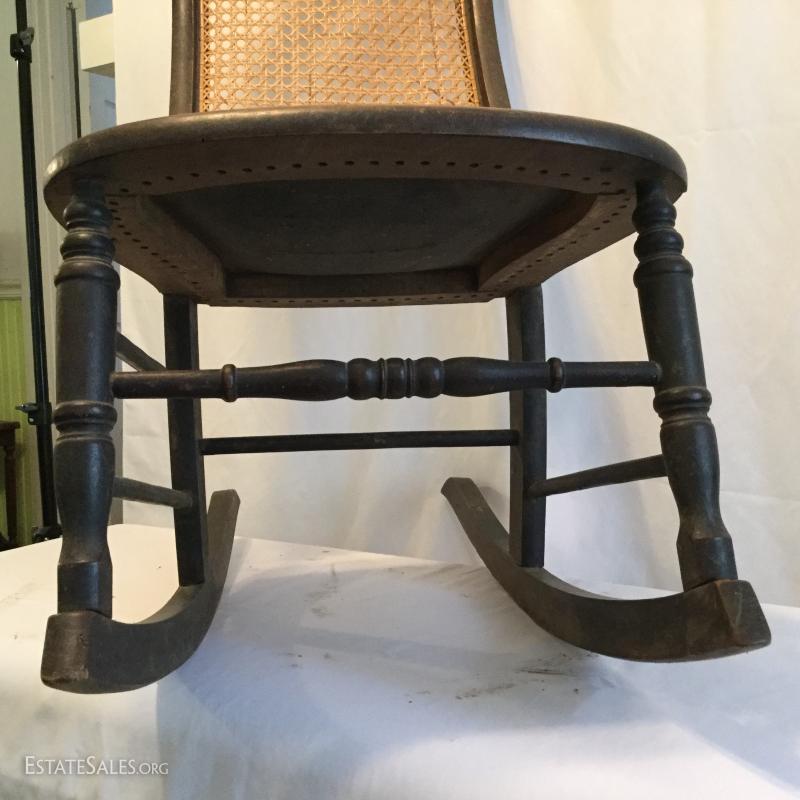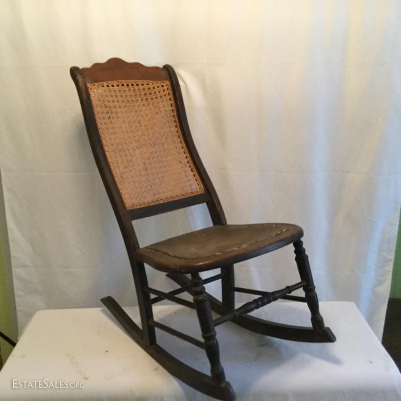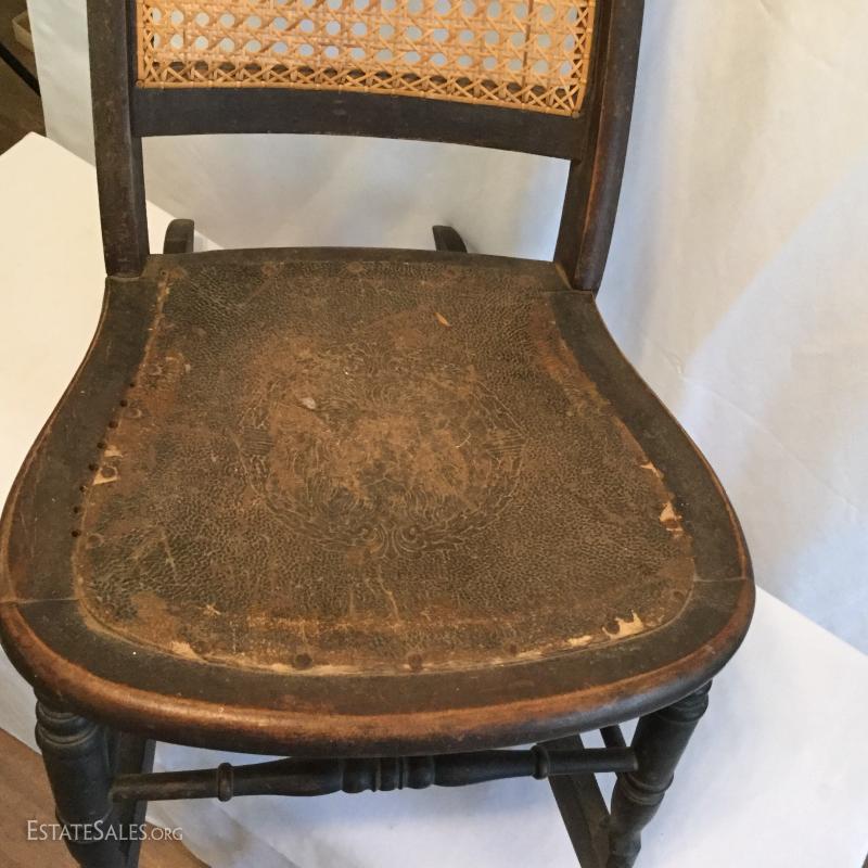 Cane rocker with what appears to be a pressed leather seat: 18" L x 29.5" W x 34.5" H.