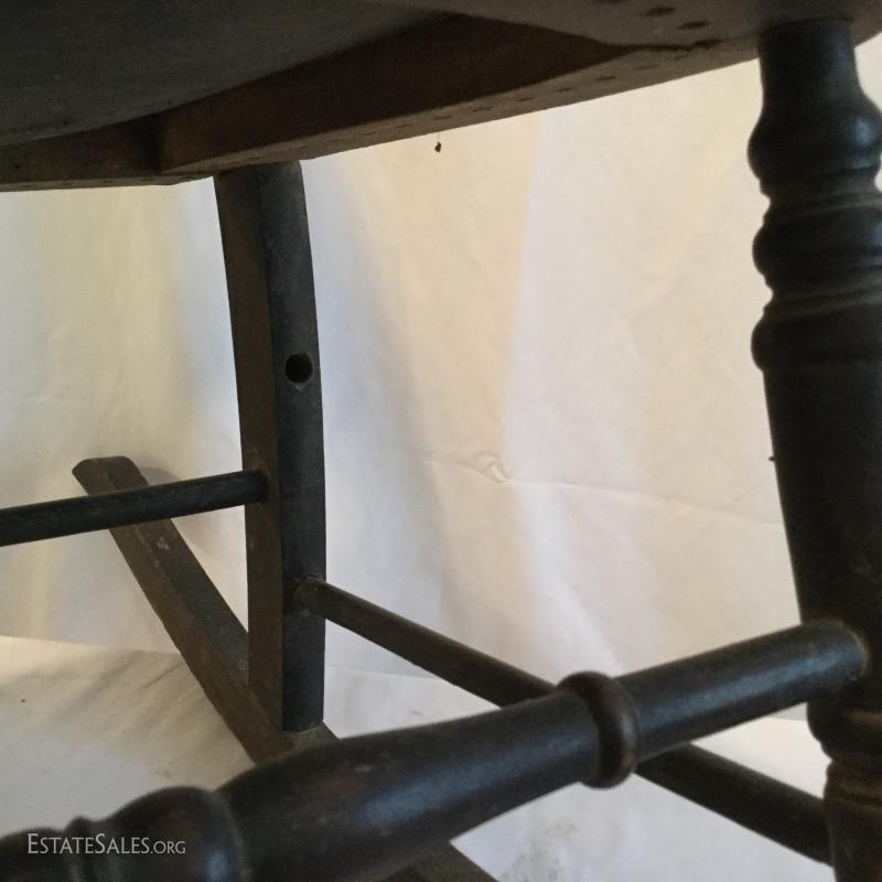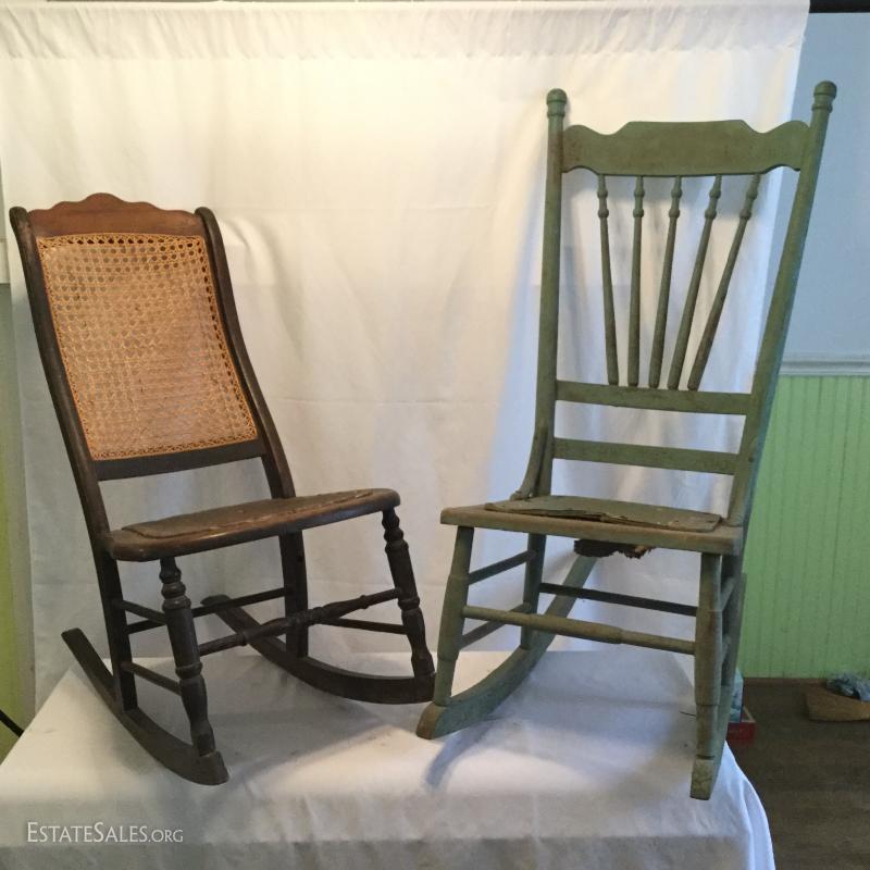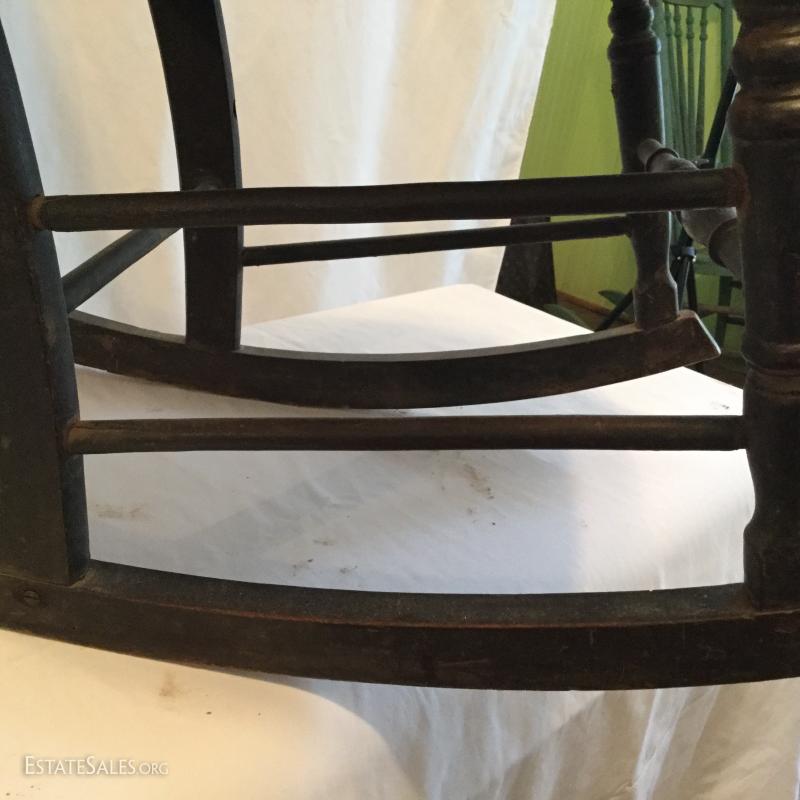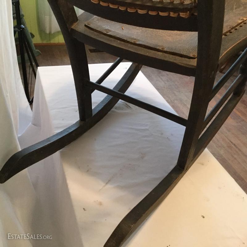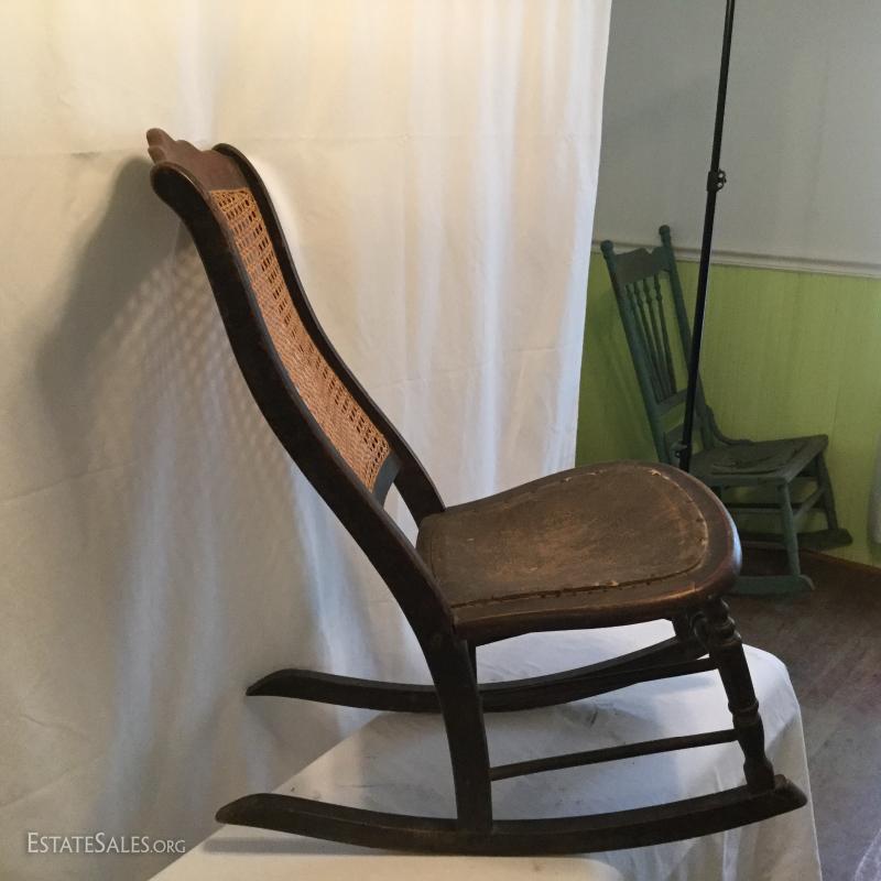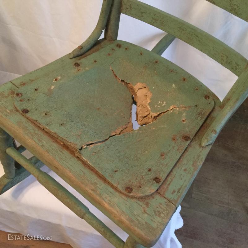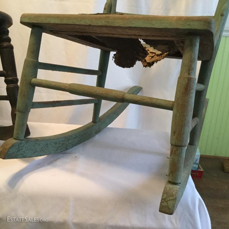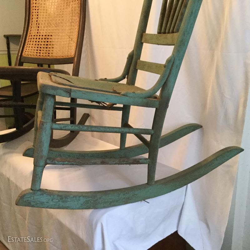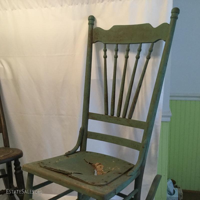 Green, painted rocking chair:( broken seat) 20"L x 31" W x 42" H.