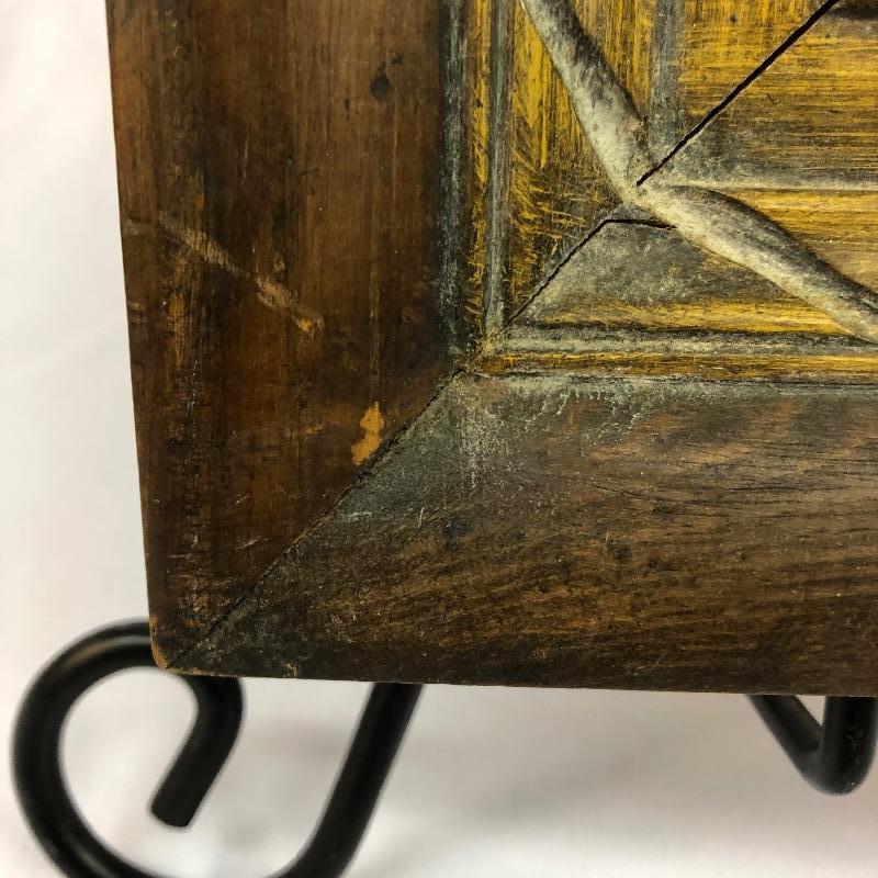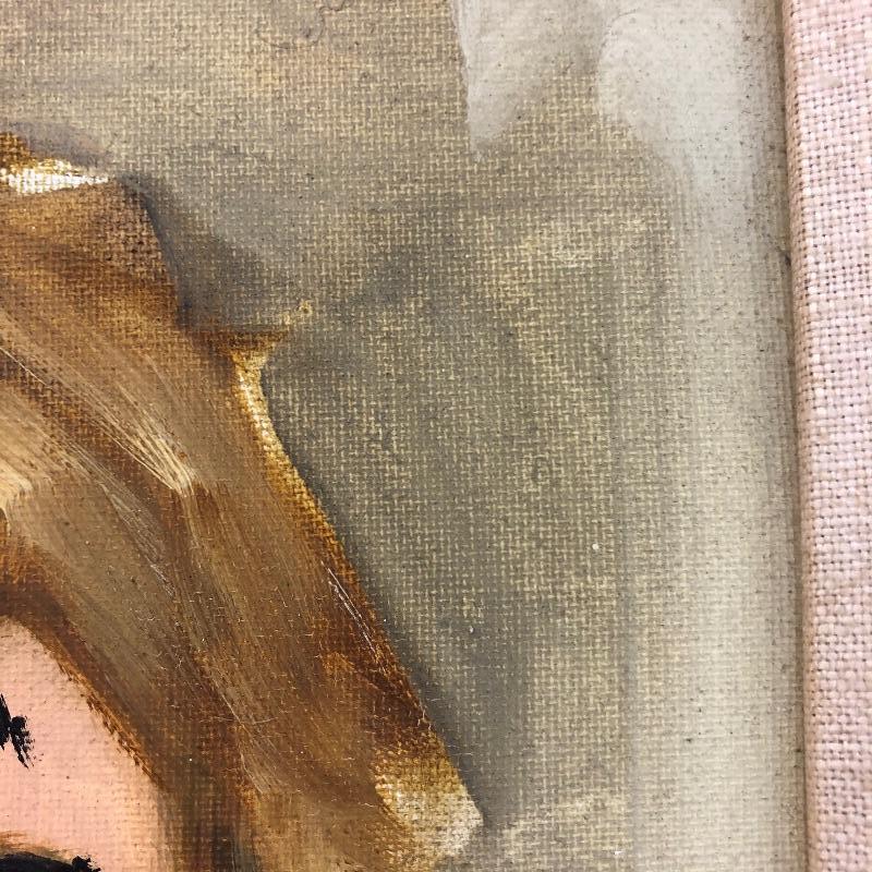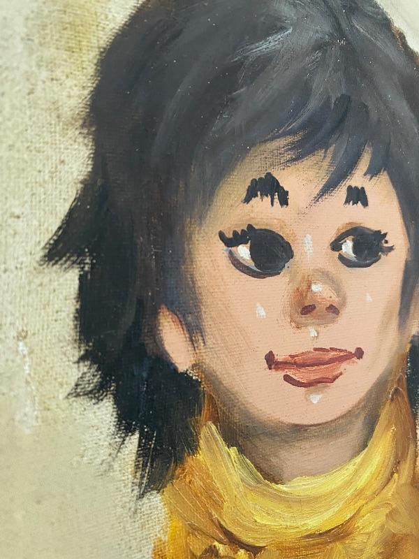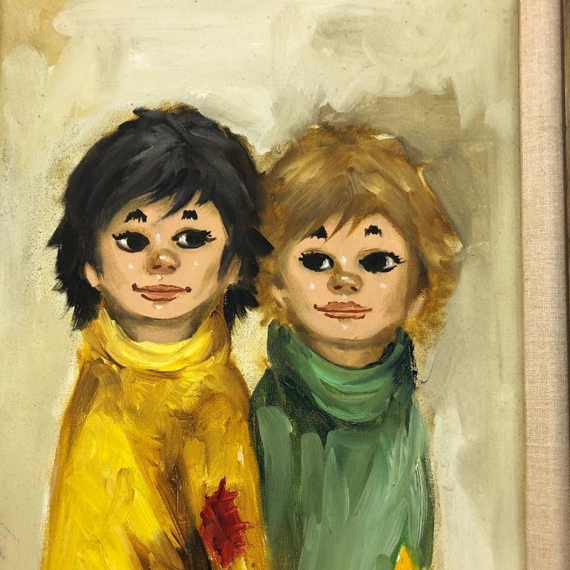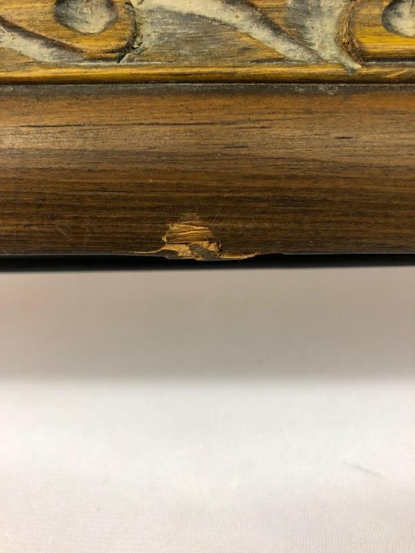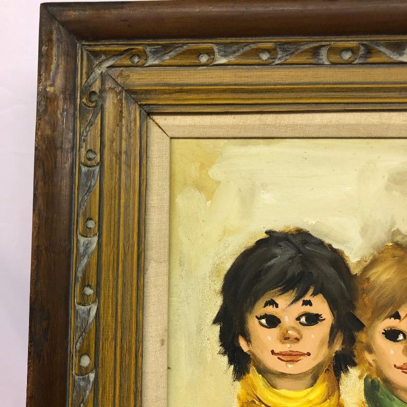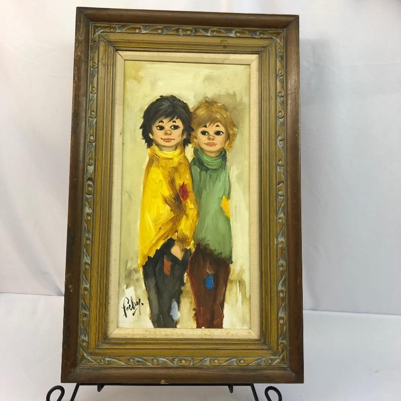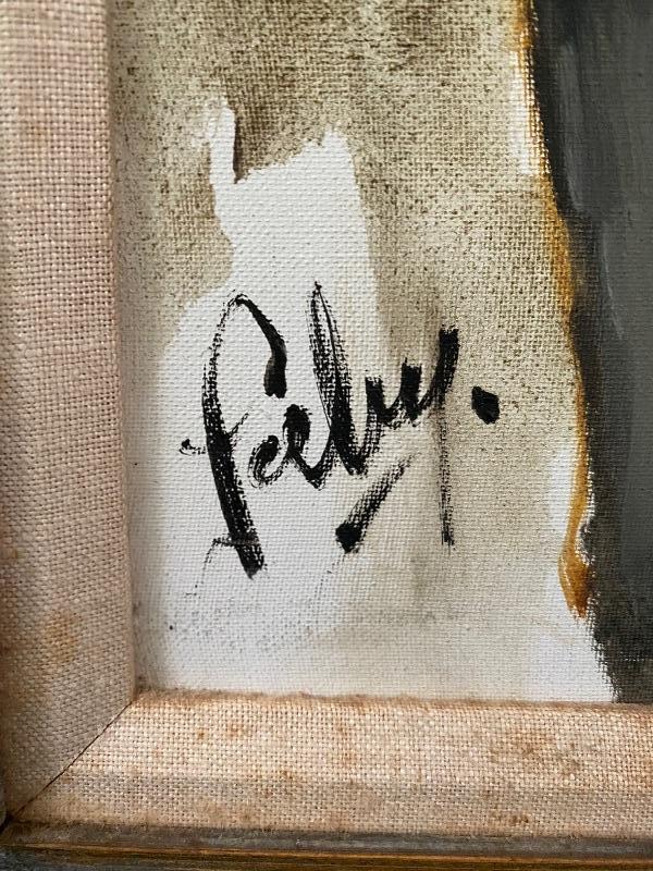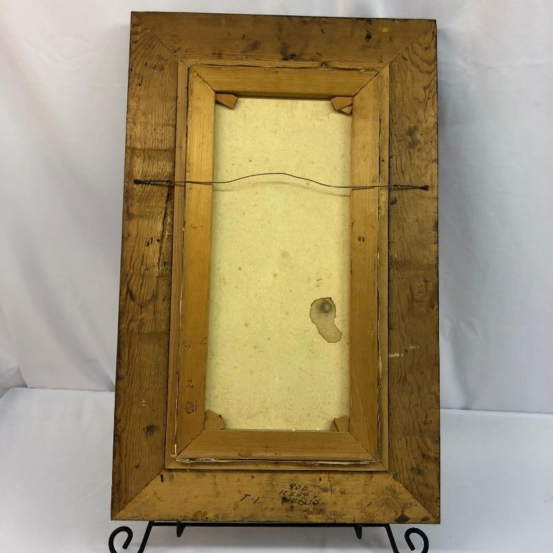 Striking oil painting in vibrant colors that really catch your eye! This piece appears to have some age to it, although no date was found, it is signed, see images. Housed in a gorgeous wood frame, the piece measures 30” x 32”. There is a small nick in the bottom of frame, see images.