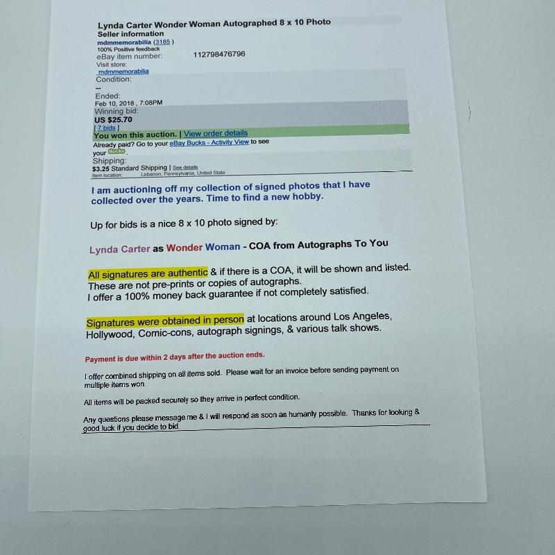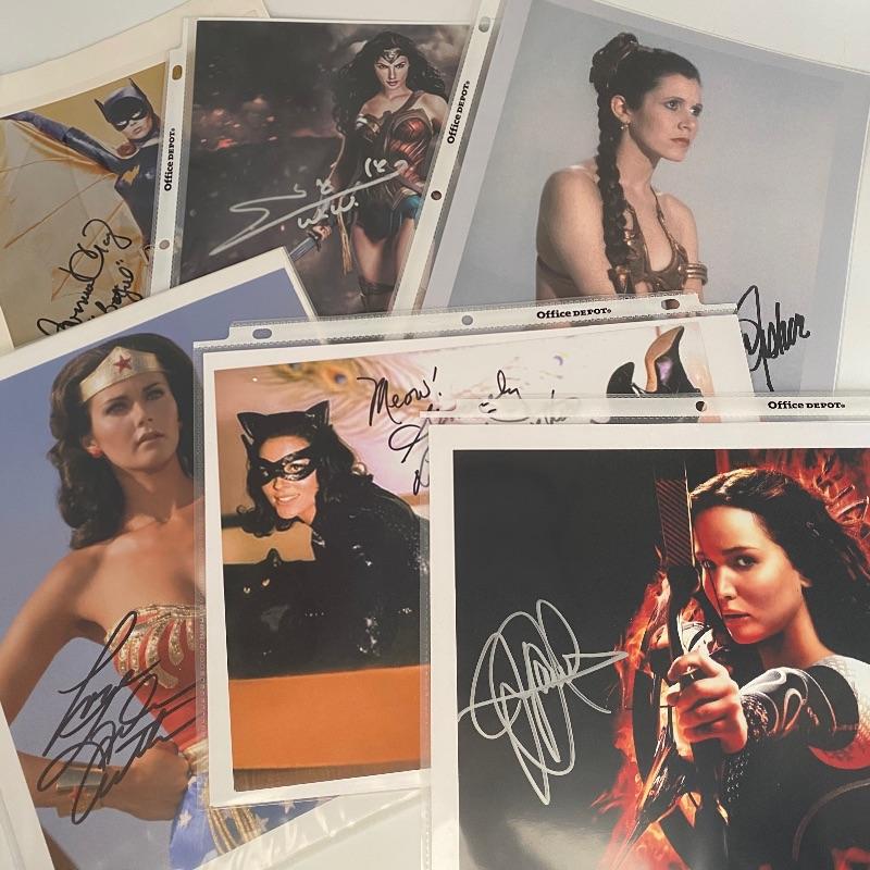 Fierce strong women actresses in this group. We've got 7 autographed photos of these superheroes: Wonder Woman (Linda Carter, Gal Gadot, Adrianne Palicki), Katniss Everdeen (Jennifer Lawrence), Princess Leia (Carrie Fisher), Catwoman (Lee Meriwether) and Batgirl (Yvonne Craig). All photos except Yvonne Craig have a COA. The Catwoman photo includes a photo of Lee Meriwether signing the photo!