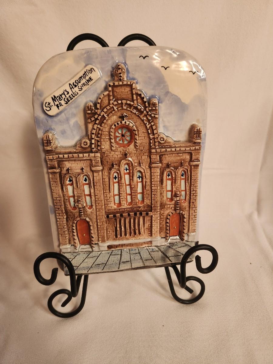 St. Mary's Assumption Church and Seelos Shrine - Clay Creations on metal stand - signed. 6" x 8.5". Good condition. This is a harder one to find.