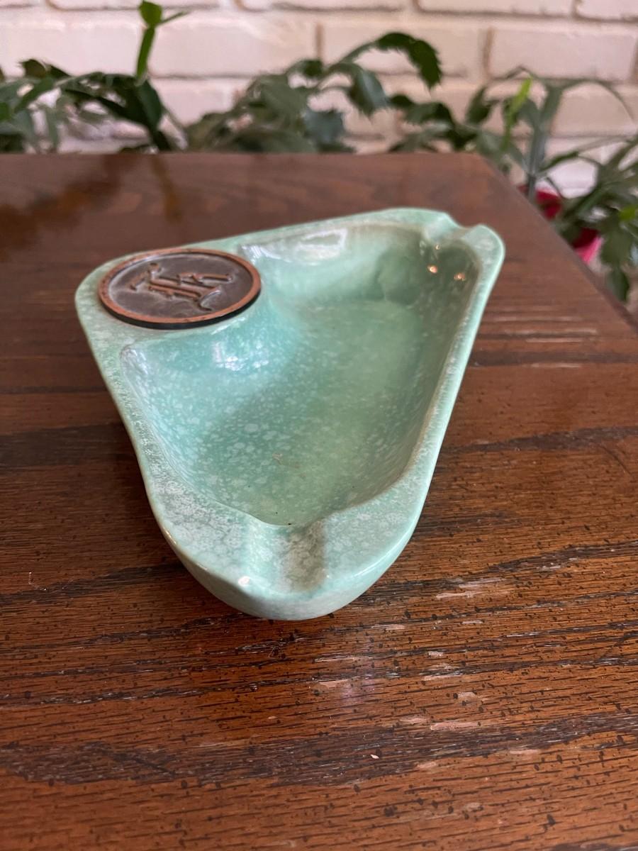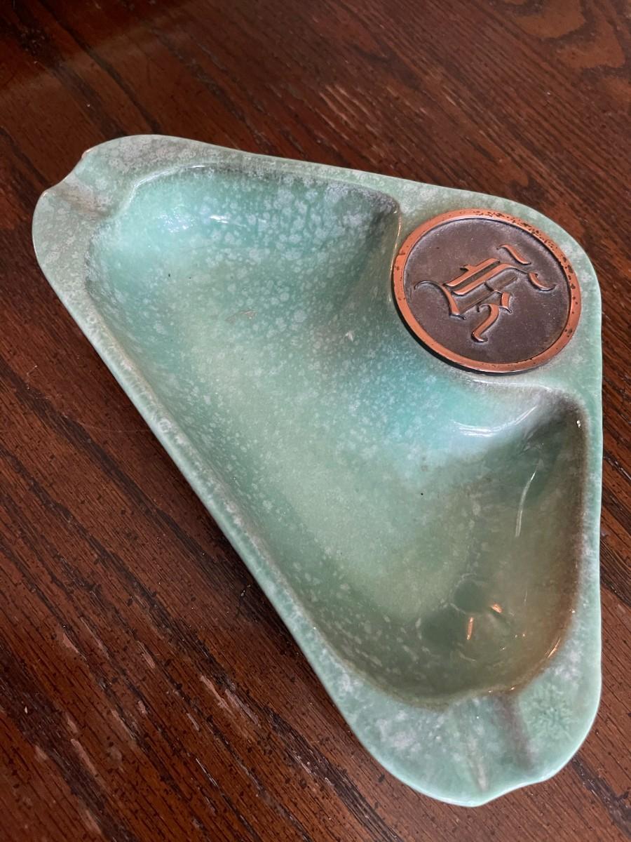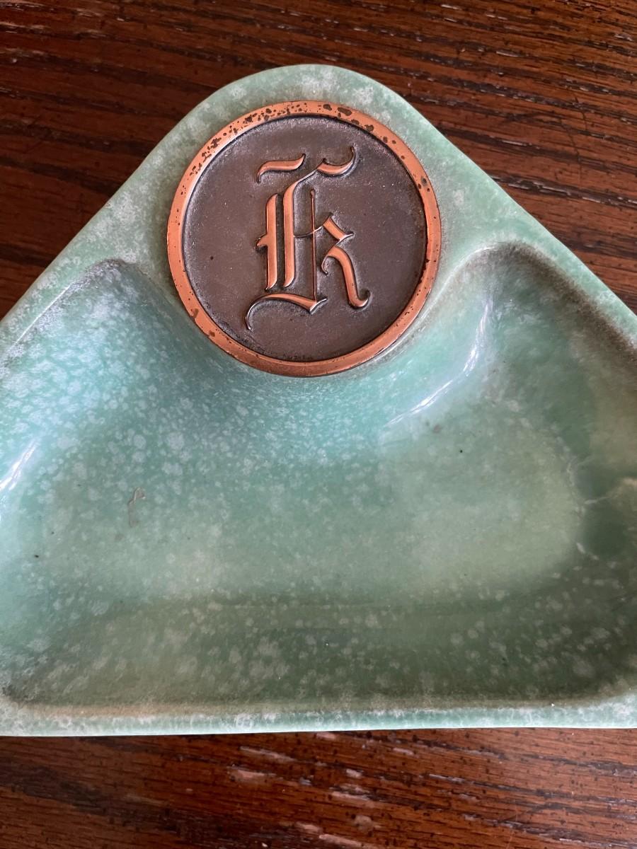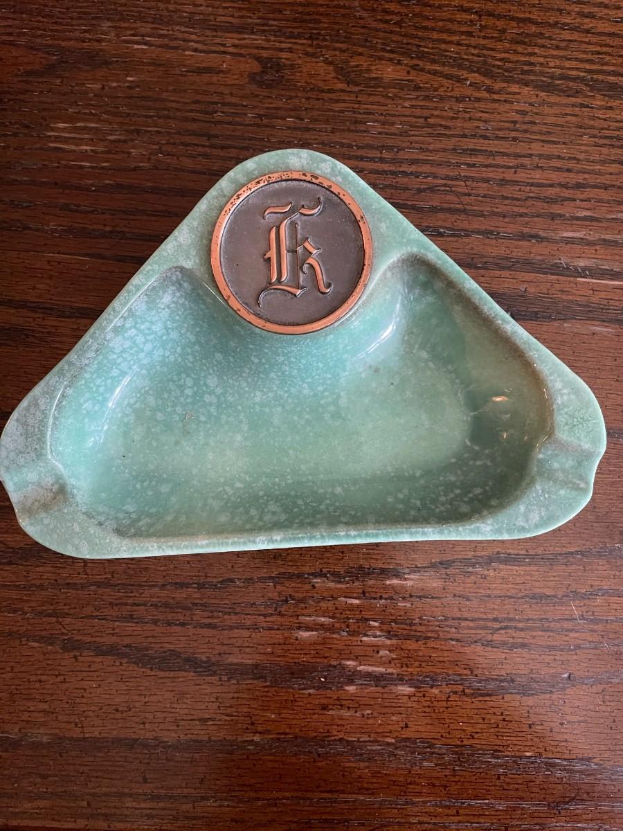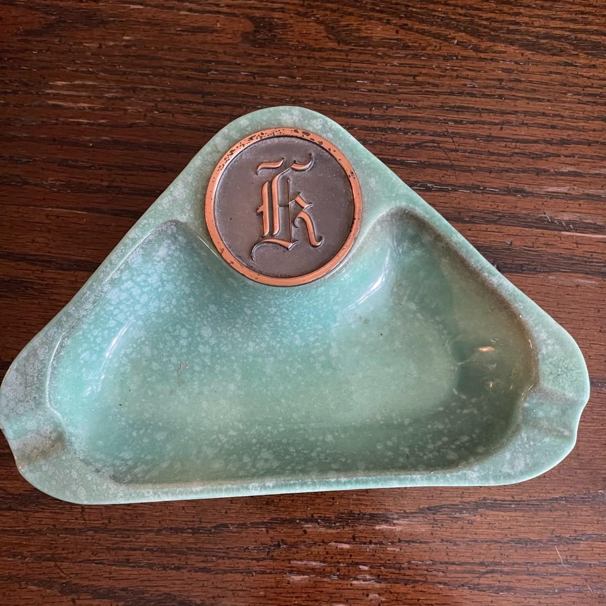Vintage Roseville Pottery, The Hyde Park, No. 1940, "K" Monogram Medallion, Ashtray, blue/green speckled, Triangle shape. Made in the USA. Great for a catch-all if not used as ashtray.