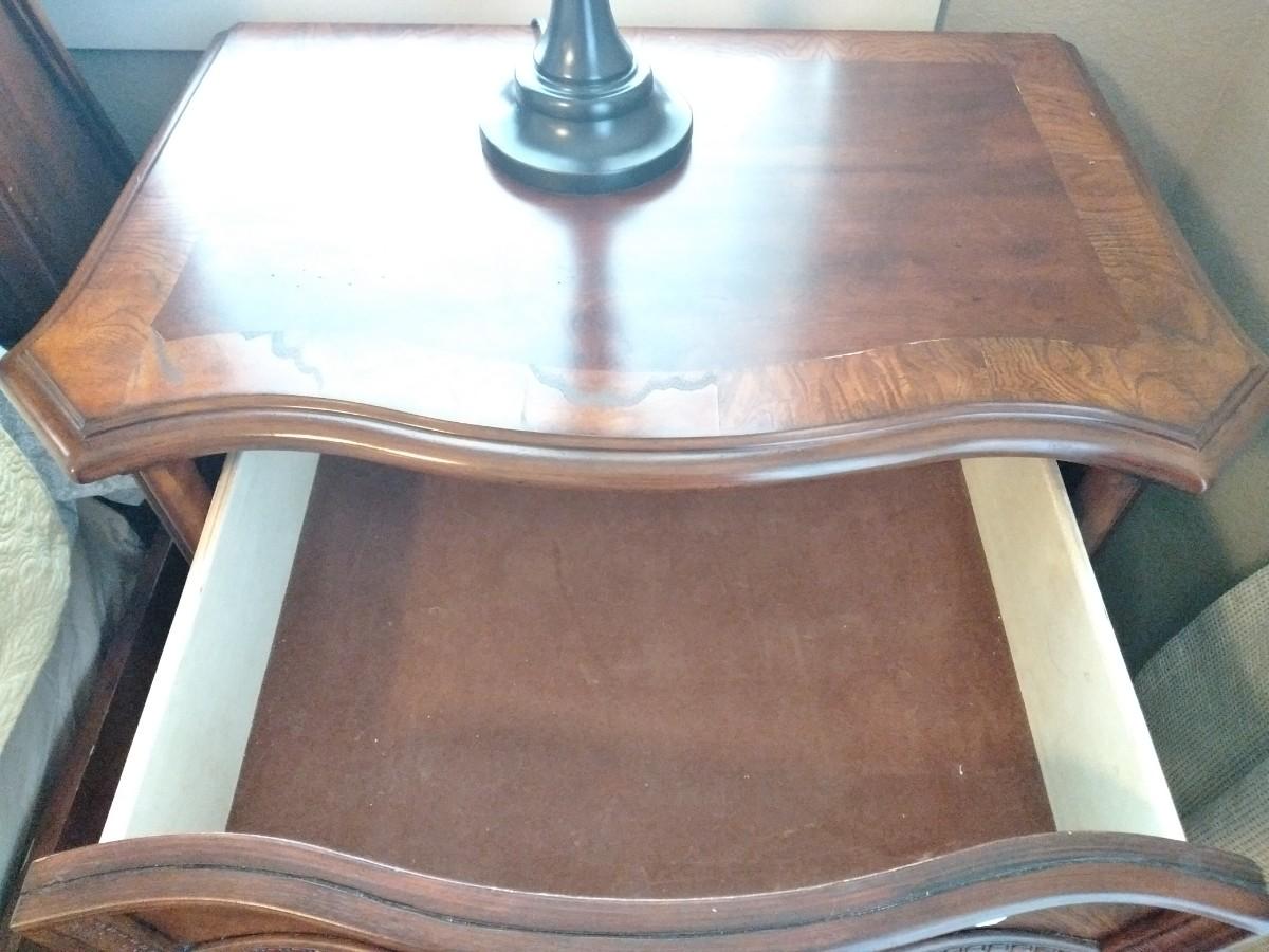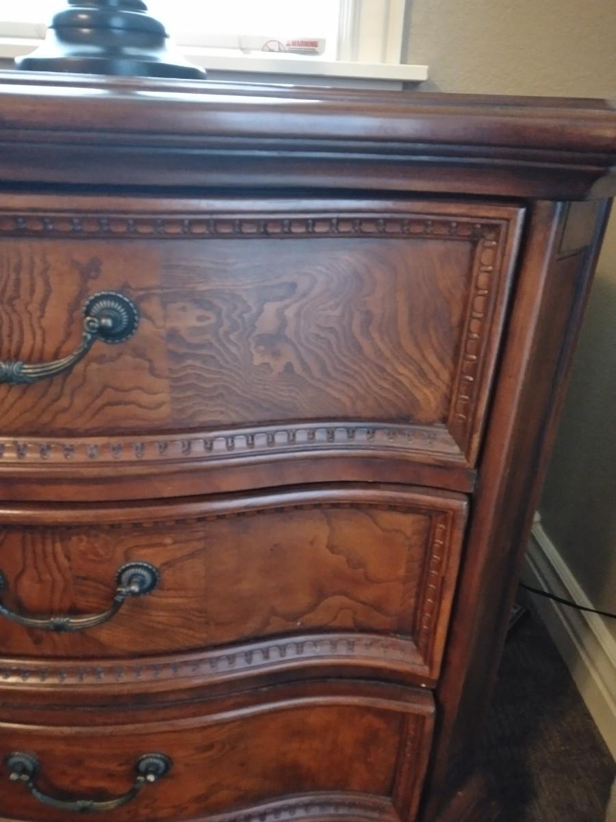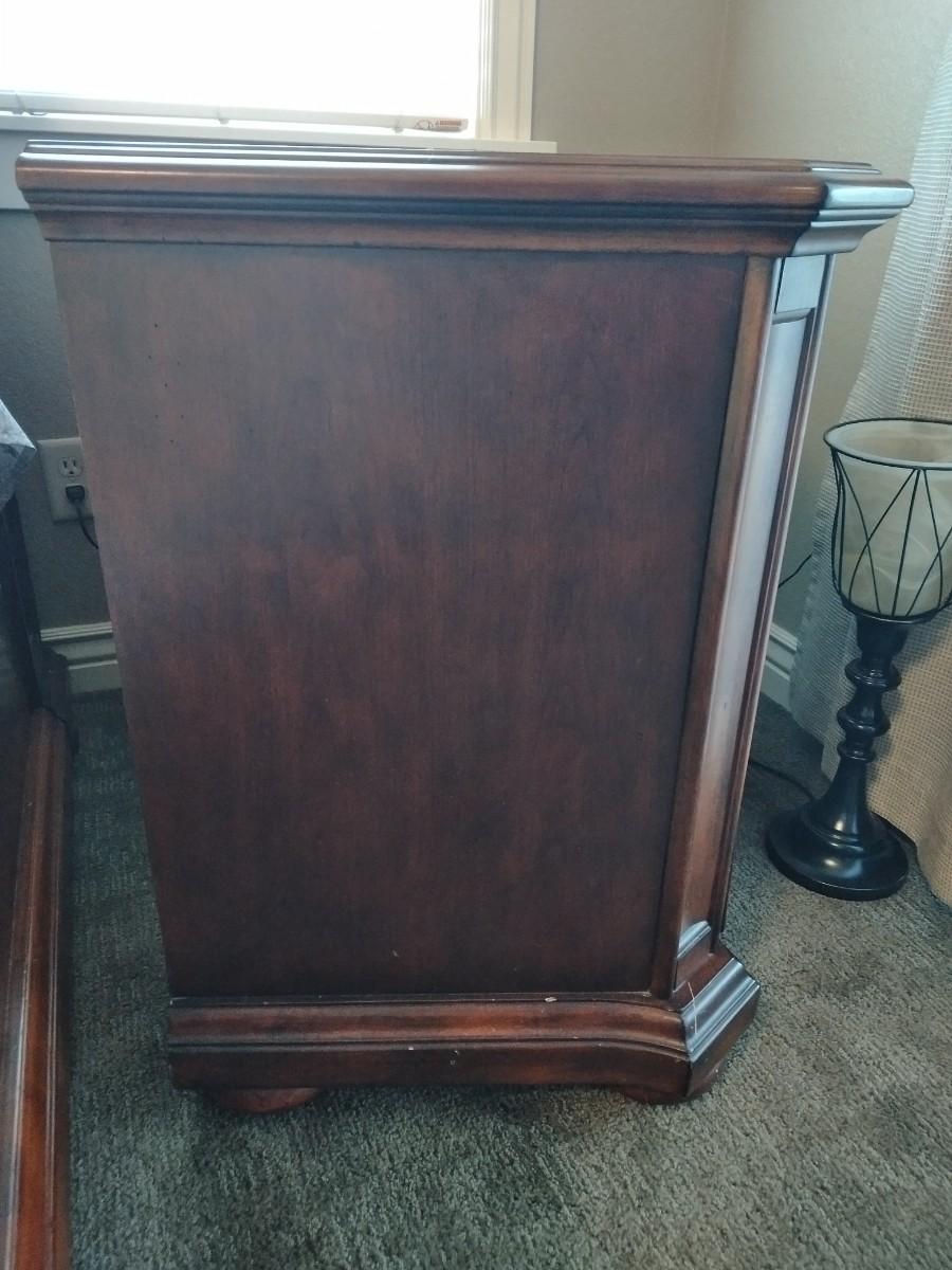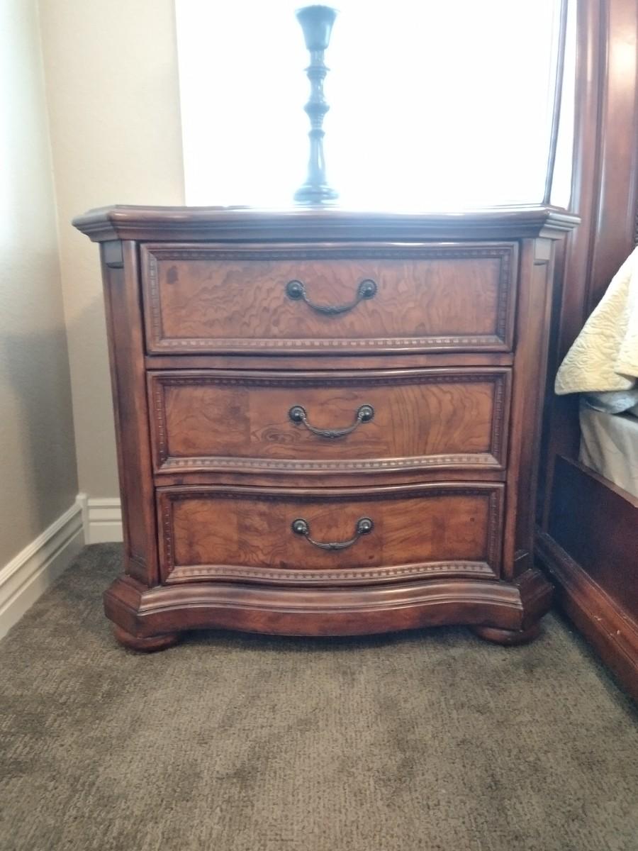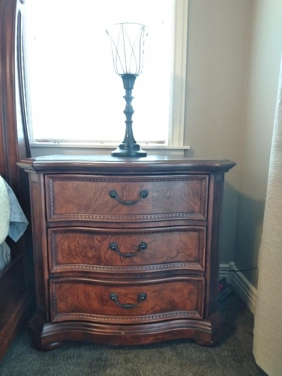 THREE DRAWER NIGHT STAND 30" X 31.5" X 20" INCLUDES GLASS GLOBED TABLE LAMP. NIGHTSTAND MATCHES DRESSER AND NIGHTSTAND IN LOT 5