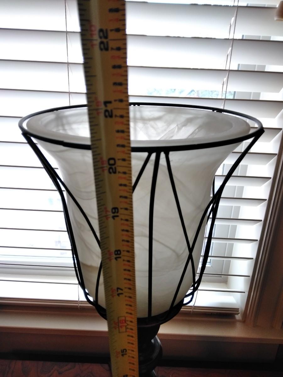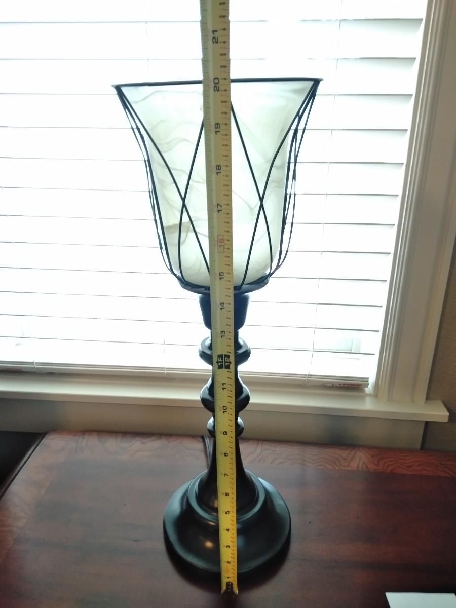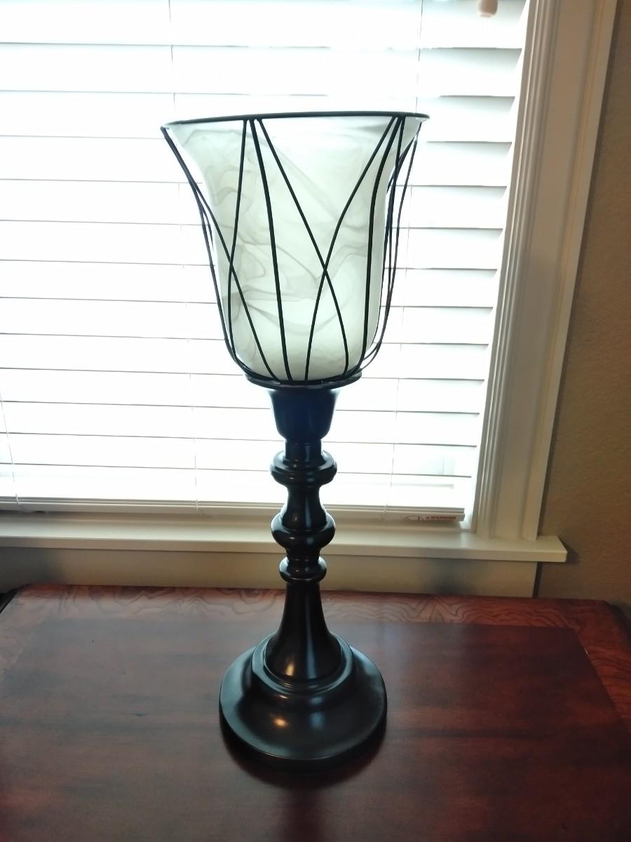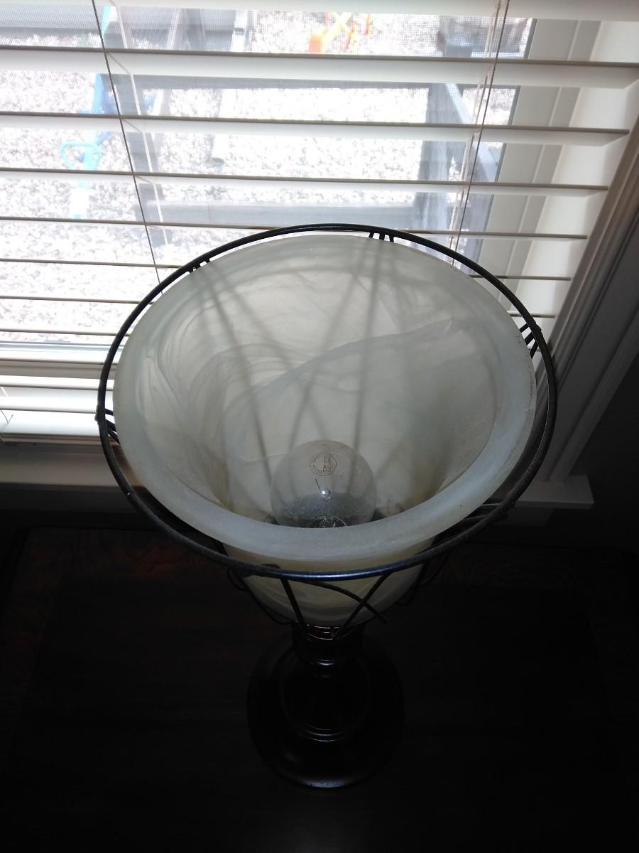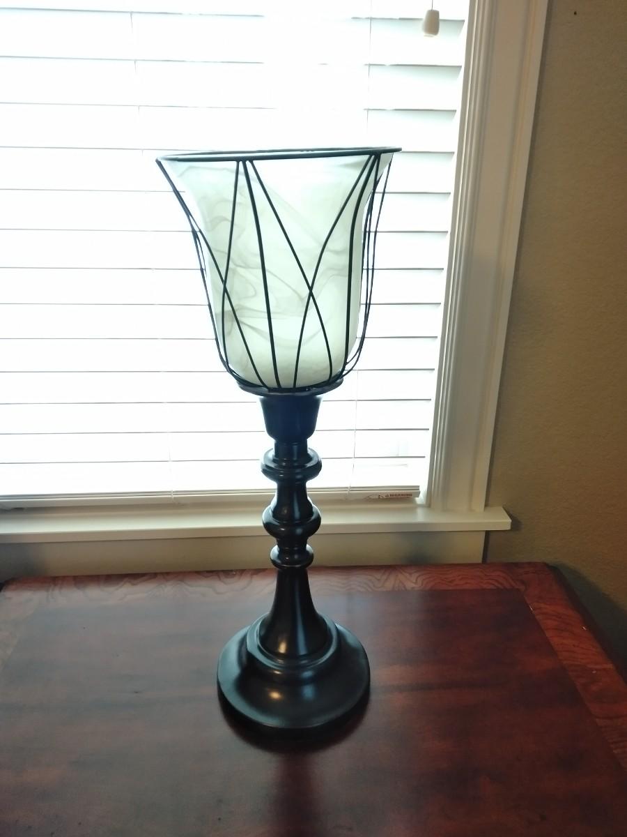 THREE DRAWER NIGHT STAND 30" X 31.5" X 20" INCLUDES GLASS GLOBED TABLE LAMP. NIGHTSTAND MATCHES DRESSER AND NIGHTSTAND IN LOT 5