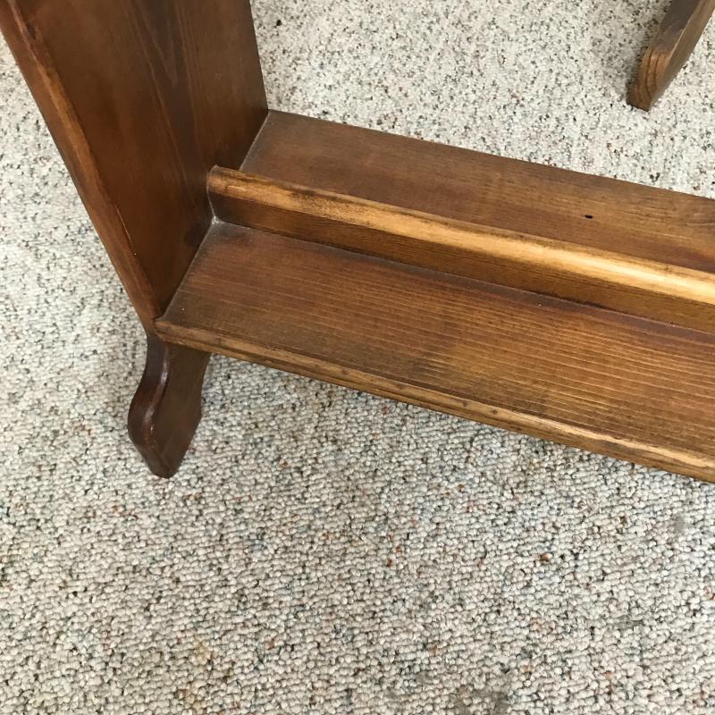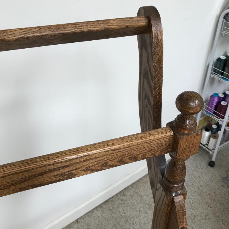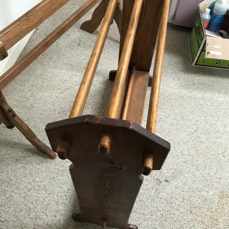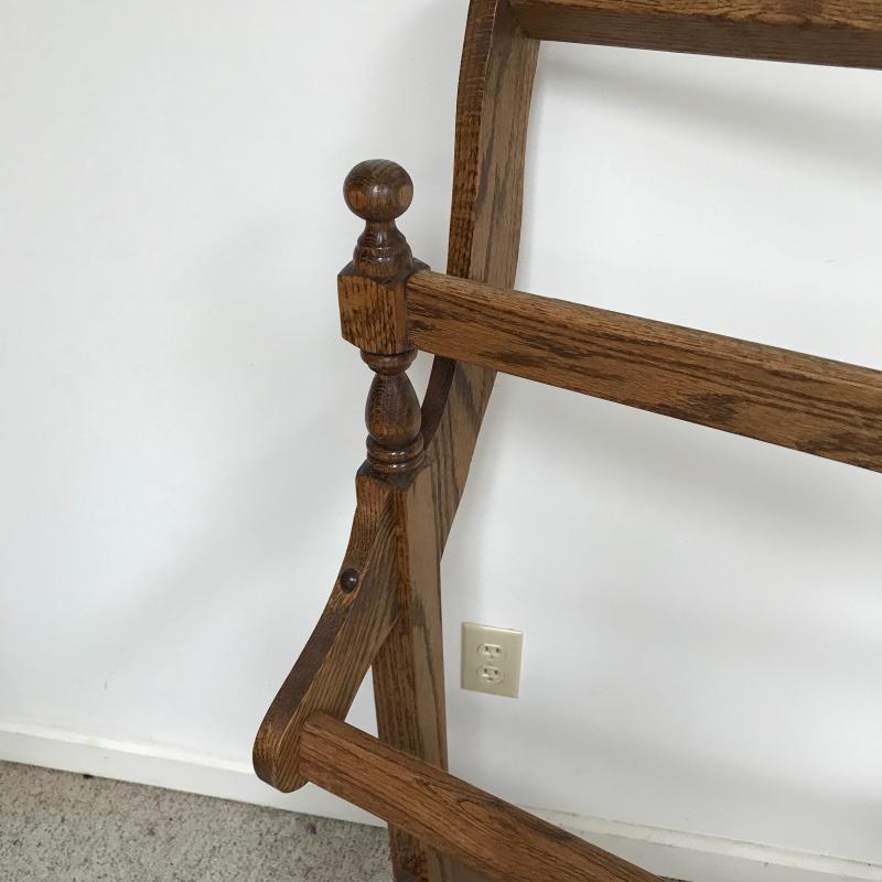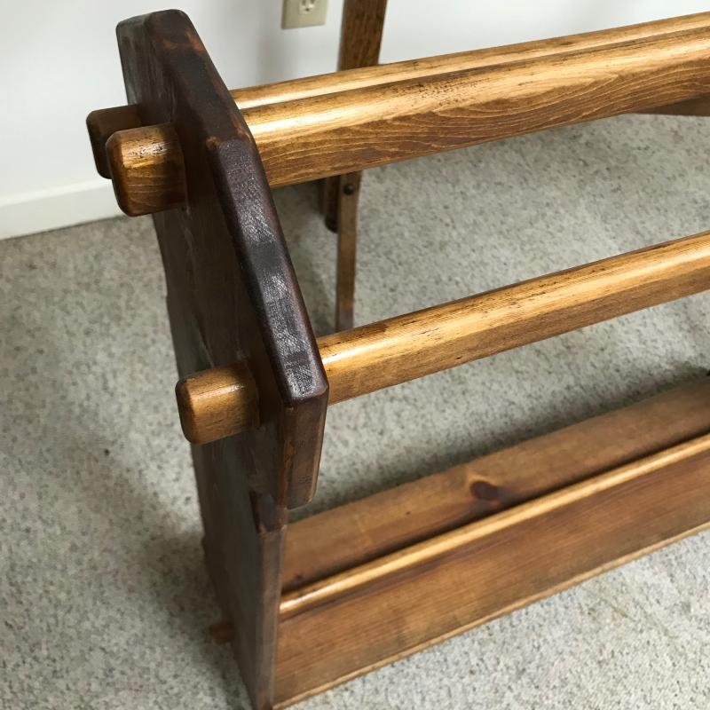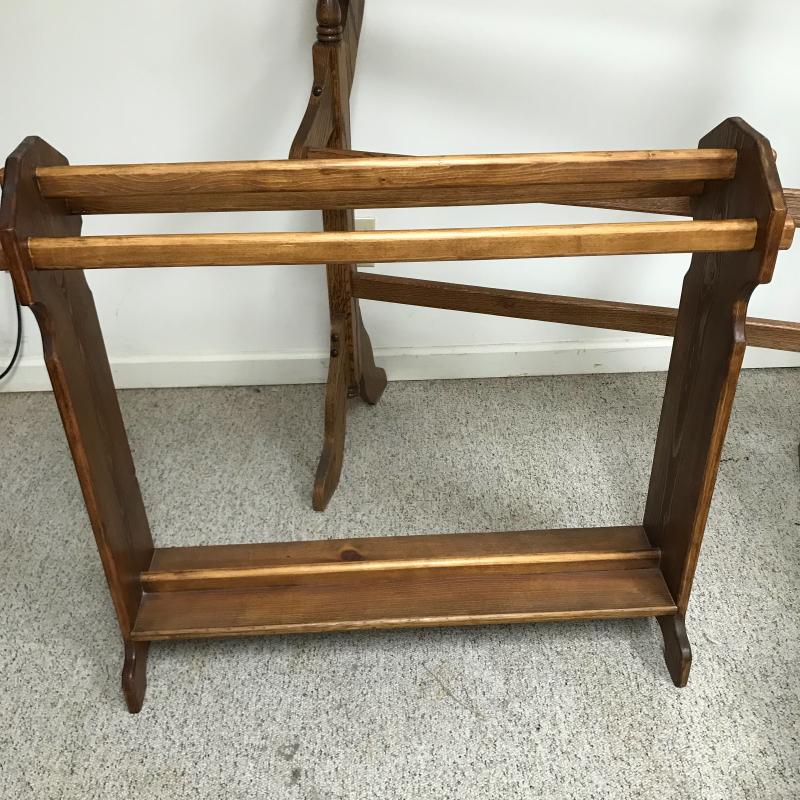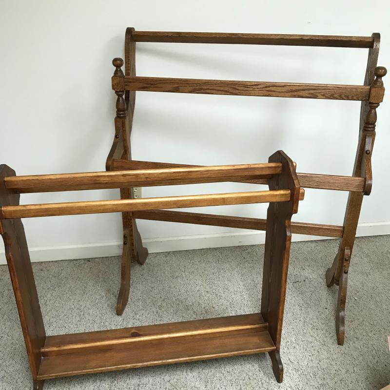 Lot includes two wooden quilt racks. Larger one is approx. 37” x 12” x 44”h. Smaller one is approx. 35” x 9” x 32”h. Both are sturdy and in good condition. Local pickup only.