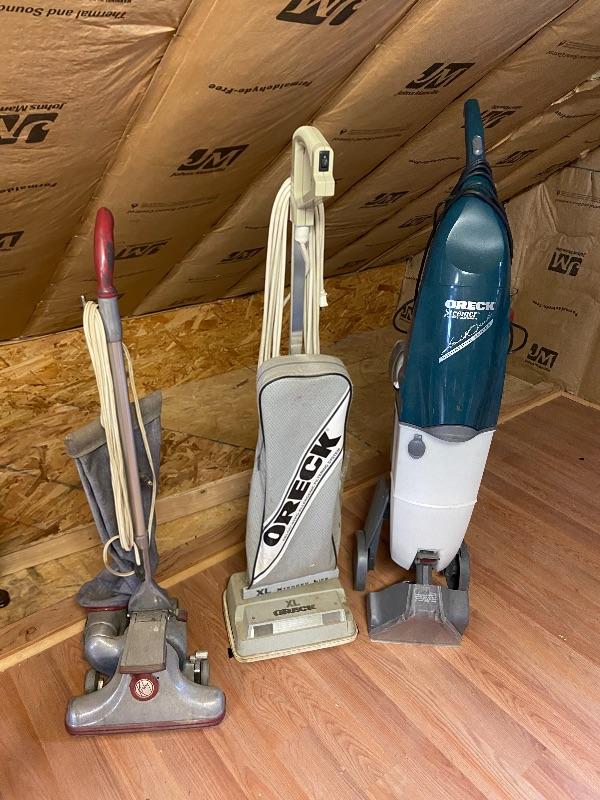 Oreck vacuum cleaner and a carpet cleaner, and a heavy duty vacuum, with none of the attachments. Untested. Bring help to move from second floor.