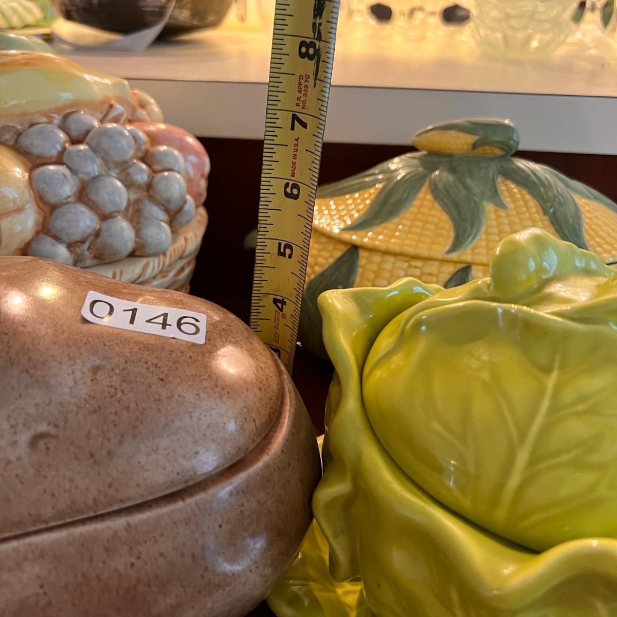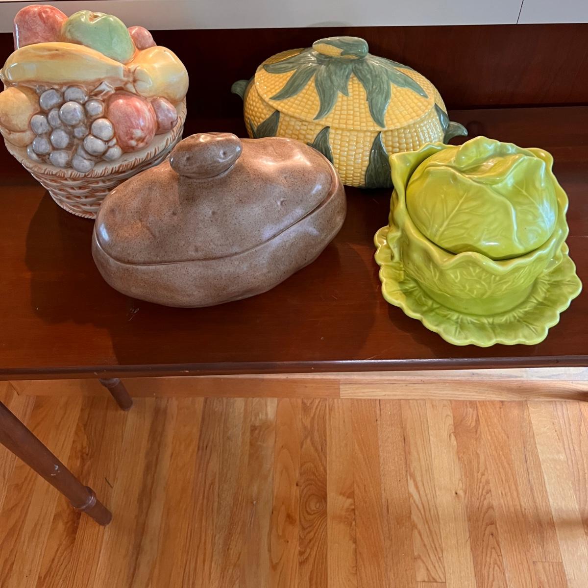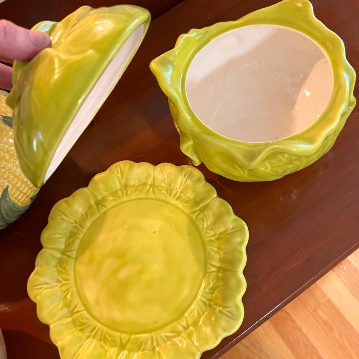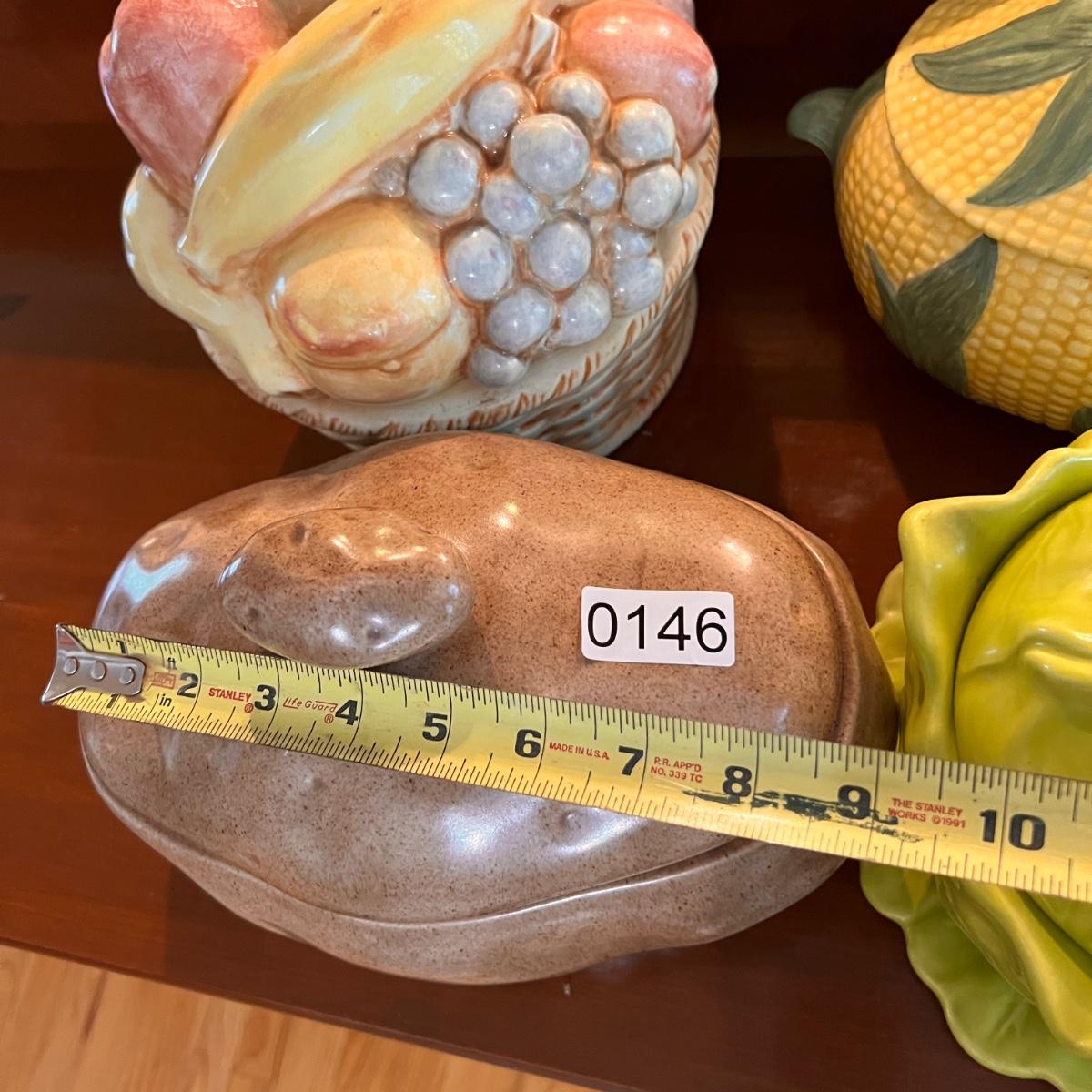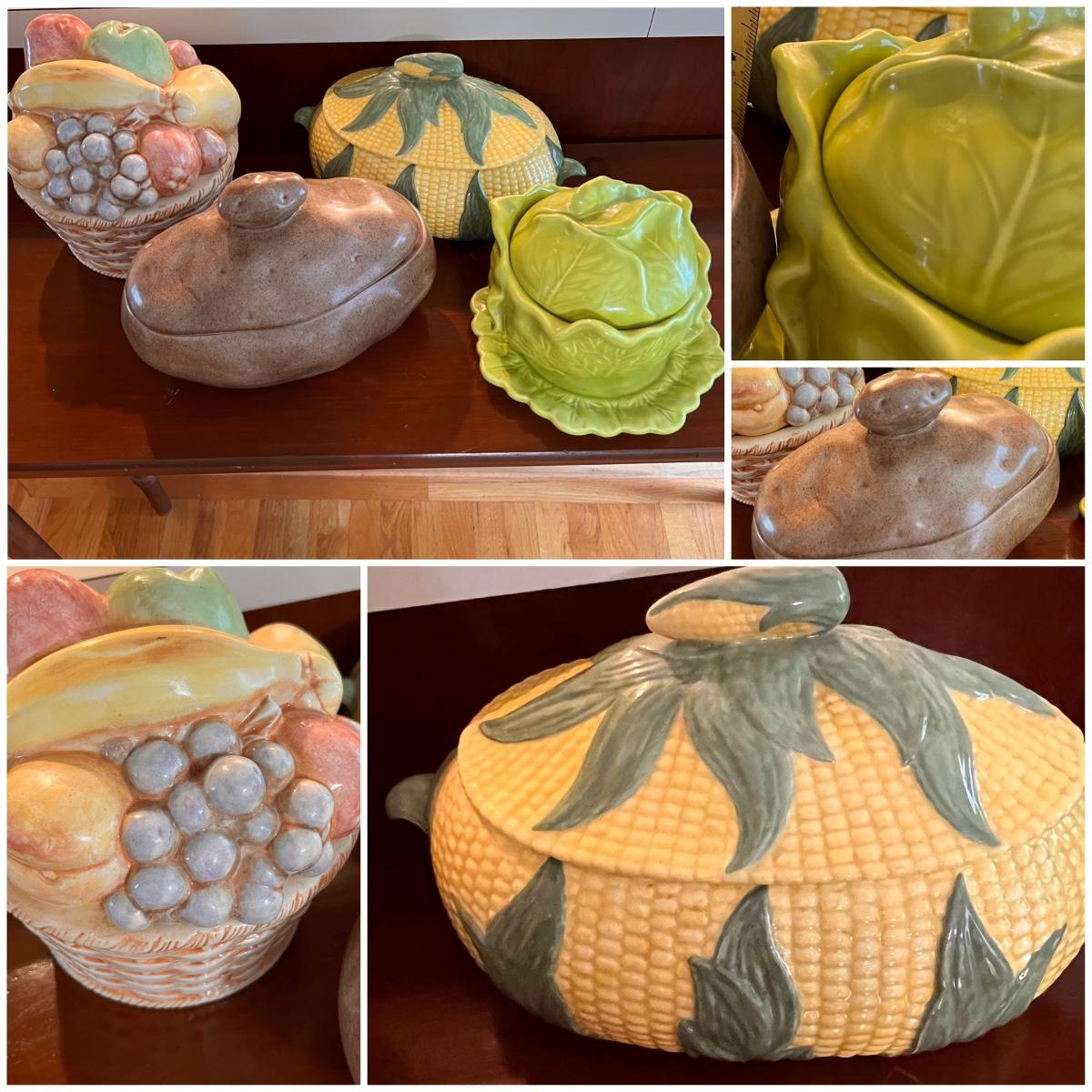 1 lettuce, 1 baked potato, 1 head of lettuce and 1 corn ceramic covered bowls tureens. Lettuce bowl sits on a separate plate. Corn top has small chip on edge.
