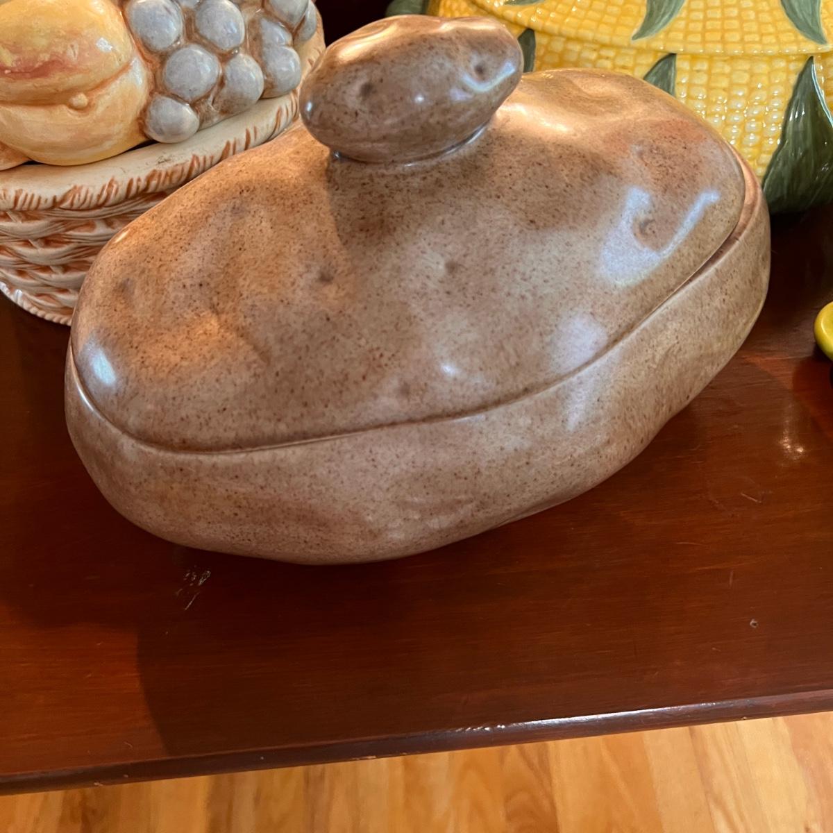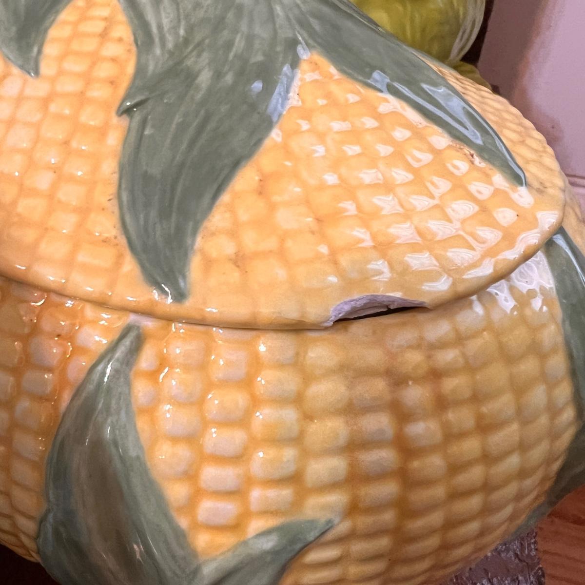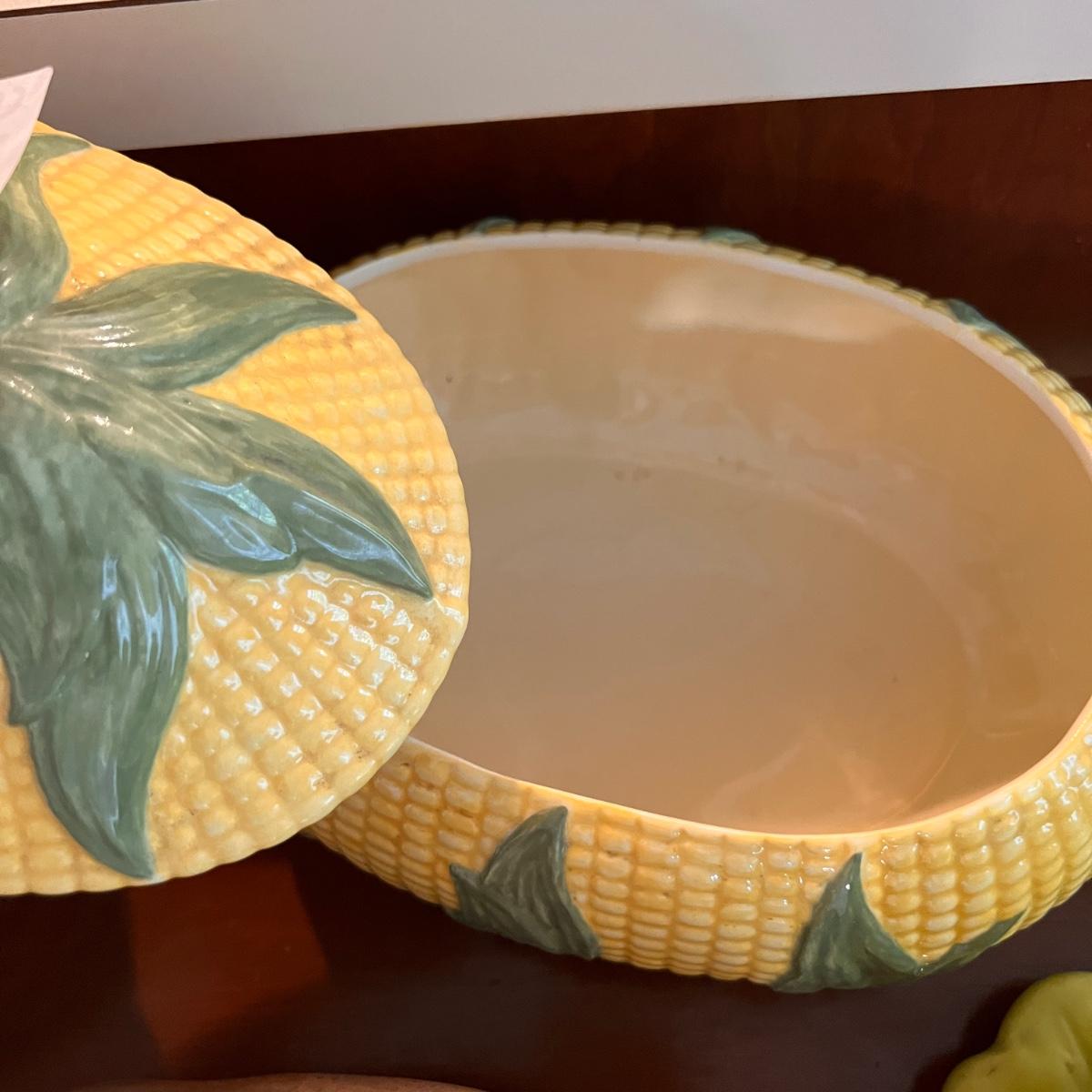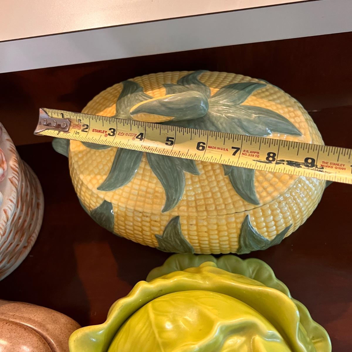 1 lettuce, 1 baked potato, 1 head of lettuce and 1 corn ceramic covered bowls tureens. Lettuce bowl sits on a separate plate. Corn top has small chip on edge.