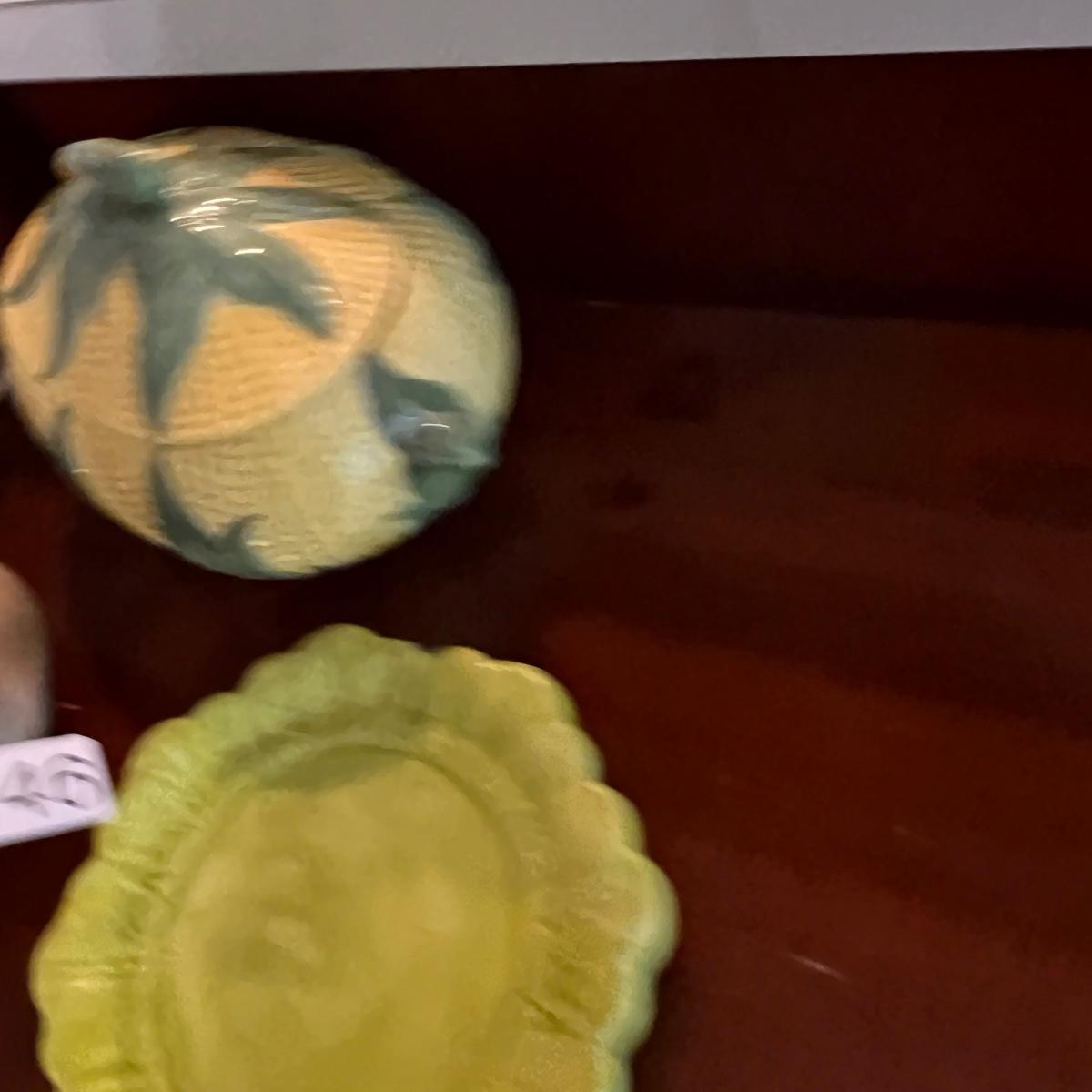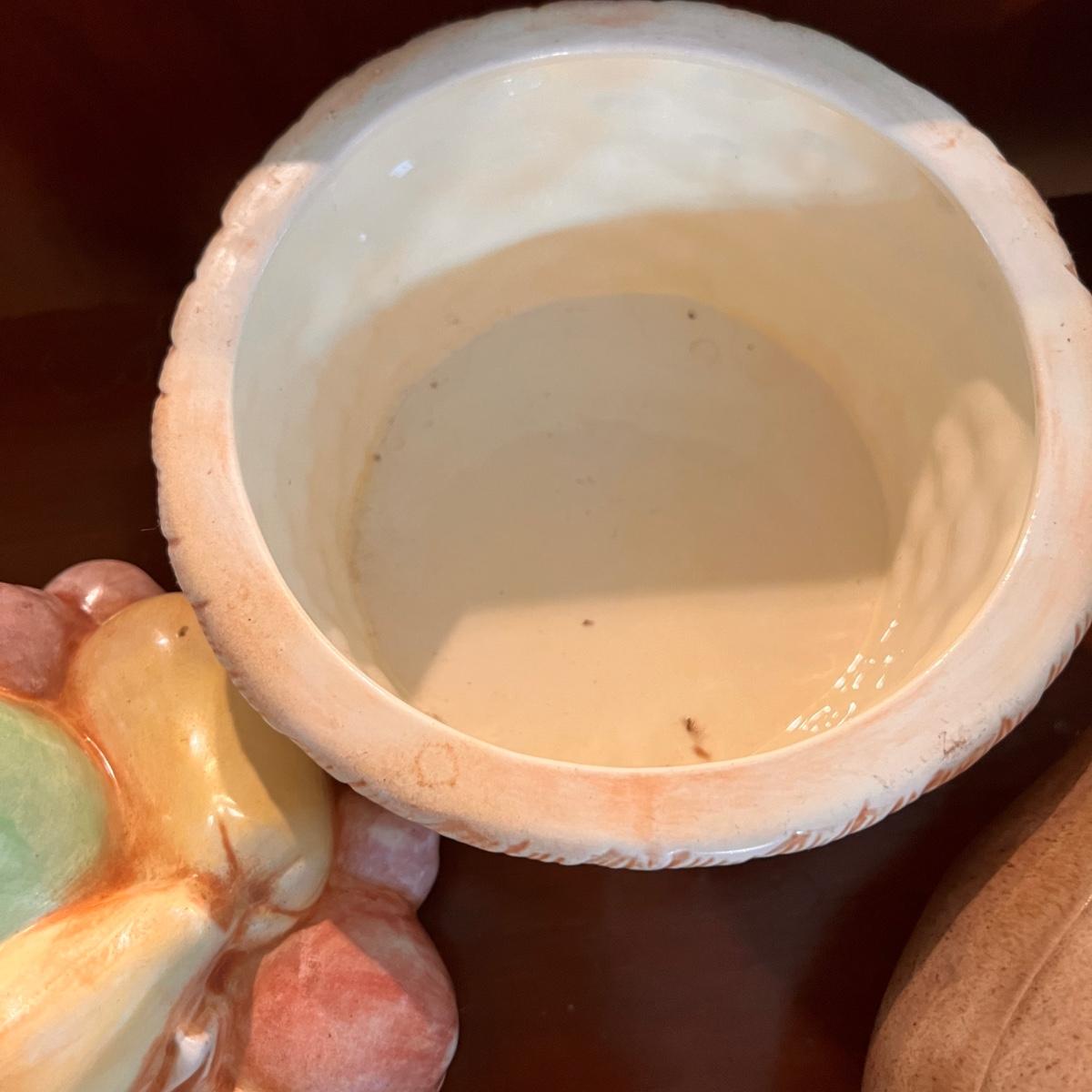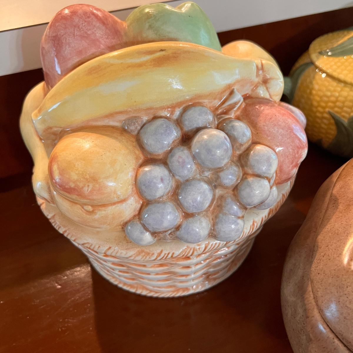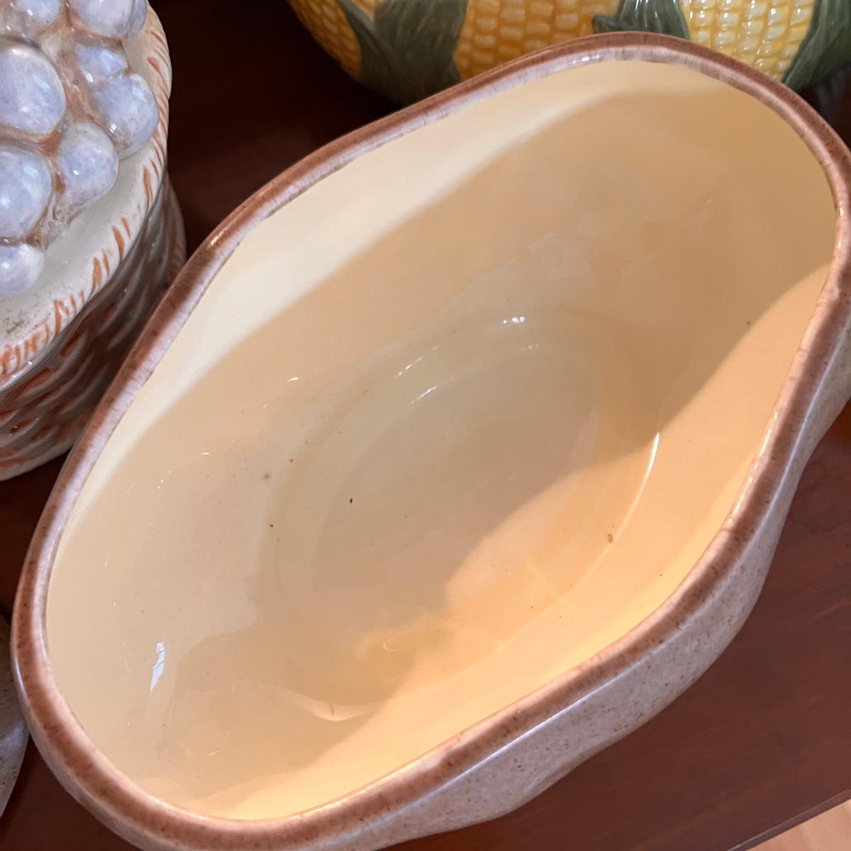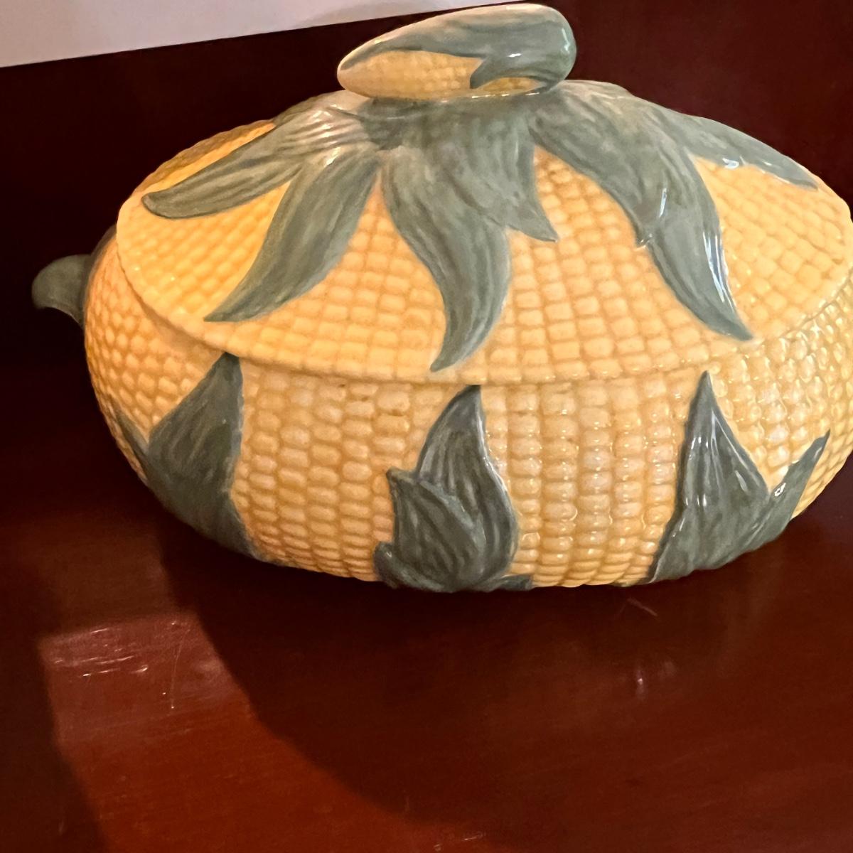 1 lettuce, 1 baked potato, 1 head of lettuce and 1 corn ceramic covered bowls tureens. Lettuce bowl sits on a separate plate. Corn top has small chip on edge.