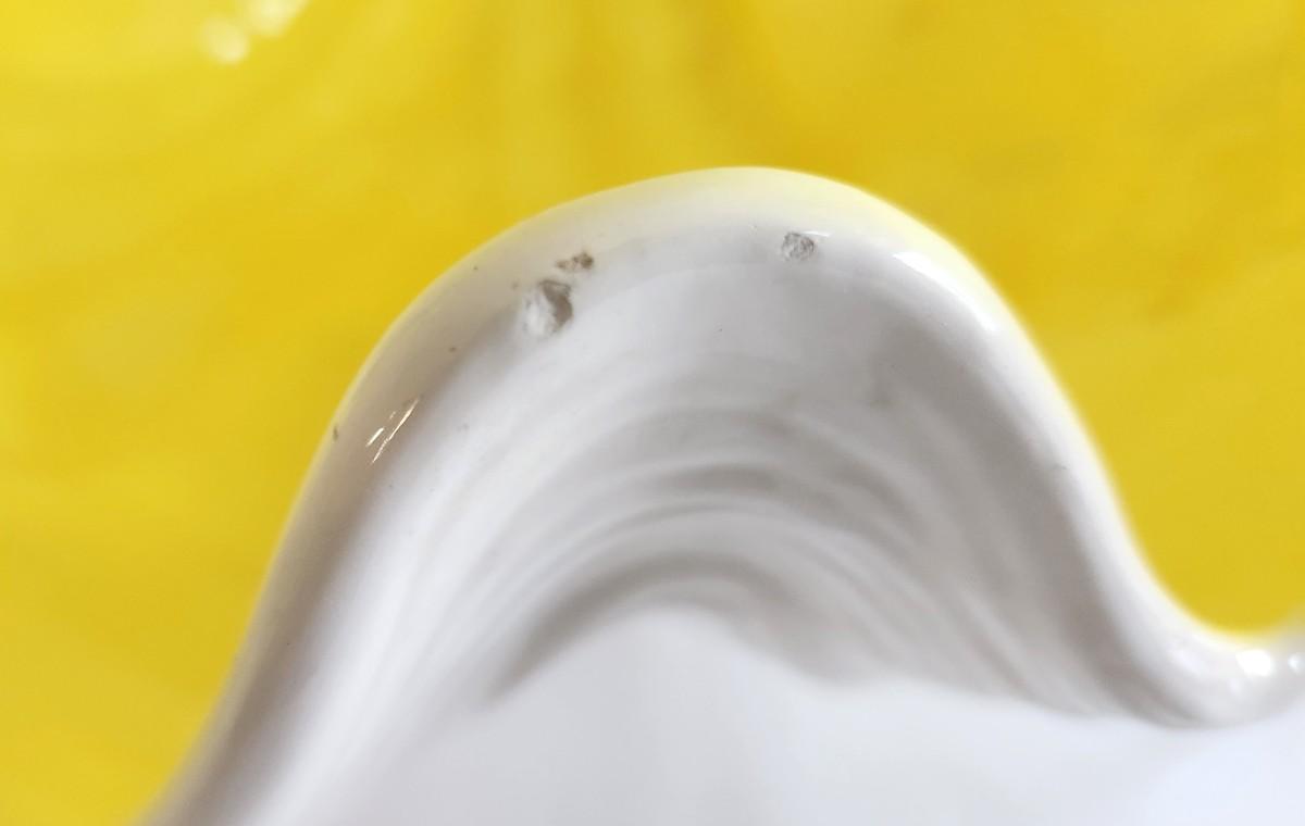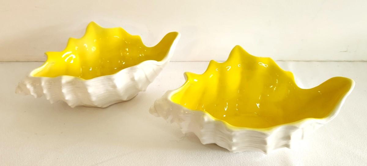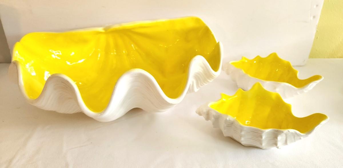 Great 1970's Fitz and Floyd (old mark) ceramic seafood set - large bowl for seafood with two smaller bowl to hold sauces, etc. Note: Large bowl has one small (chigger - pictured) on edge. Hard to see but I wanted to mention it. Large bowl 15" across, smaller 8" across.