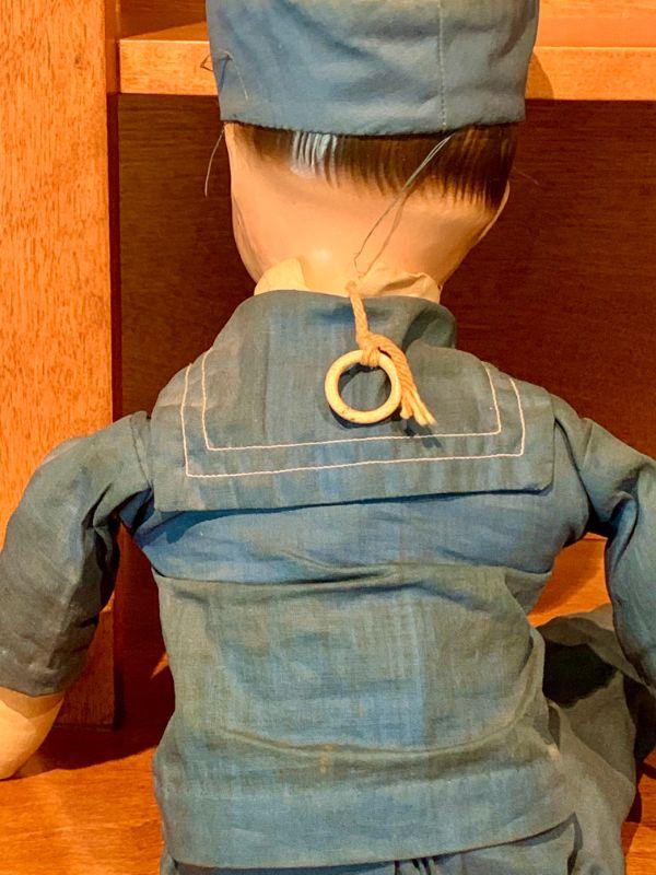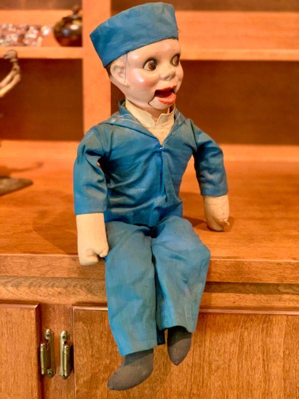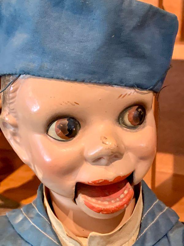 20" tall with a cloth body. Jerry Mahoney dressed as a sailor! Pull ring at the back of the neck moves his mouth. Condition is good for age and use. Clothing shows fading, shoes are missing and the pull ring is fragile. On the top of the head is a chip to the composition.