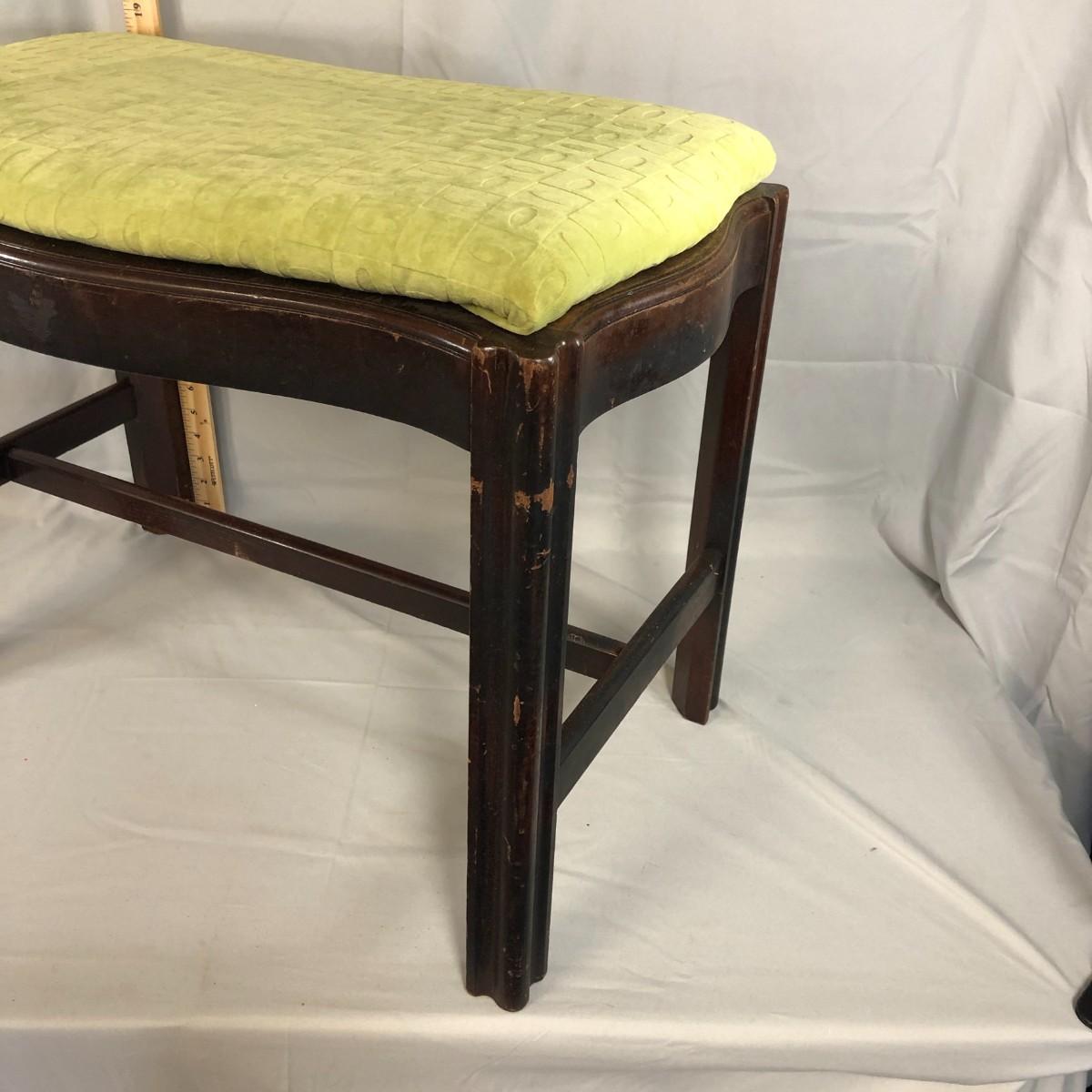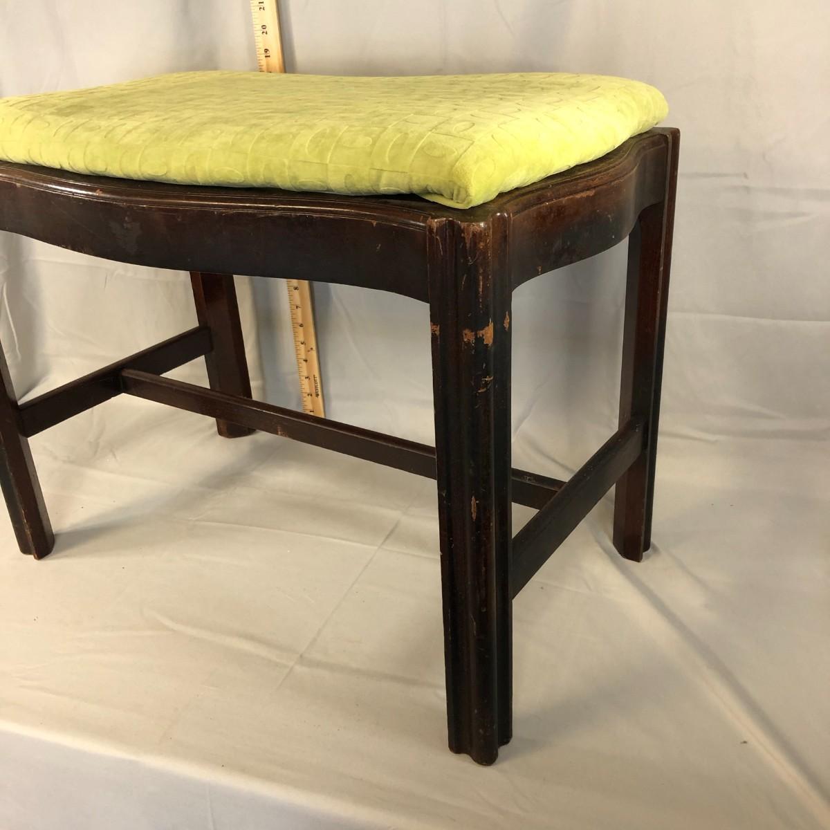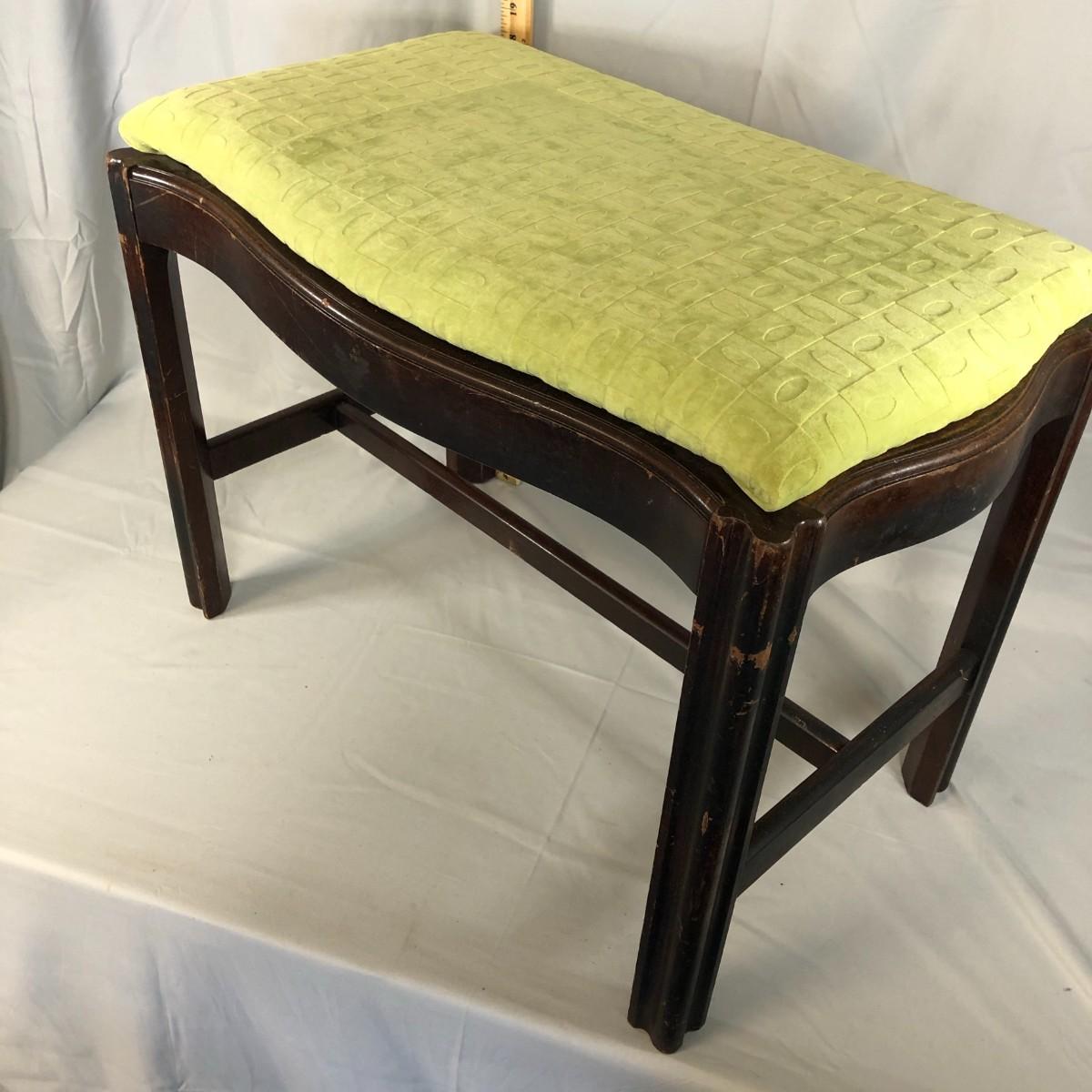 This bench is super solid - no wiggles or damage to be found. The finish has some wear and the lime green fabric can easily be replaced. It has a slight bow on the sides of all of the top to give it a bit of embellishment. It stands about 24" x 14" and about 19" tall.