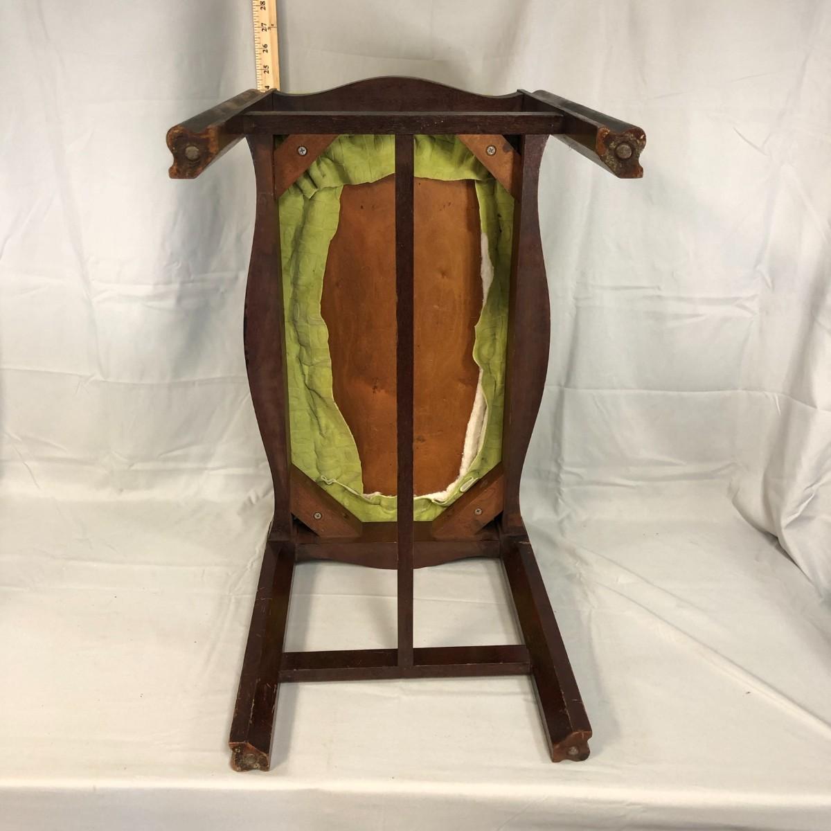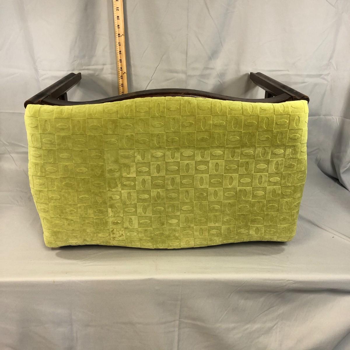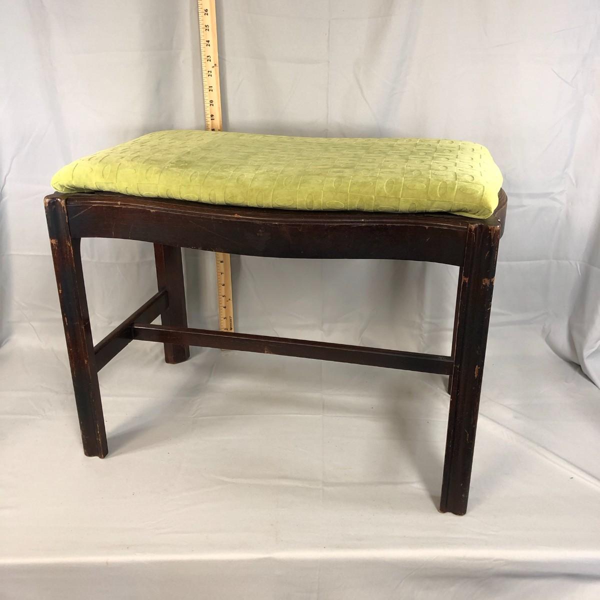 This bench is super solid - no wiggles or damage to be found. The finish has some wear and the lime green fabric can easily be replaced. It has a slight bow on the sides of all of the top to give it a bit of embellishment. It stands about 24" x 14" and about 19" tall.